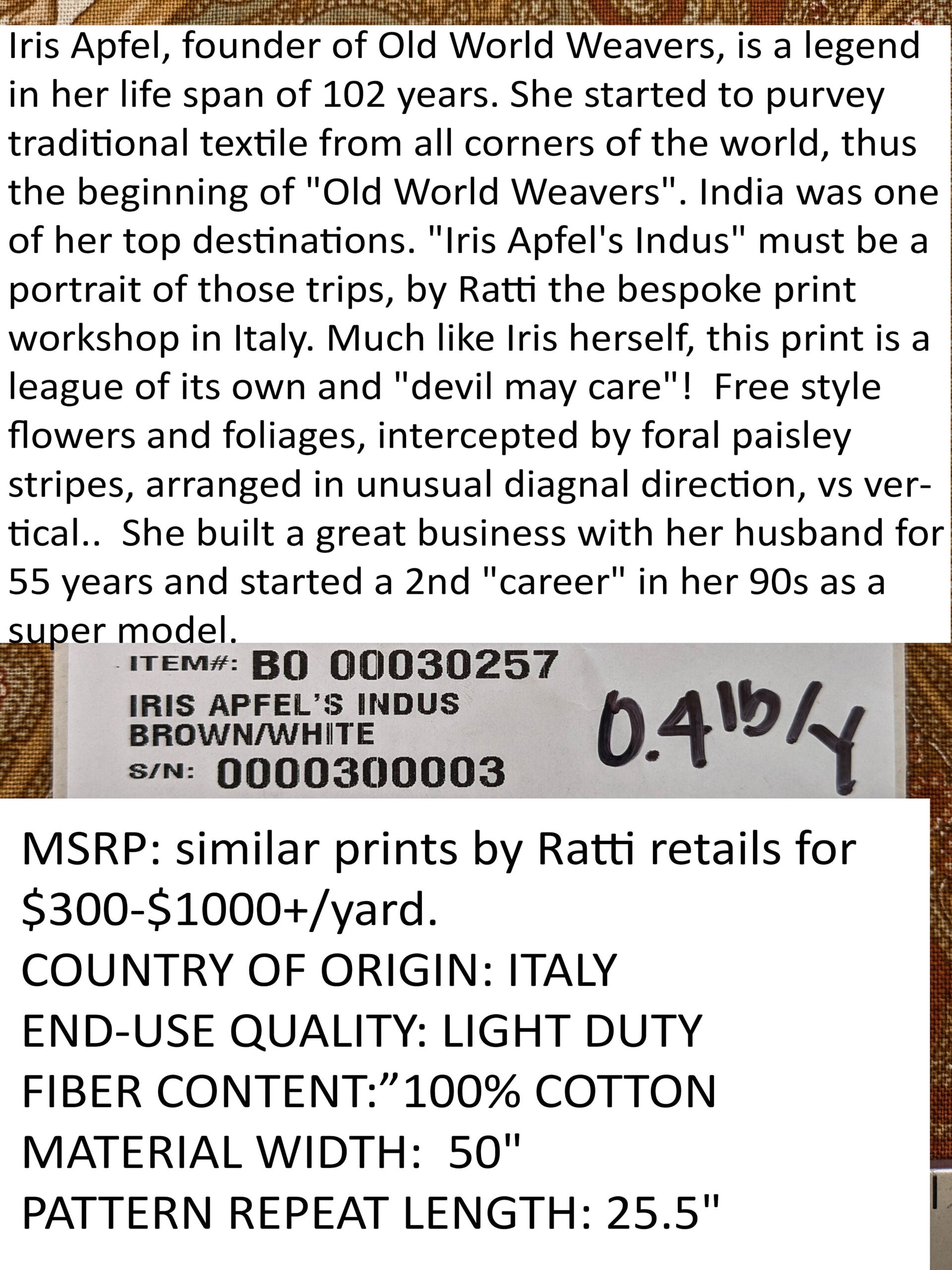 | Iris Apfel, founder of Old World Weavers, is a legend in her life span of 102 years. She started to purvey traditional textile from all corners of the world, thus the beginning of "Old World Weavers". India was one of her top destinations. "Iris Apfel's Indus" must be a portrait of those trips, by Ratti the bespoke print workshop in Italy. Much like Iris herself, this print is a league of its own and "devil may care"! Free style flowers and foliages, intercepted by foral paisley stripes, arranged in unusual diagnal direction, vs vertical.. She built a great business with her husband for 55 years and started a 2nd "career" in her 90s as a super model. https://silkresource.com/store/founder-of-old-world-weavers-design-doyenne-iris-apfel-has-died-at-102/ |
