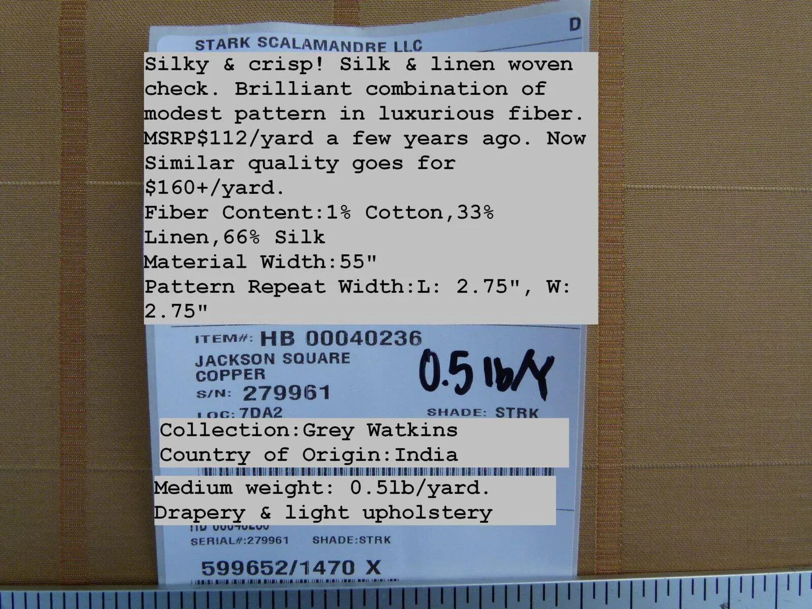 MSRP$112/yard a few years ago. Now Similar quality goes for $160+/yard. Medium weight: 0.5lb/yard. Application:Drapery & light upholstery |