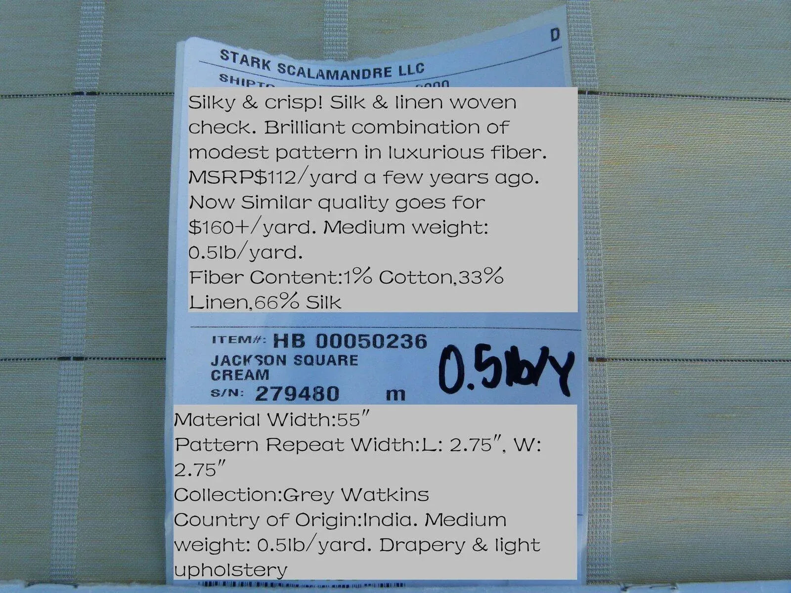 MSRP$112/yard a few years ago. Now Similar quality goes for $160+/yard. Medium weight: 0.5lb/yard. Application:Drapery & light upholstery |