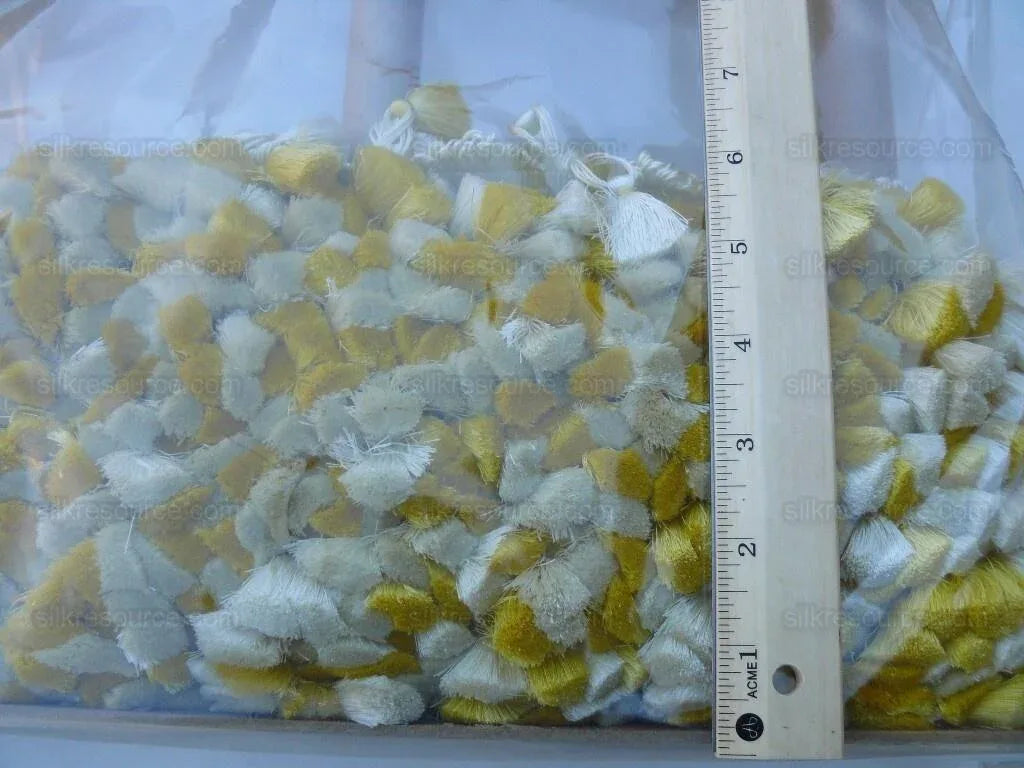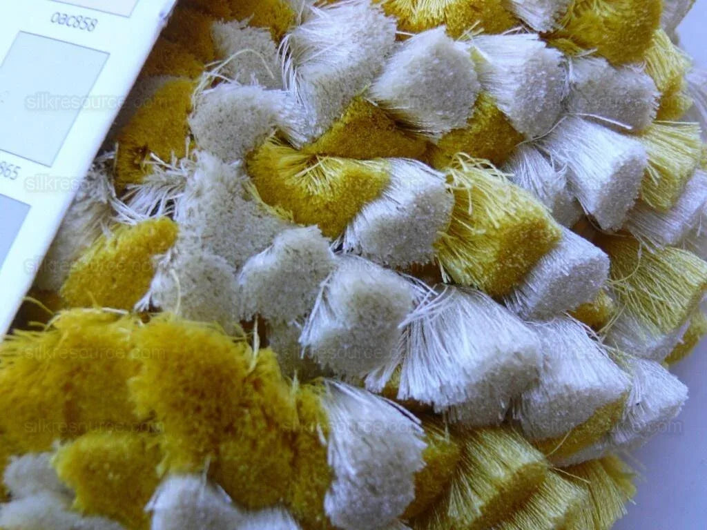 Most luxurious hand-made tassel fringe in 100% silk! Incredibly soft and saturated. It takes skilled artisan hours to craft a few yards. Designer: Scalamandre Name: "Jules Verne", sku: FT44-21, Tassel Fringe 100% Silk Color: GOLD, WHITE Approx Width: 2.5 ", MSRP USD 187.80/Yard a few years ago. Now similar silk trim goes for $200+/yard.
