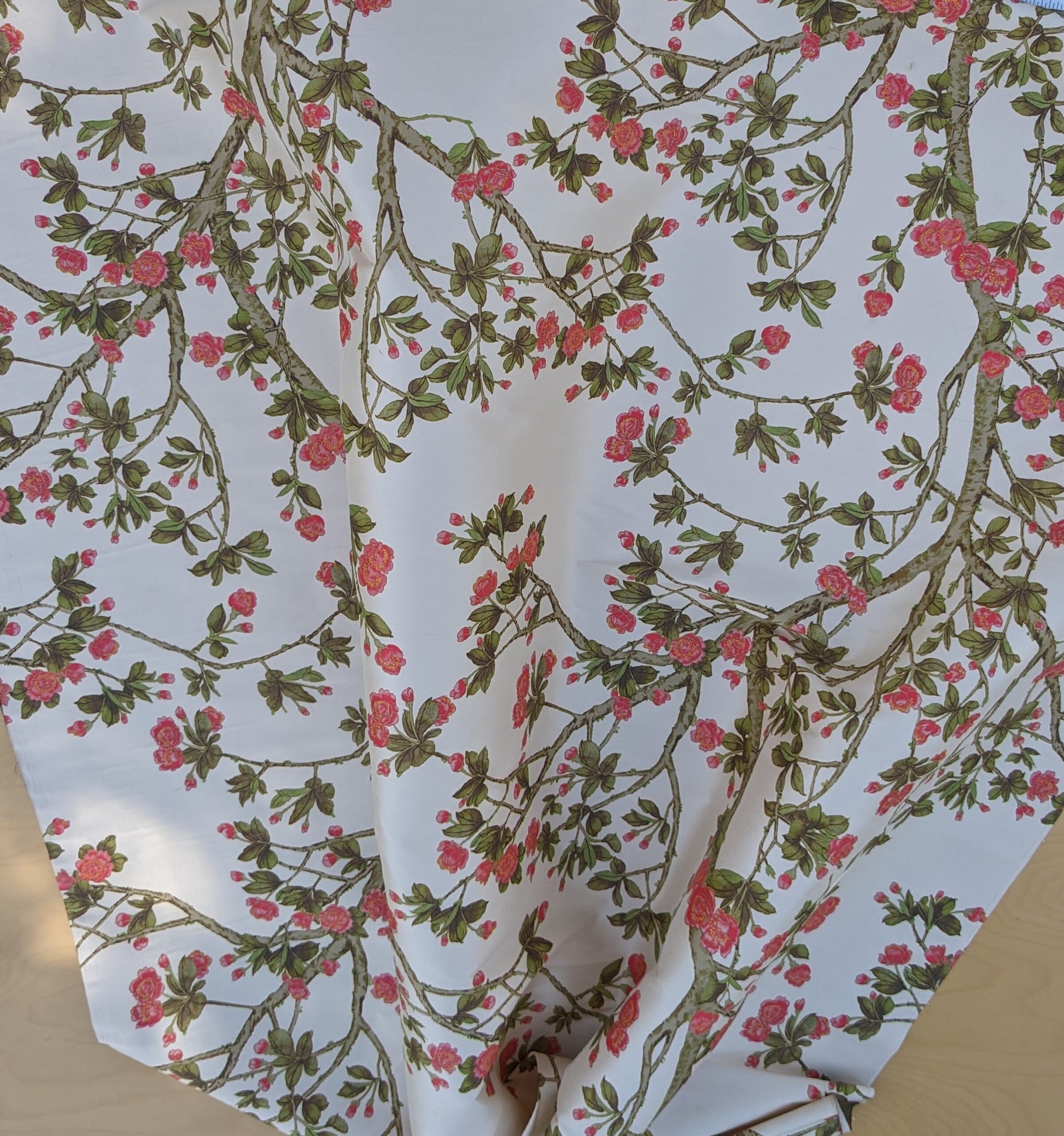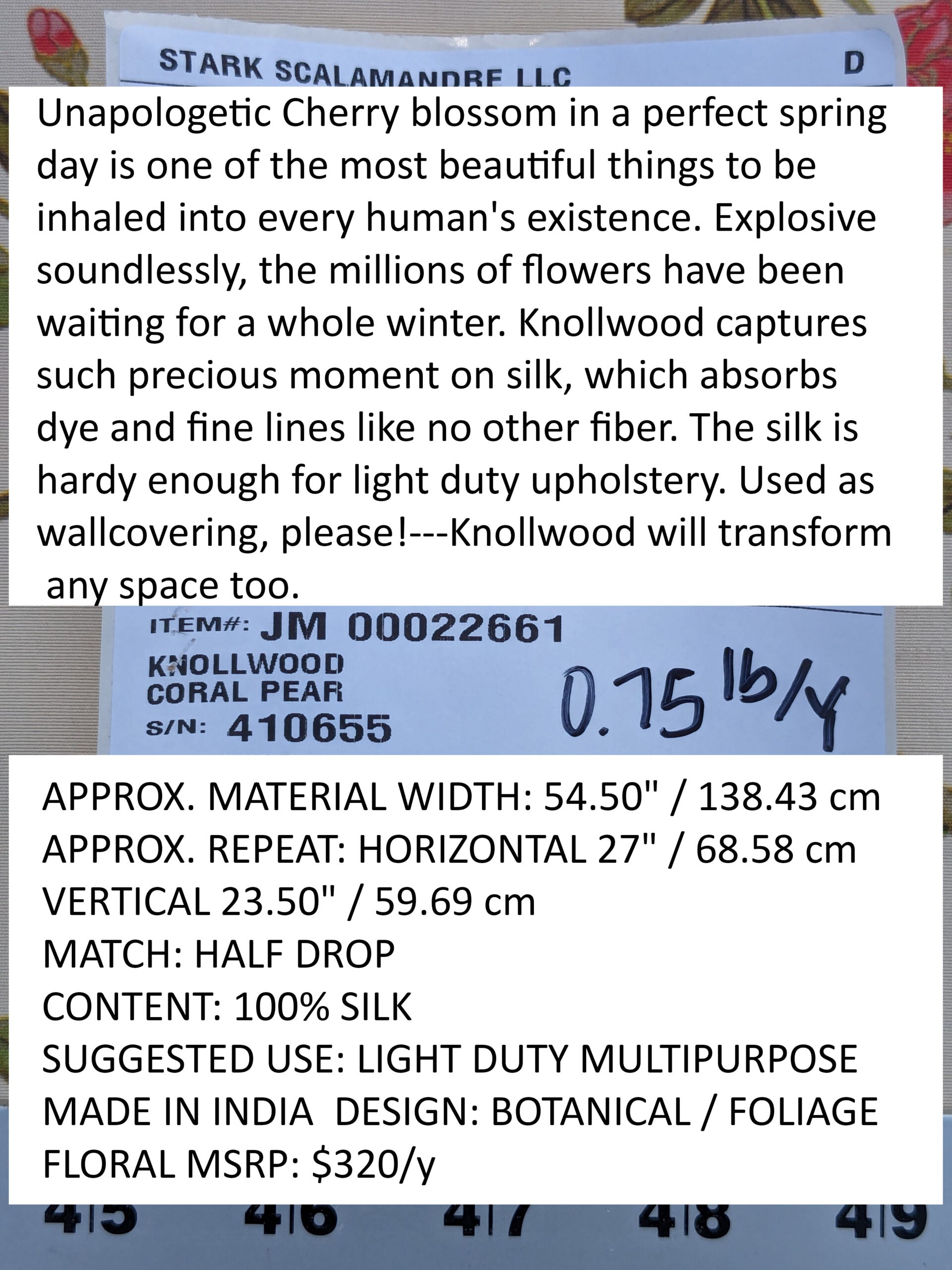 Scalamandre KNOLLWOOD CORAL PEAR Silk Print Cherry Blossom Tree in Spring Pink Green by Old World Weavers MSRP USD320/y