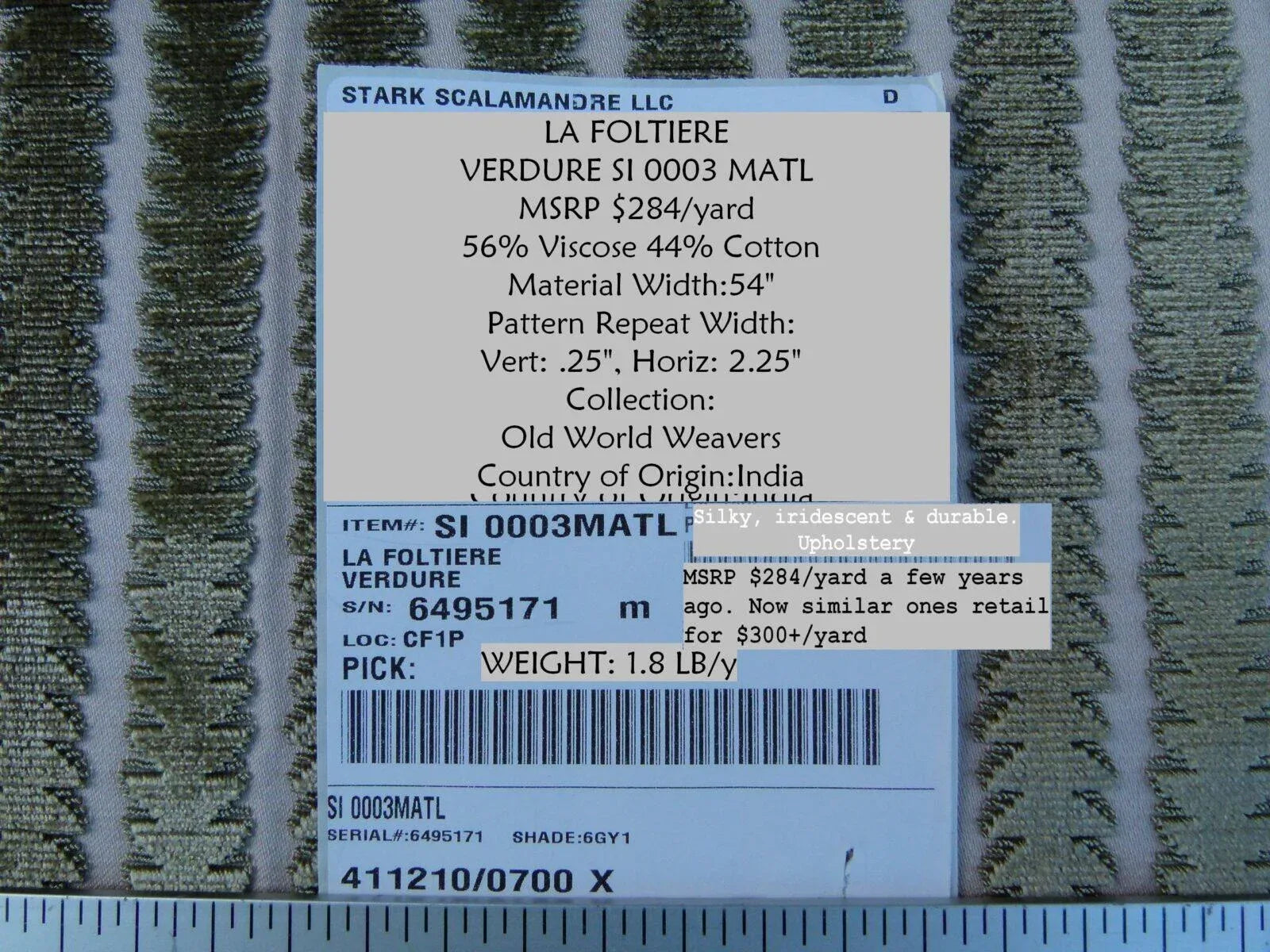 Fiber, repeat, width, weight, country of origin, retail price/yard: Please see text in photos.