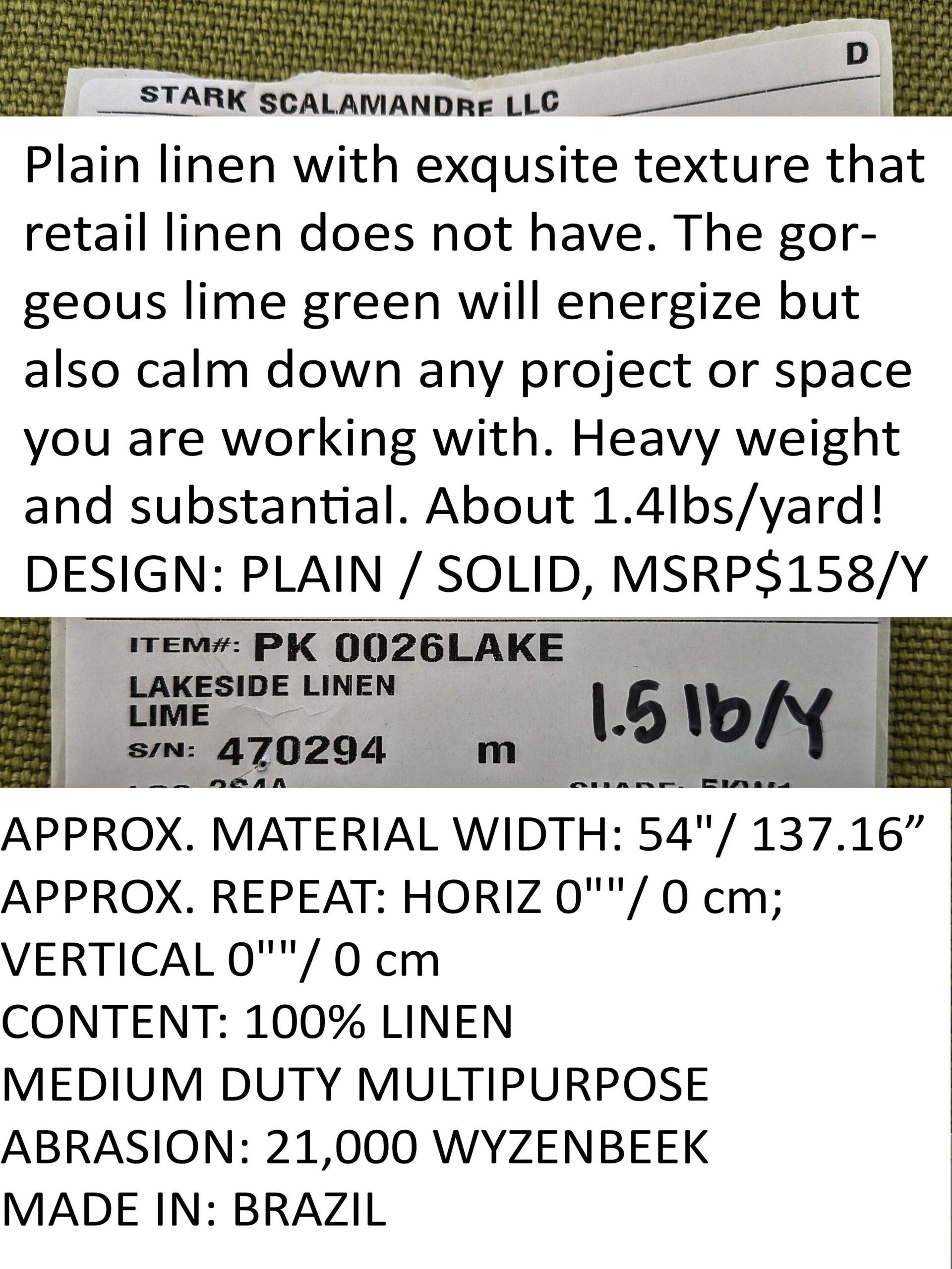 | Plain linen with exquisite texture that retail linen does not have. The gorgeous lime green will energize but also calm down any project or space you are working with. Heavy weight and substantial. About 1.4lbs/yard! |