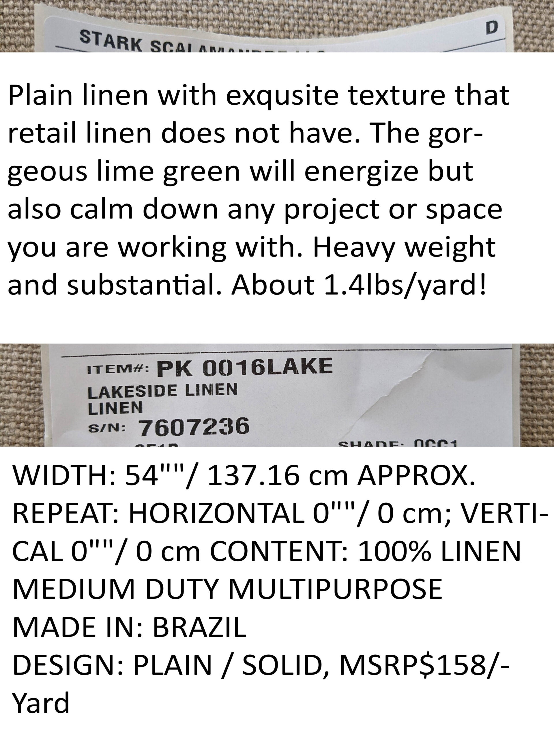 | Plain linen with exquisite texture that retail linen does not have. The gorgeous lime green will energize but also calm down any project or space you are working with. Heavy weight and substantial. About 1.4lbs/yard! |