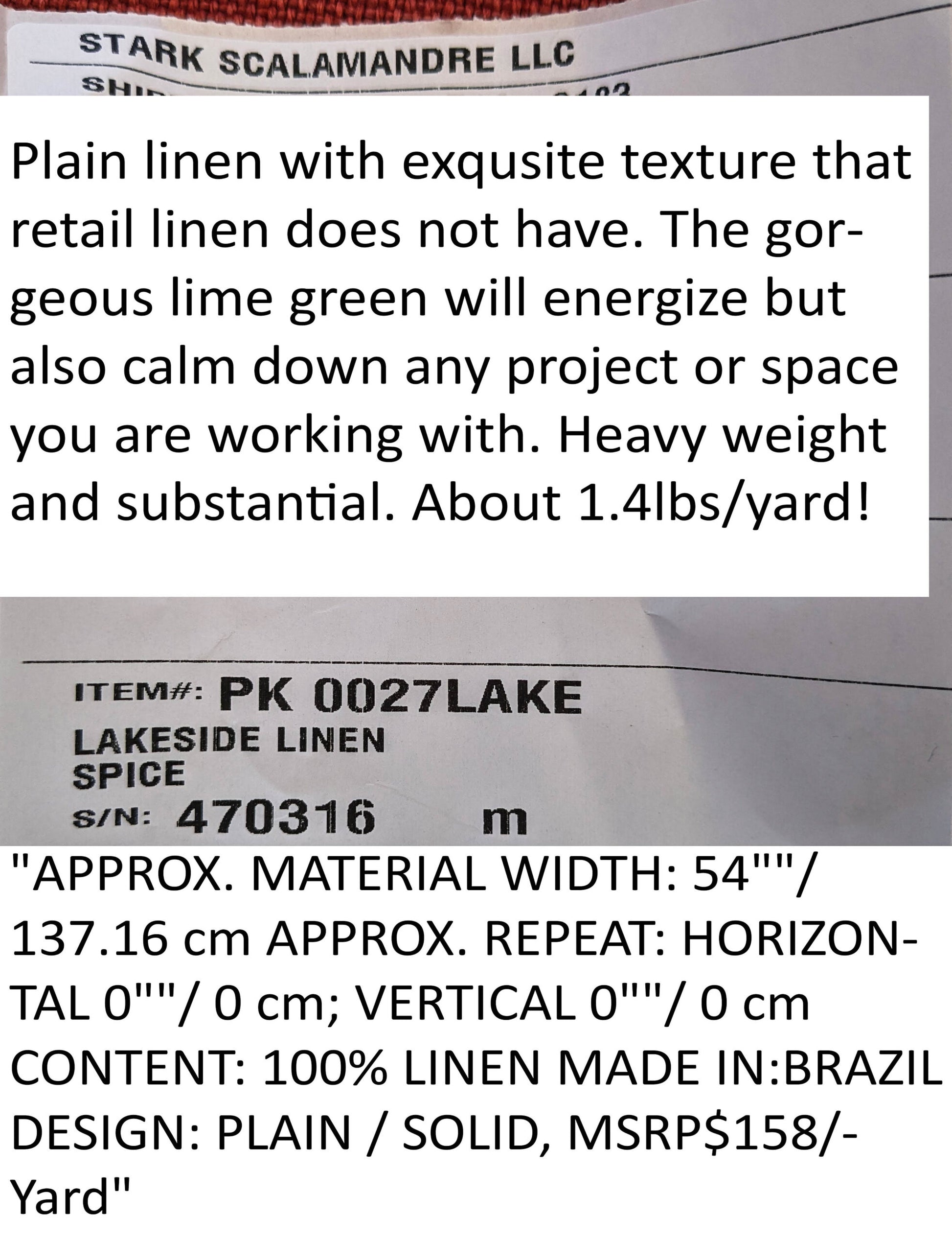 | Plain linen with exquisite texture that retail linen does not have. The gorgeous lime green will energize but also calm down any project or space you are working with. Heavy weight and substantial. About 1.4lbs/yard! |