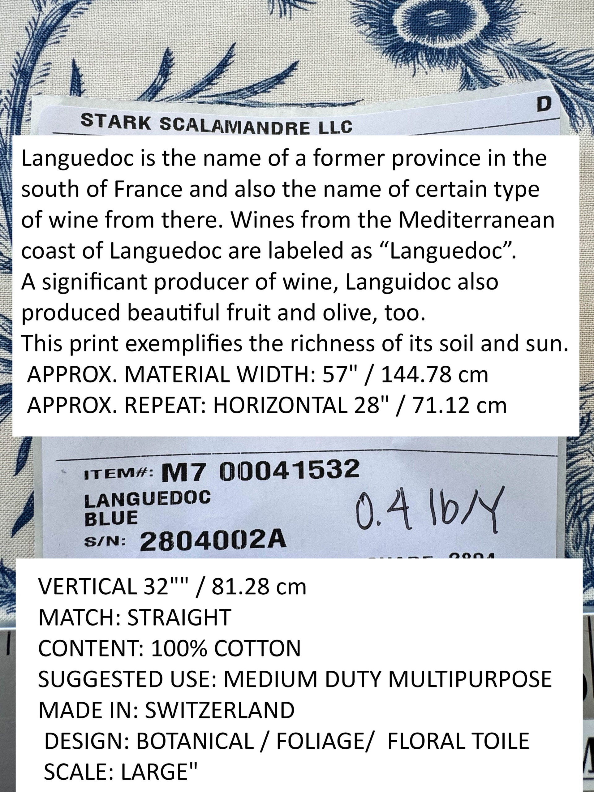 | APPROX. MATERIAL WIDTH: 57" / 144.78 cm APPROX. REPEAT: HORIZONTAL 28" / 71.12 cm; VERTICAL 32" / 81.28 cm MATCH: STRAIGHT CONTENT: 100% COTTON SUGGESTED USE: MEDIUM DUTY MULTIPURPOSE MADE IN: SWITZERLAND DESIGN: BOTANICAL / FOLIAGE/ FLORAL / TOILE SCALE: LARGE |