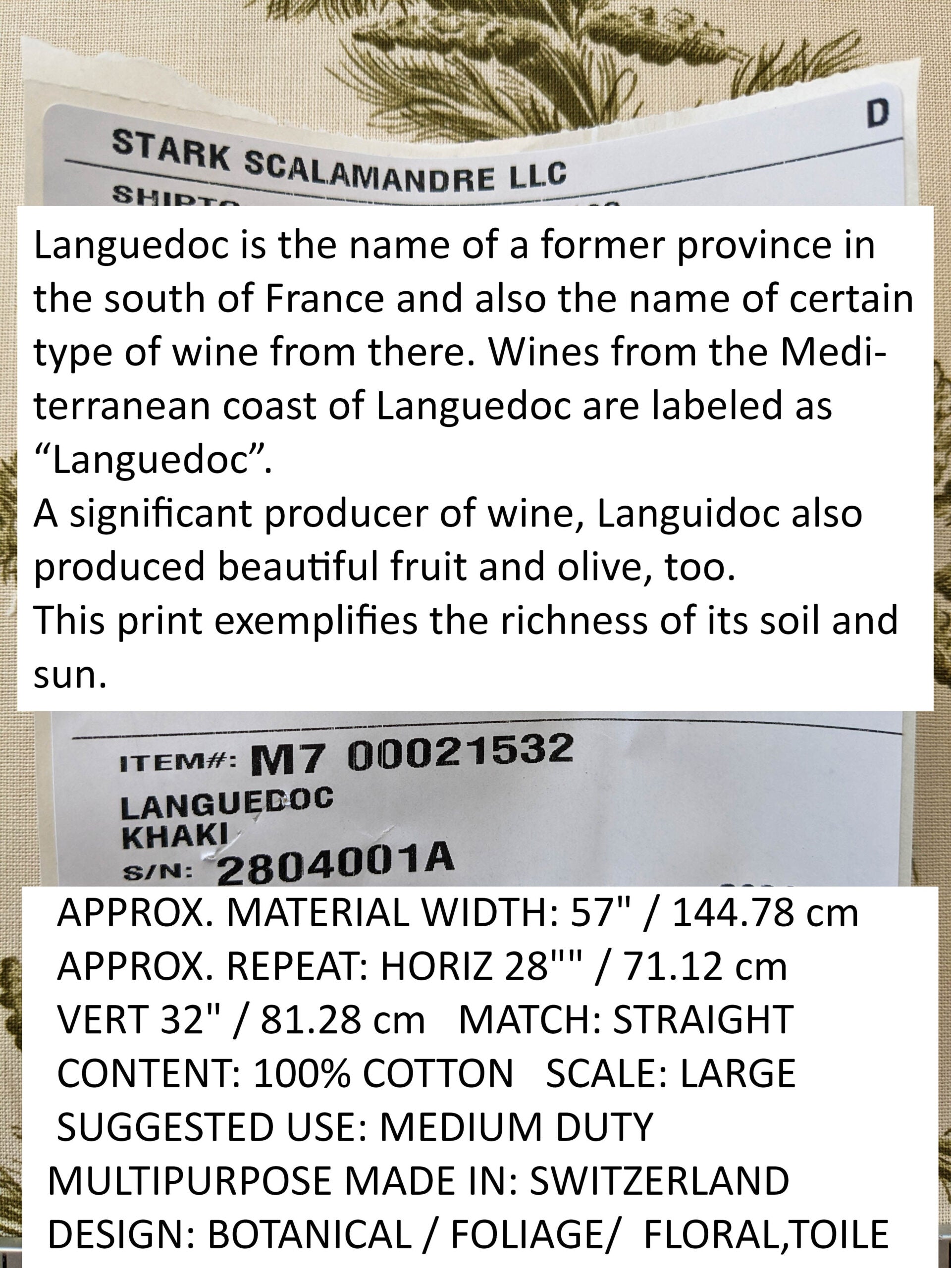 | APPROX. MATERIAL WIDTH: 57" / 144.78 cm APPROX. REPEAT: HORIZONTAL 28" / 71.12 cm; VERTICAL 32" / 81.28 cm MATCH: STRAIGHT CONTENT: 100% COTTON SUGGESTED USE: MEDIUM DUTY MULTIPURPOSE MADE IN: SWITZERLAND DESIGN: BOTANICAL / FOLIAGE/ FLORAL / TOILE SCALE: LARGE |