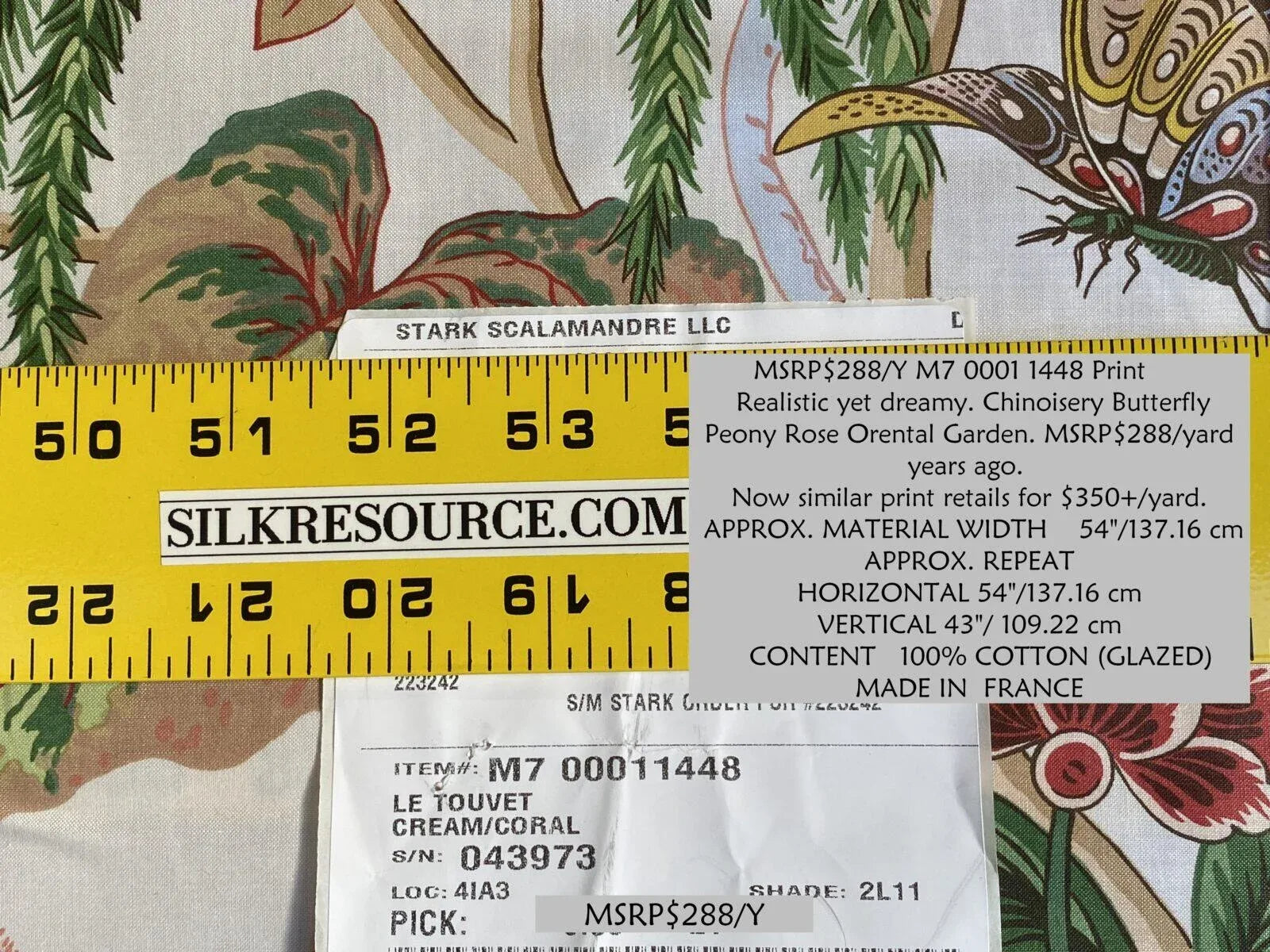 All details (pattern name, colorway, content, repeat, width, durability, retail price, country of origin): Please see text in photo.