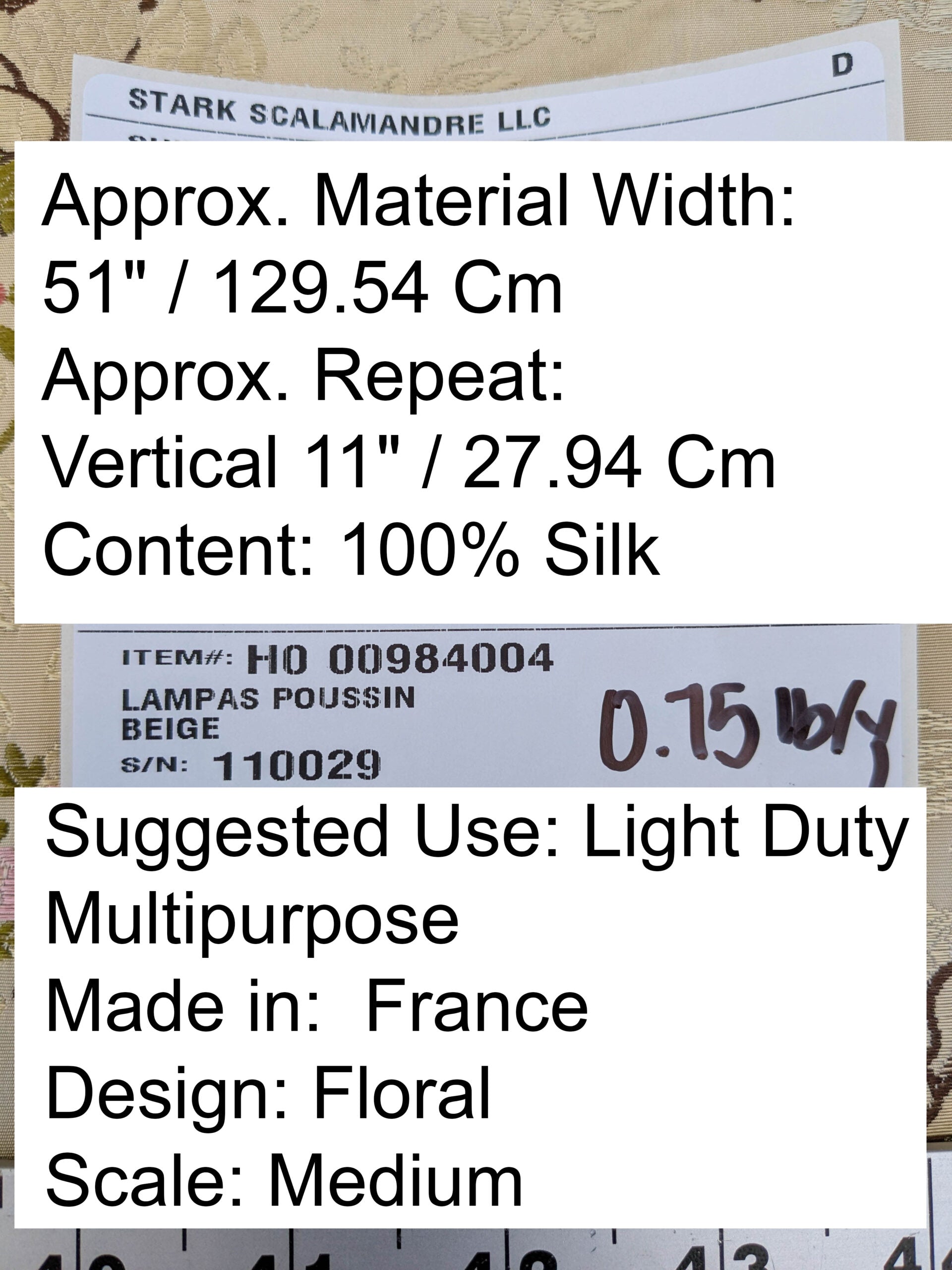 L A M P A S P O U S S I N BEIGE • H0 0098 4004 Lampases from the Style Collection by LelievreDecadent yet innocent...is the impossible silk lampas from France. Woven in one of the oldest silk mills on the planet, Lampas Poussin dotted the pebble stoned pathway with pink roses, green foliage yellow daisies and a miniature palm . The bright blue highlight is so delicious.Weight: Heavy. About 0.75lb/yard. This is exceptional for 100% silk.Approx. Material Width: 51" / 129.54 Cm Approx. Repeat: Vertical 11" / 27.94 Cm Content: 100% Silk Suggested Use: Light Duty Multipurpose Made in: France Design: Floral Scale: Medium Weight: 0.75lb/y |