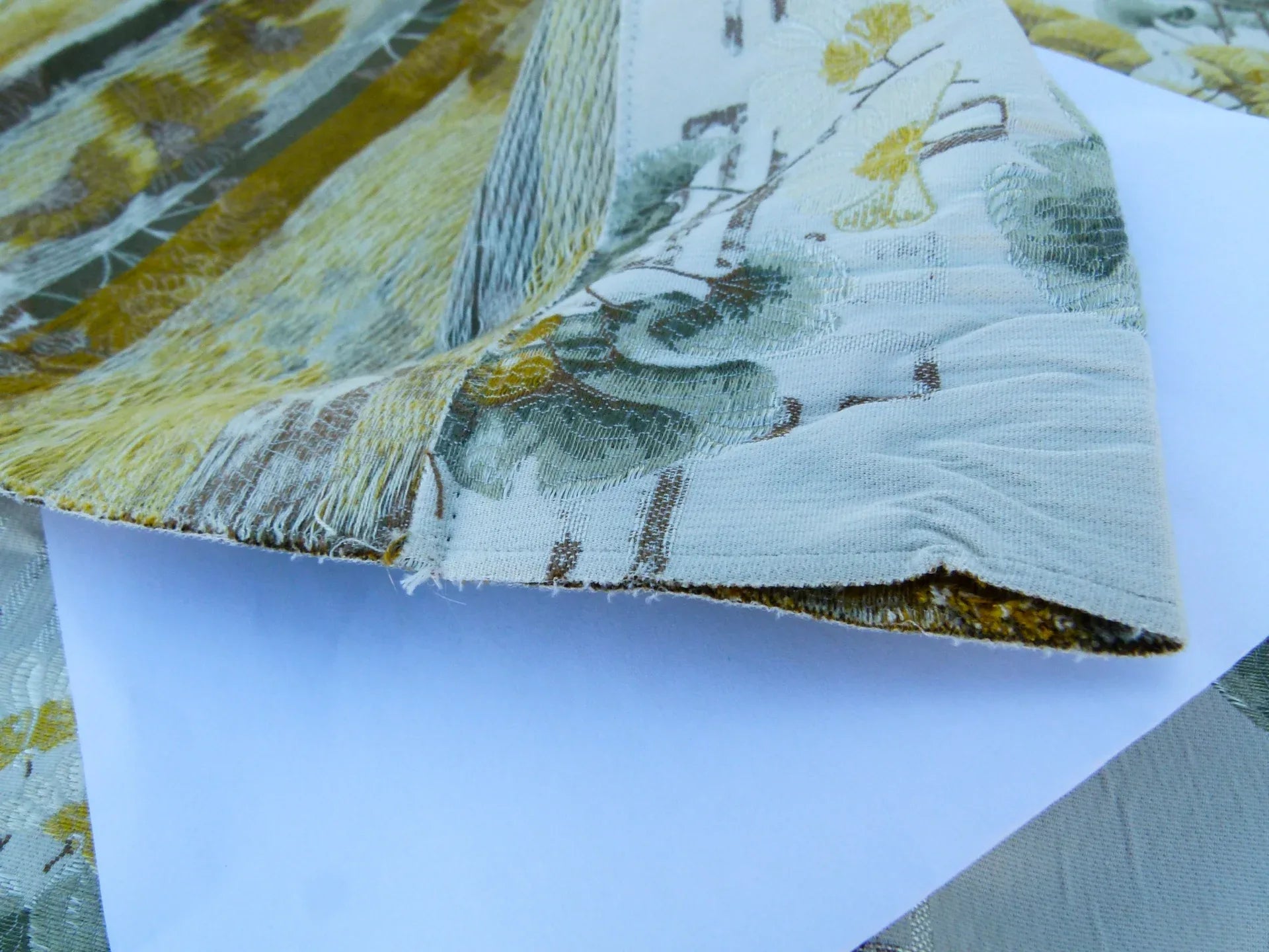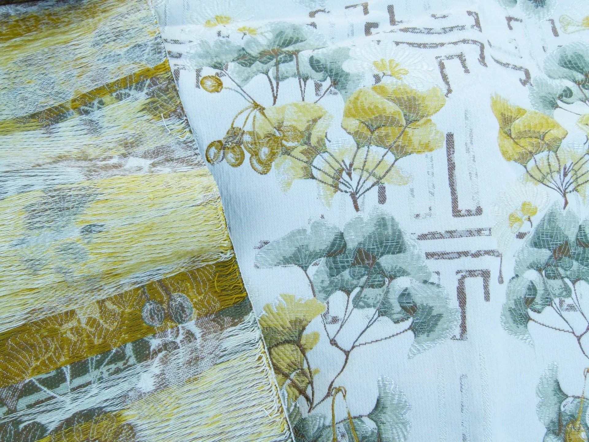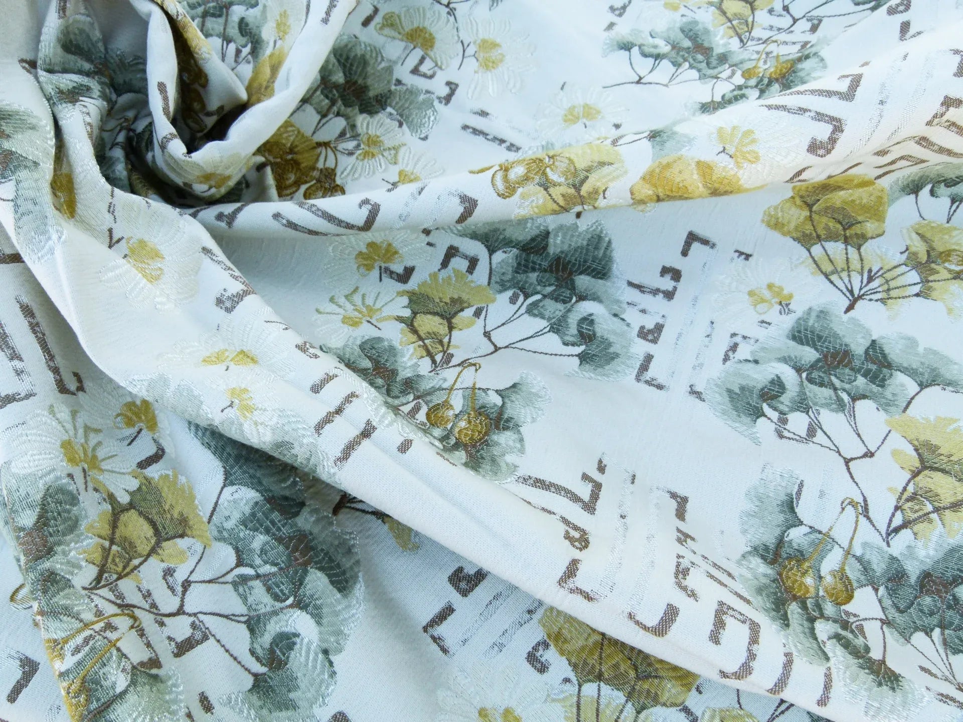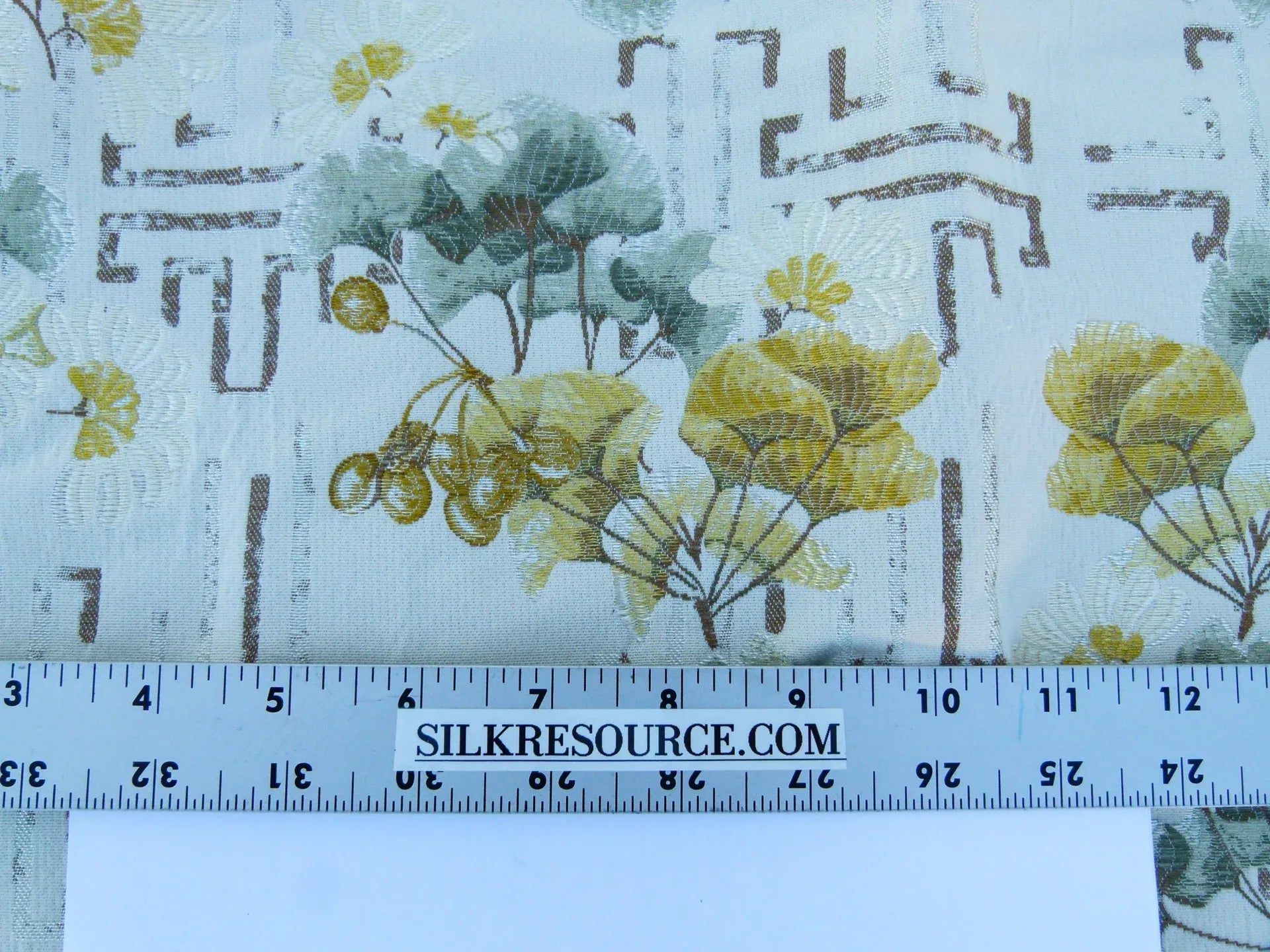 Plant native to China, with its fan-shaped leaves it has ancient origins enough to be considered a living fossil. In this lampas the leaves are fresh and bright, layed upon pastel colour grounds characterized by a Chinese geometric grid with glossy and matte effects. Lampas in five colors suitable for upholstery and drapery projects. Coordinates with Ginkgo Coordinato and Ginkgo Coordinato - Vinyl Wallcovering.