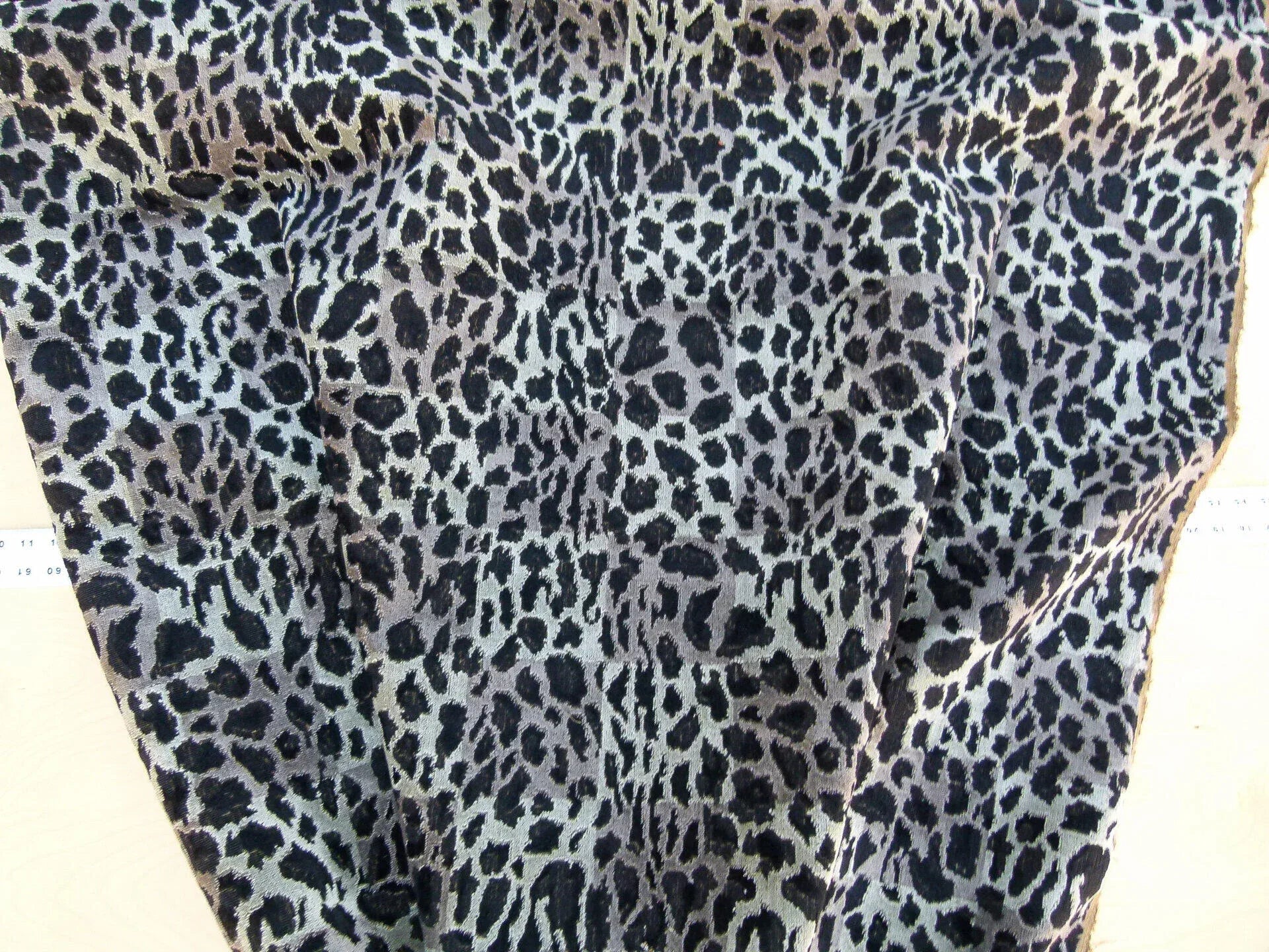 Incredible weight at over 2lbs/yard, it is thick and lush as a carpet. This linen velvet is super crisp and durable. Various shapes of leopard skin arranged in a collage of squares.
