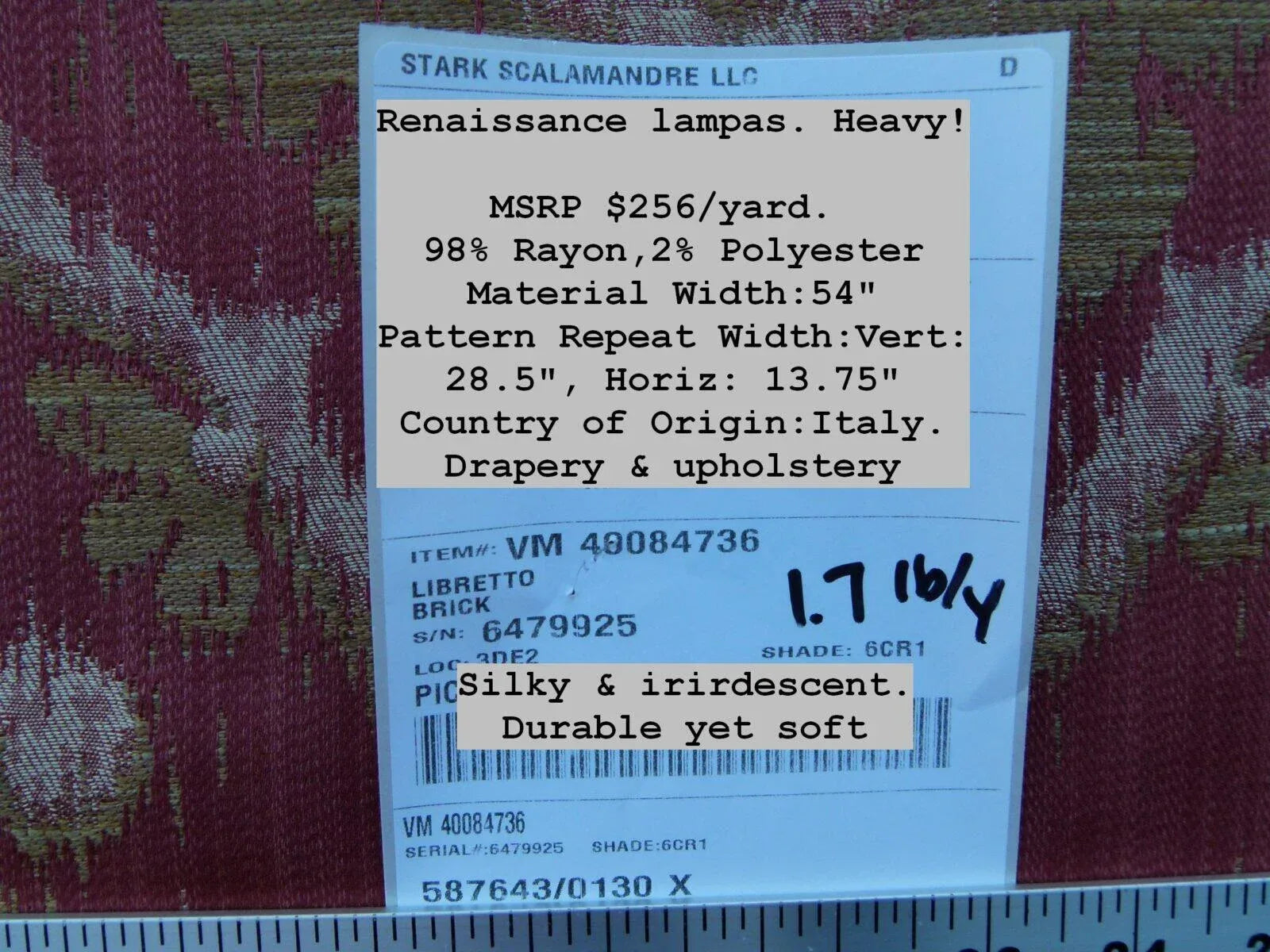Fiber, repeat, width, weight, country of origin, retail price/yard: