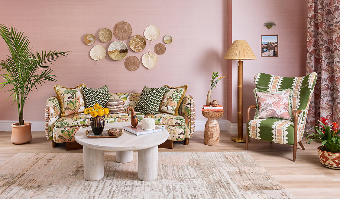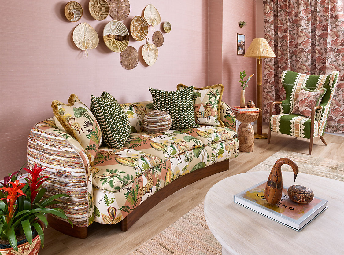 Playful llamas splashed with colorful pattern roam amongst abstract greenery and rolling hills, adding a dash of maximalist whimsy anywhere you place it. Available in three exuberant colorways, Llamas enchants in both children’s and adult spaces.