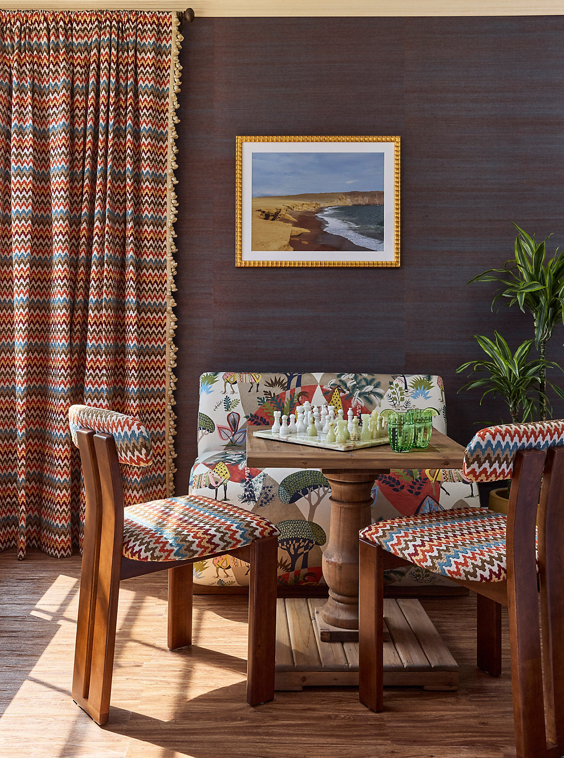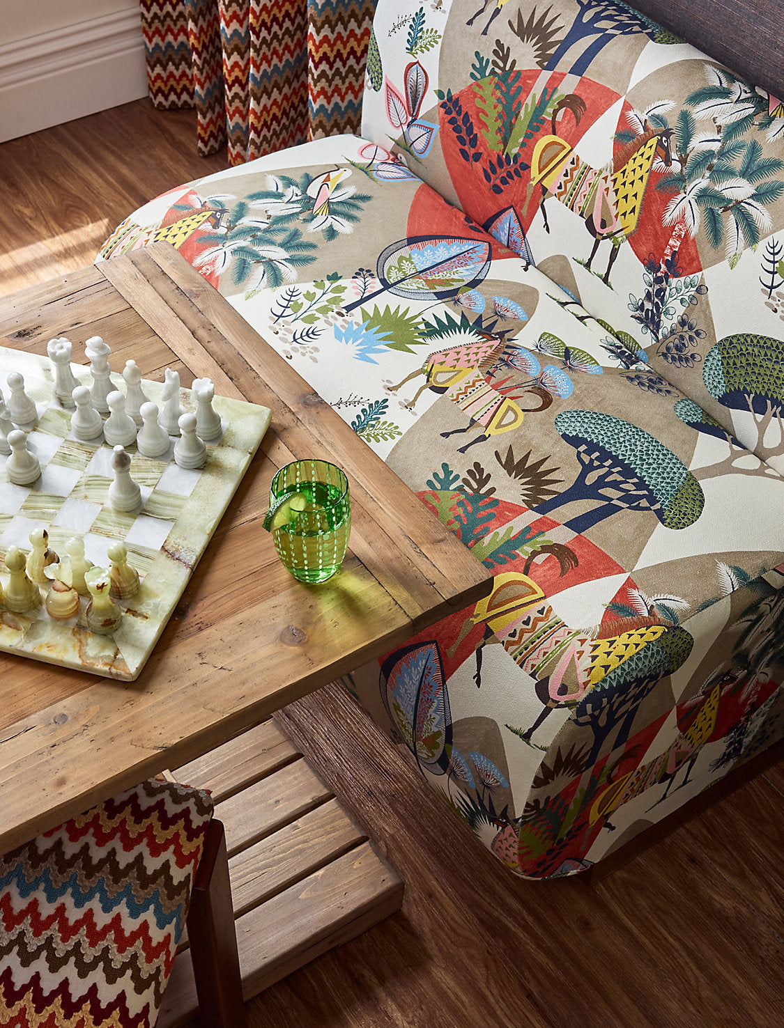 Playful llamas splashed with colorful pattern roam amongst abstract greenery and rolling hills, adding a dash of maximalist whimsy anywhere you place it. Available in three exuberant colorways, Llamas enchants in both children’s and adult spaces.