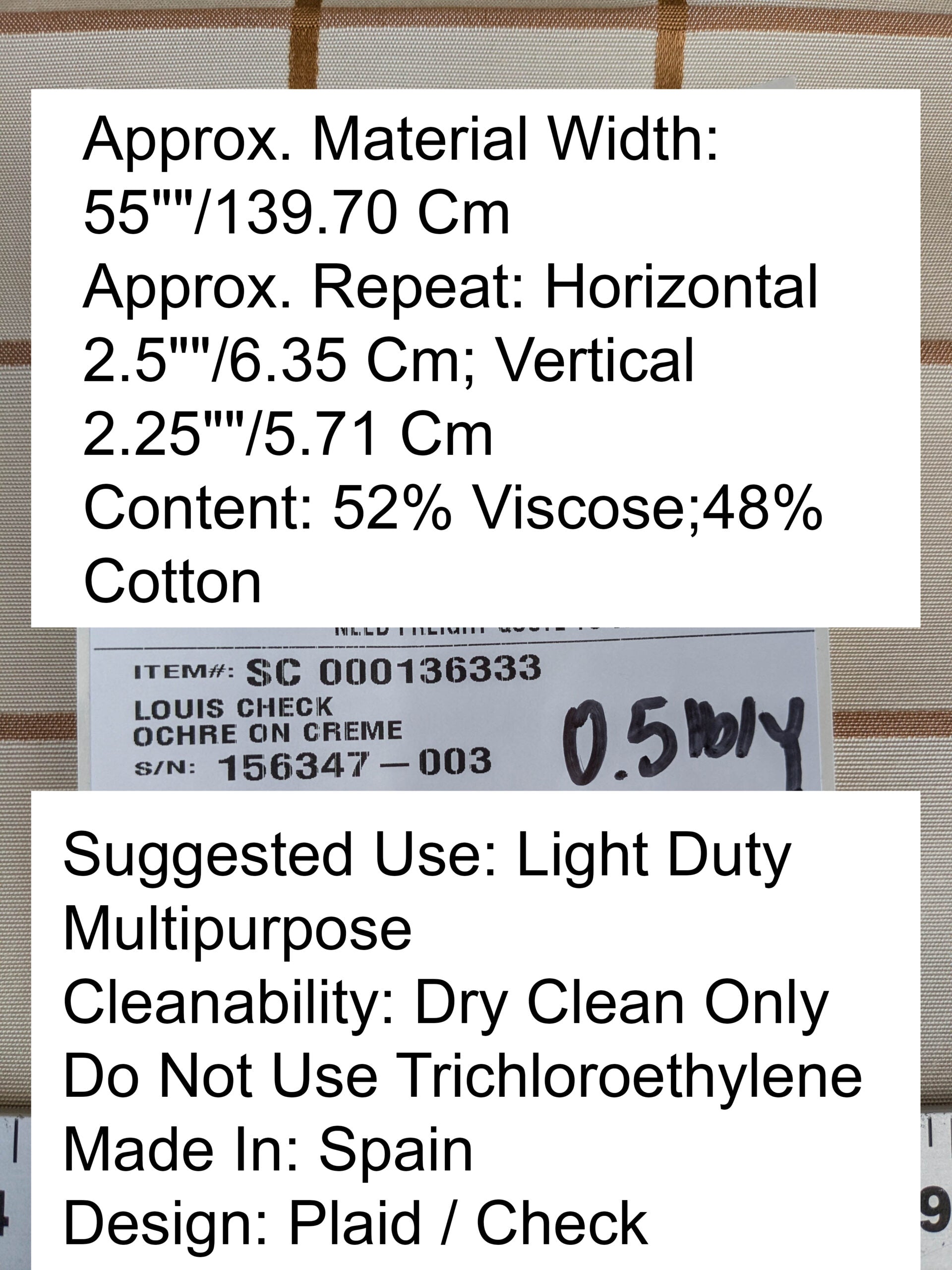 Approx. Material Width: 55"/139.70 Cm Approx. Repeat: Horizontal 2.5"/6.35 Cm; Vertical 2.25"/5.71 Cm Content: 52% Viscose;48% Cotton Suggested Use: Light Duty Multipurpose Cleanability: Dry Clean Only Do Not Use Trichloroethylene Made In: Spain Design: Plaid / Check |