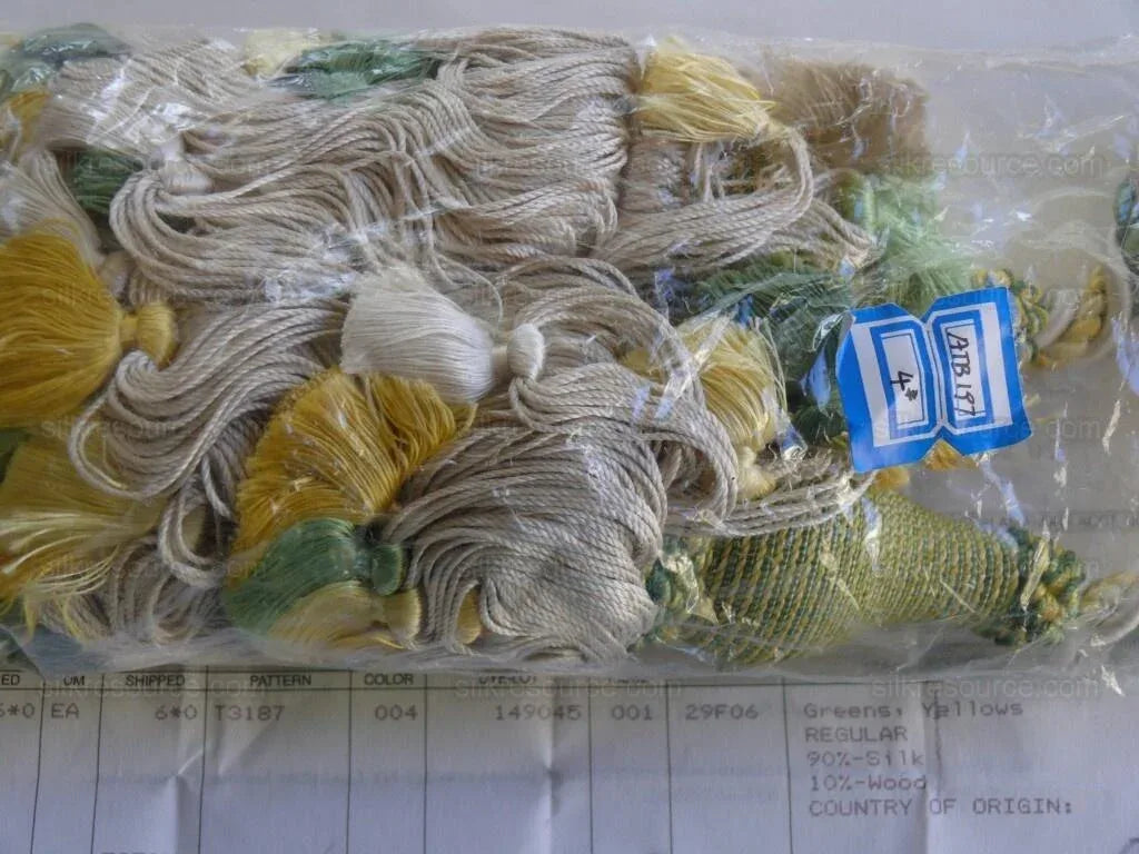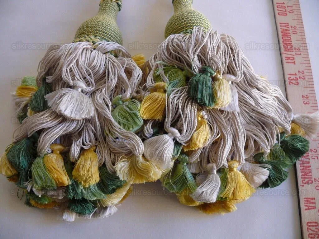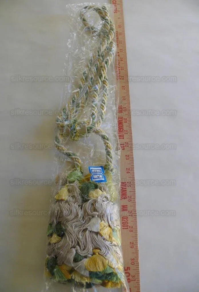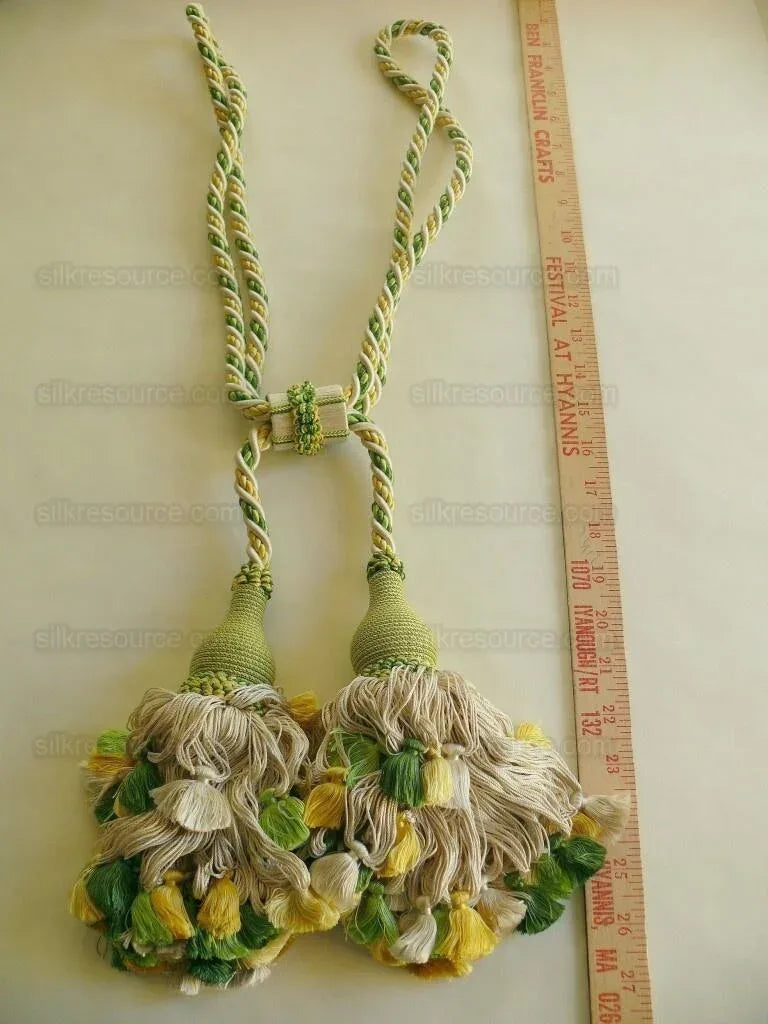 Name: LYON, sku: T3187-004, Double Tassel Tieback 90% Silk, 10% Wood Color: GREEN, YELLOW, CREAM Approx Length: 8"",Cord Spread: 30 "" , MSRP $443" LISTING IS FOR ONE TIEBACK. Available: 5 |