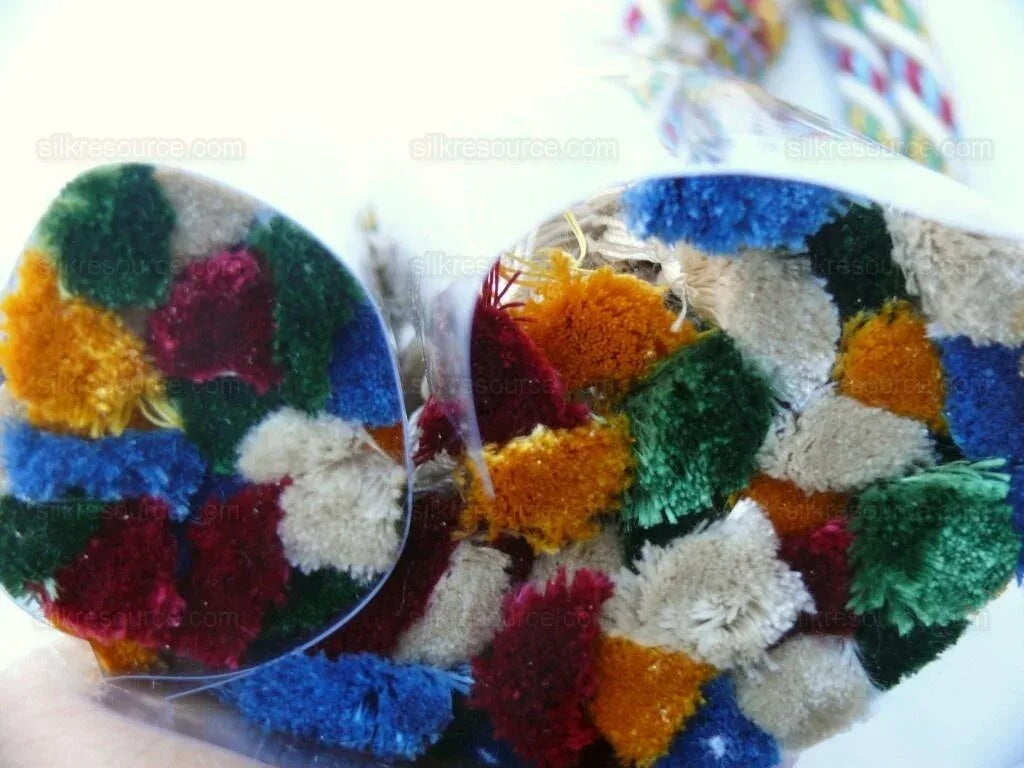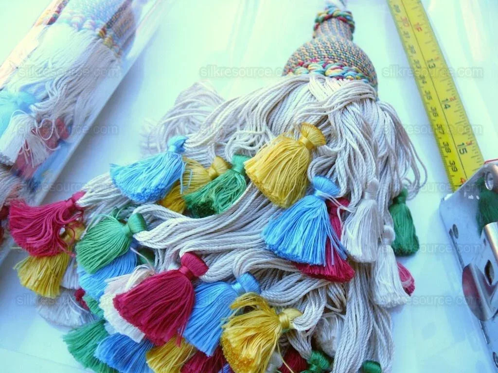 Name: LYON, sku: T3187-012, Double Tassel Tieback 90% Silk, 10% Wood Color: Red, Green, Yellow, Blue Approx Length: 8"",Cord Spread: 30 "" , MSRP $443" |