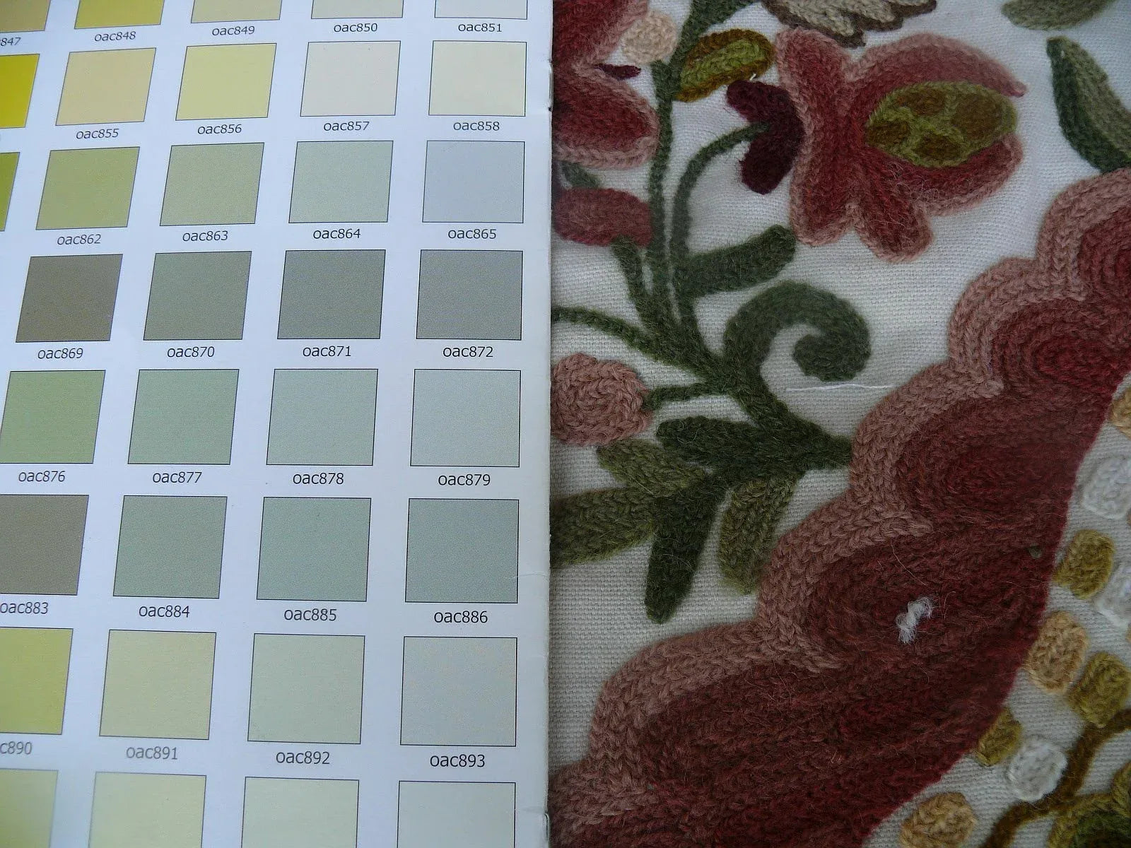 Color: Background is natural (not white). Crewel in pink, burgundy, gold, pale pink, brown, beige, grey (many colors).