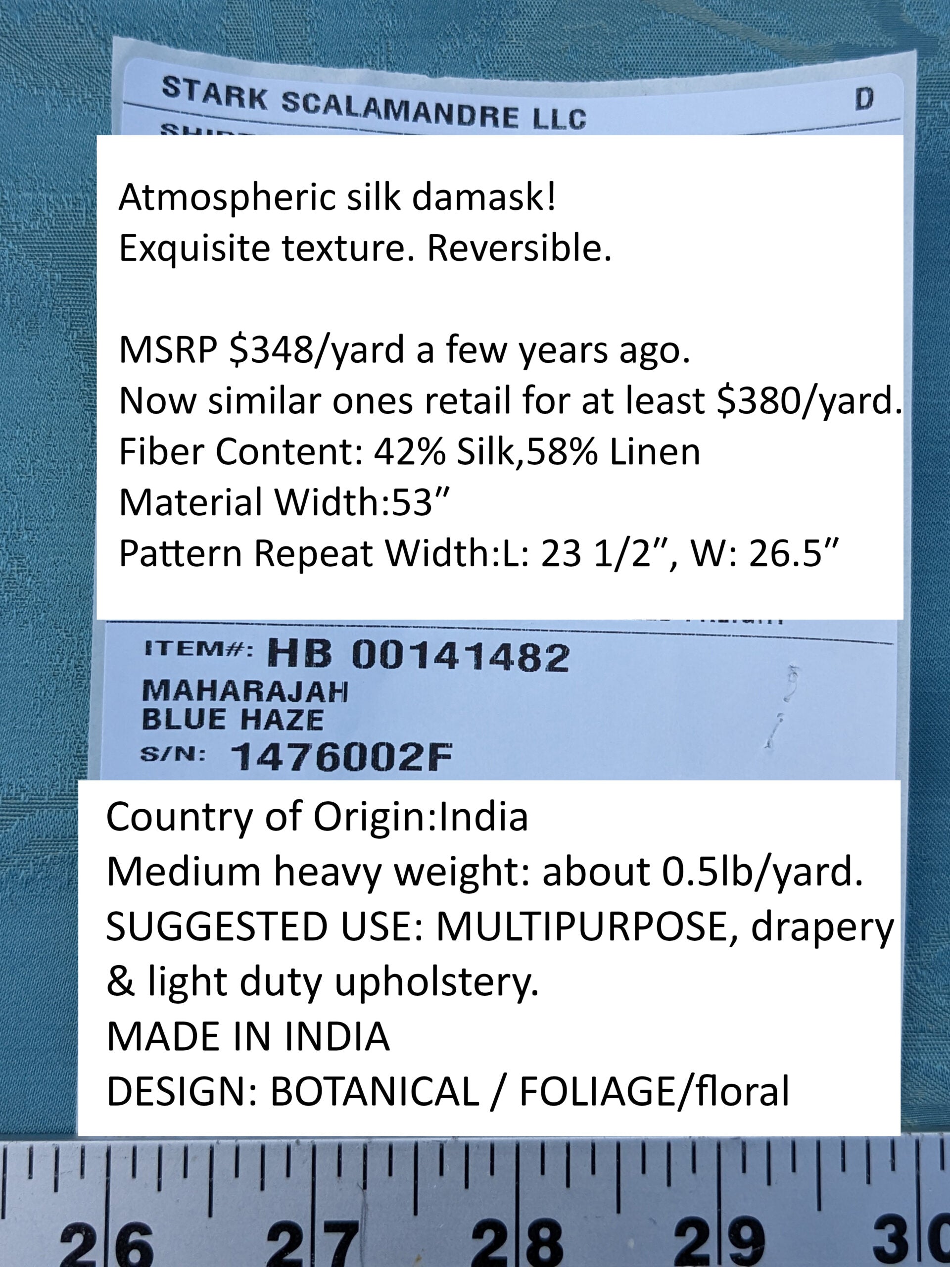 | MSRP | $348/yard a few years ago. Now similar ones retail for at least $380/yard. |