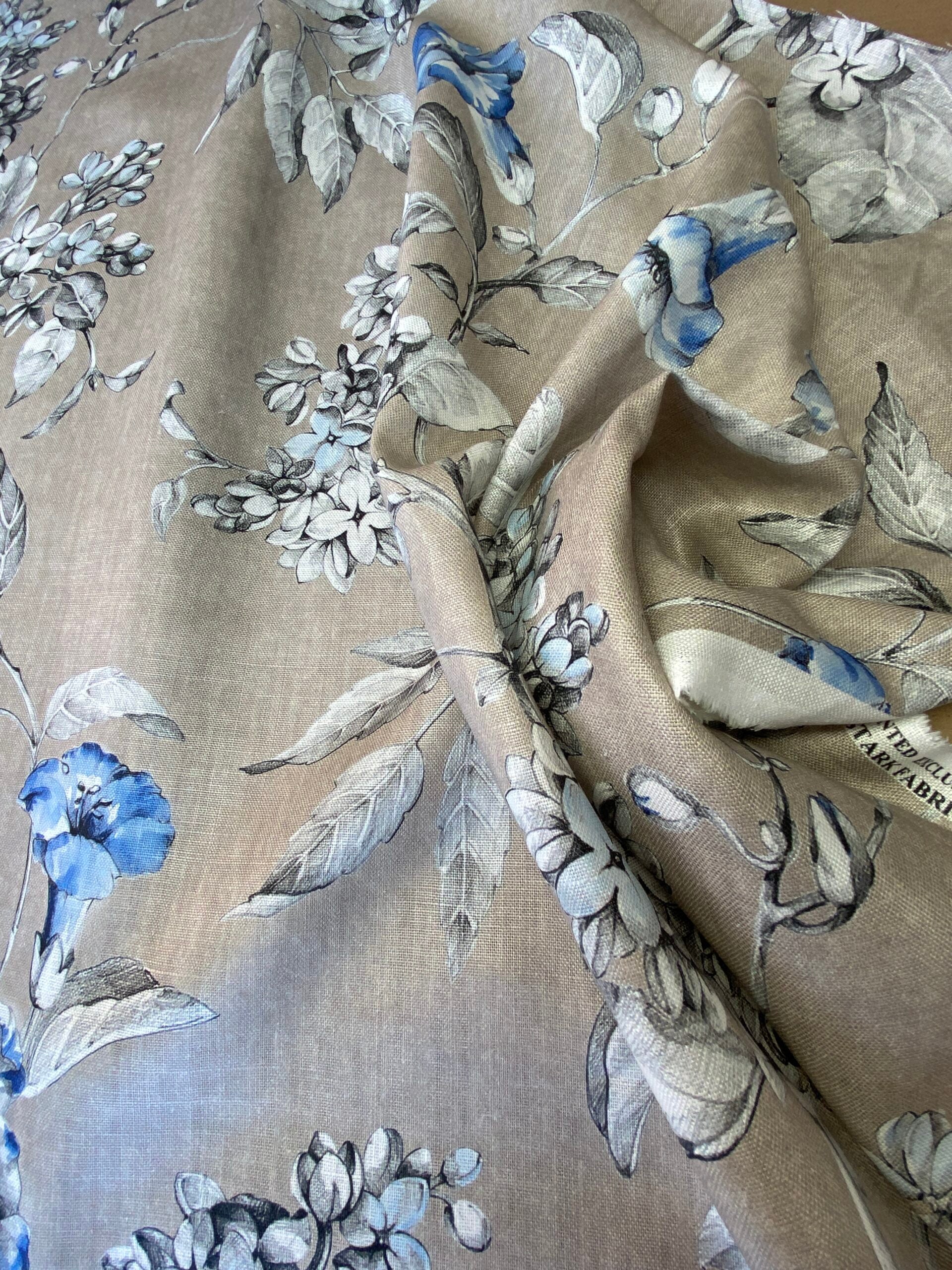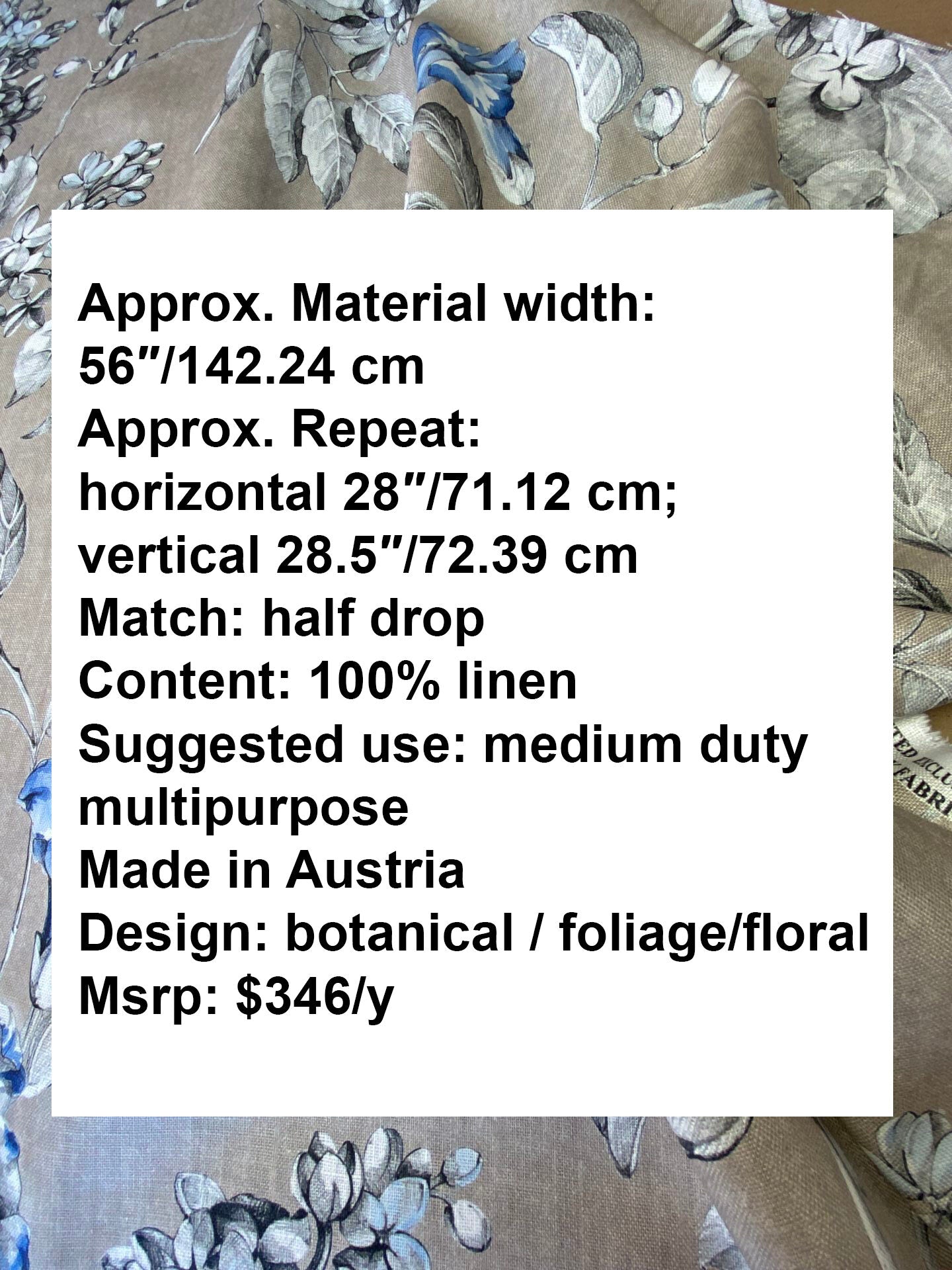 Austria creates some of the best linen print. Central Europe has one of the most agreeable climates to grow linen. Austria's long tradition of industry accumulated much respected skills. This linen feels almost silky yet very crisp and durable. Flowy drapery or durable upholstery, it can fulfill both duties. The large blossoms are naturalist with just a bit of "quick sketchy" modernity. It is so eye-catching quality and even a bit mischievous. Merrimon is not just another flower print you will see and forget.