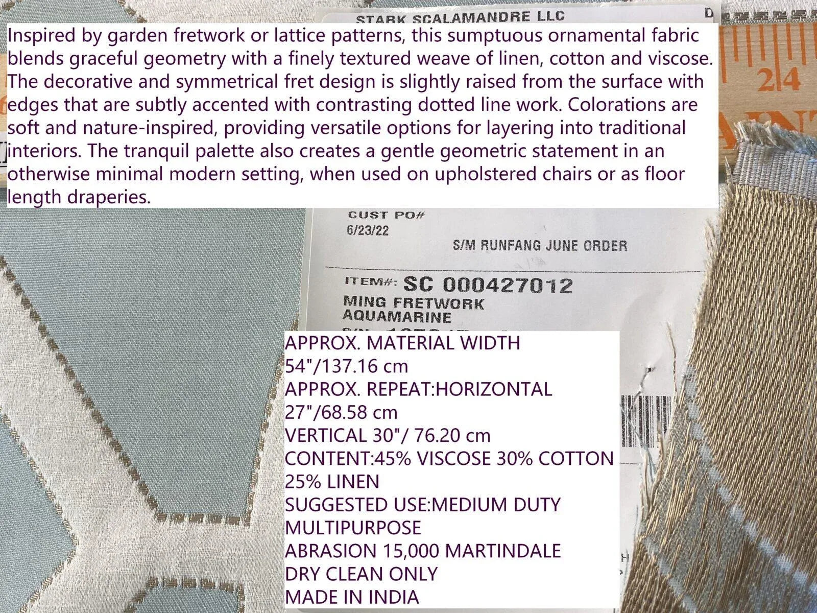 All details (pattern name, colorway, content, repeat, width, durability, retail price, country of origin): Please see text in photo.