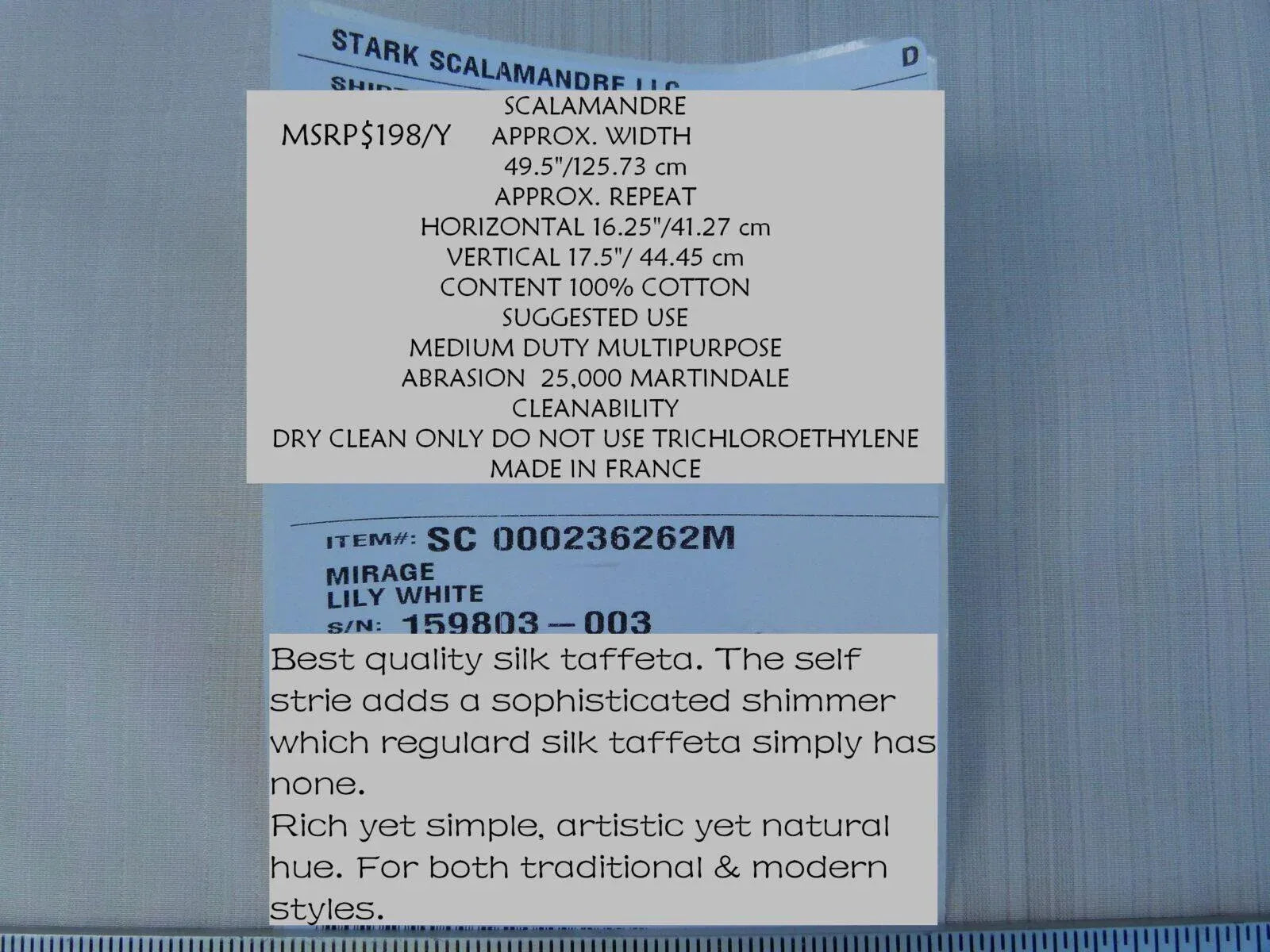 The self strie adds a sophisticated shimmer which regular silk taffeta simply has none. Such an elegant, rich yet simple, artistic yet natural hue. It works for both traditional & modern styles. MSRP$198/yard a few years ago. Now such self strie silk taffeta retails for about $300/yard. Content: 100% silk, Width 54", Approx. Width: HR14", VR 0". Country of Origin: China. Weight: medium. About 0.4lb/yard. The texture feels almost leathery. Application: Drapery & light duty upholstery. |