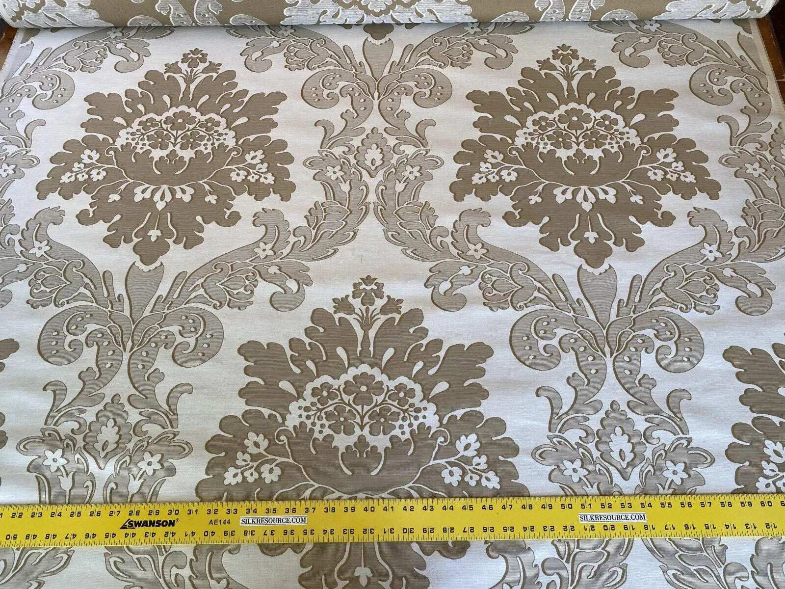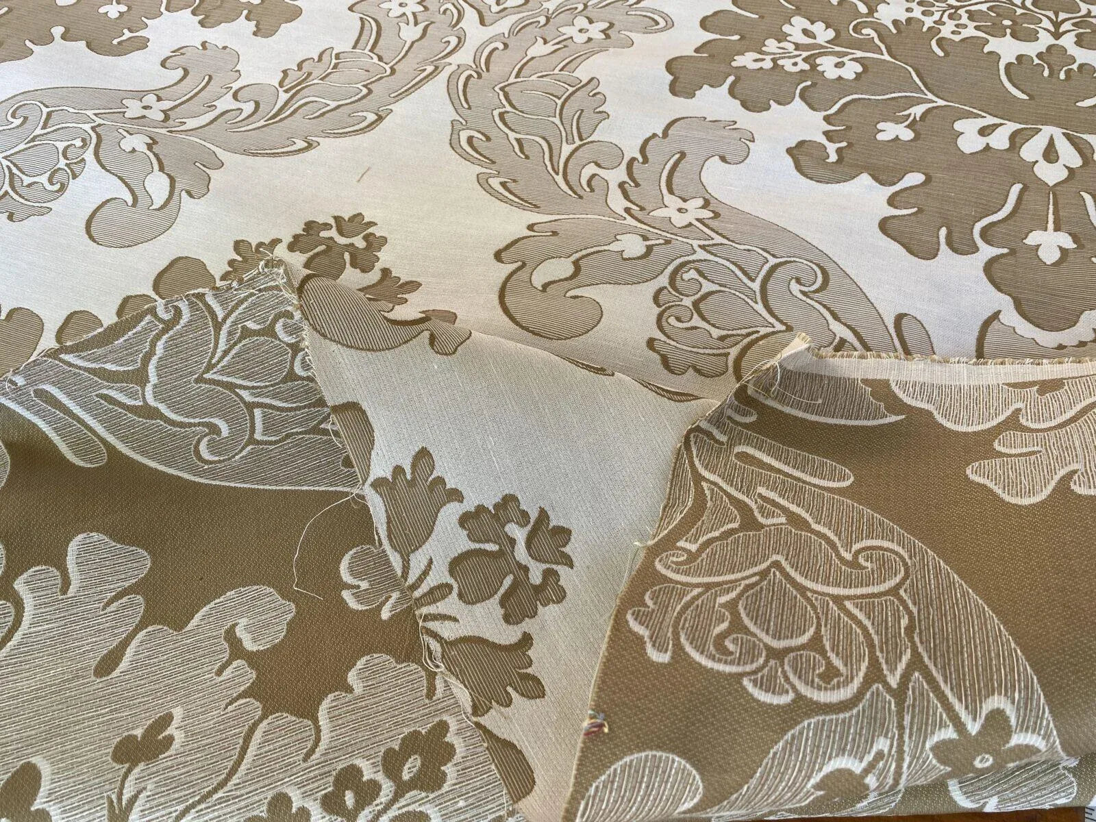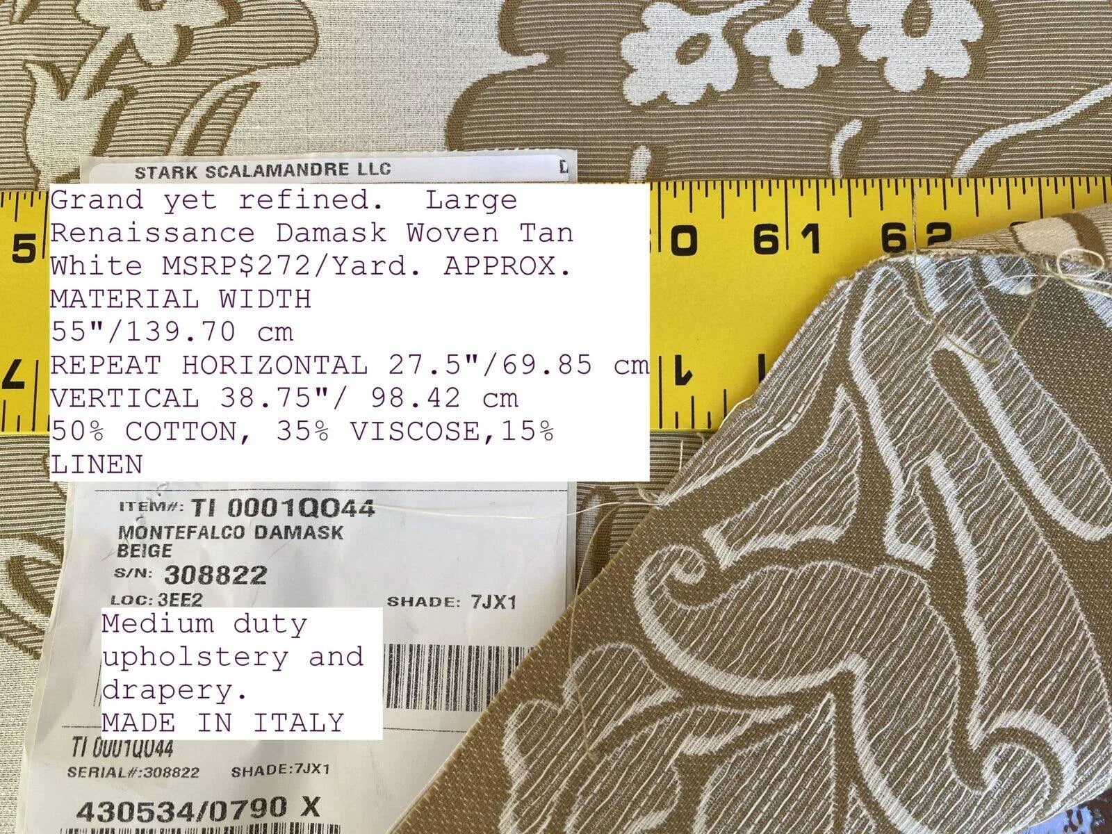 | Grand yet refined. Large Renaissance Damask Woven Tan White MSRP$272/Yard. APPROX. MATERIAL WIDTH 55"/139.70 cm REPEAT HORIZONTAL 27.5"/69.85 cm VERTICAL 38.75"/ 98.42 cm 50% COTTON, 35% VISCOSE,15% LINEN. Medium duty upholstery and drapery. MADE IN ITALY |