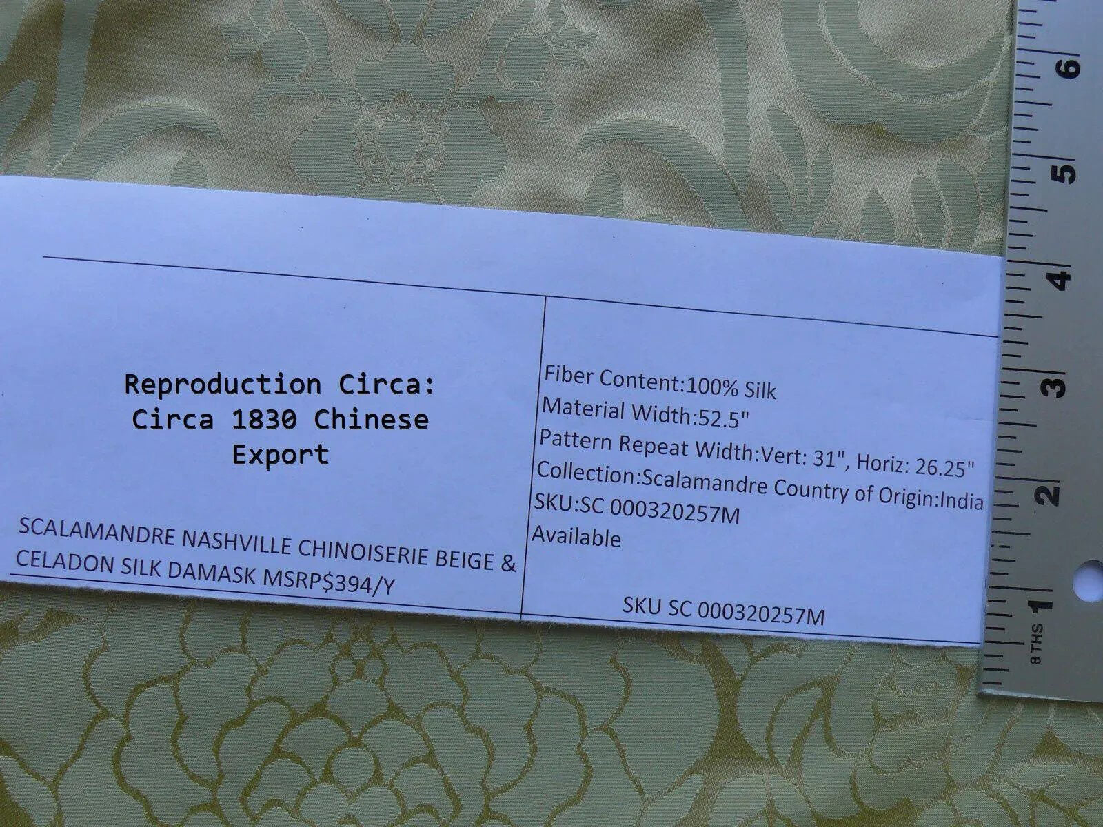 Scalamandre Nashville Celadon Green Beige 100% Silk Damask Chinoiserie Peony Flower Basket Circa 1830