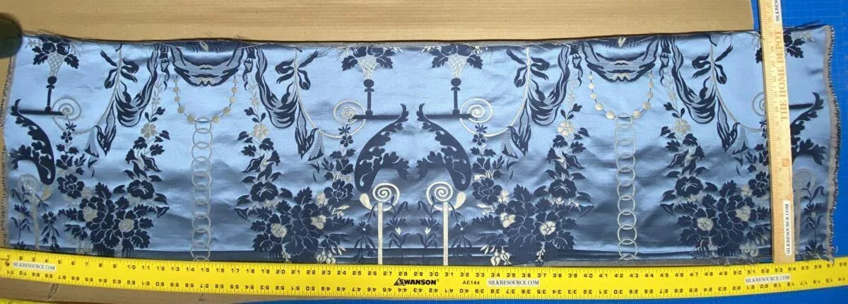 Stunning neoclassical silk lampas. Both botanical and architectural elements, literally, interweave into each other to form a stately but also decorative kingdom,