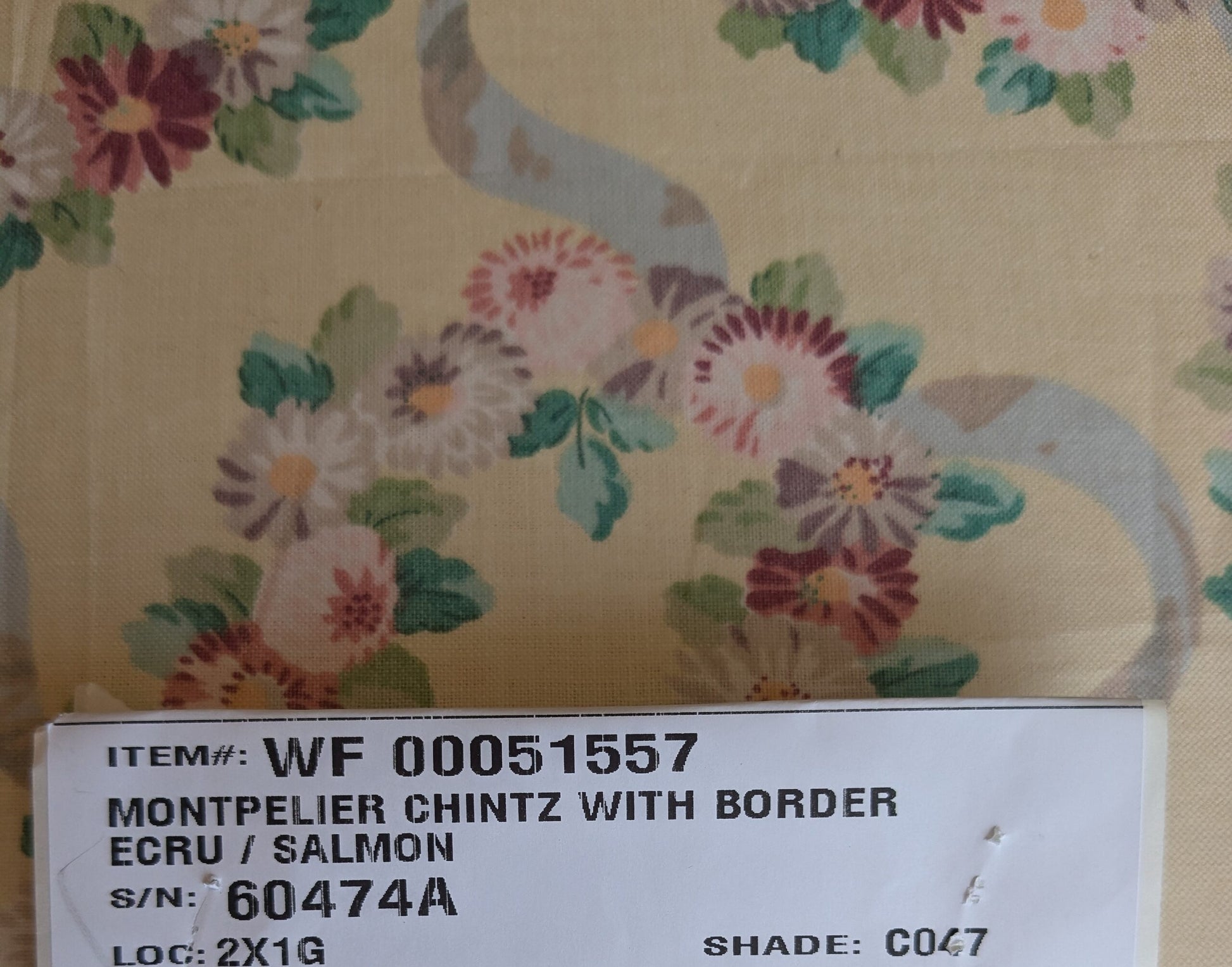 M O N T P E L I E R C H I N T Z W I T H B O R D E R ECRU / SALMON • WF 0005 1557 Printed Fabrics by Old World Weavers MSRP about $250/yard. APPROX. MATERIAL WIDTH 50" / 127.00 cm APPROX. REPEAT . . VERTICAL 17" / 43.18 cm CONTENT . . . . . . . . . 100% COTTON (GLAZED) 42" WIDE + 8" BORDER SUGGESTED USE .. . LIGHT DUTY MULTIPURPOSE MADE IN . . . . . . . . . . ENGLAND DESIGN . . . . . . . . . . . FLORAL SCROLL SCALE .. . . . . . . . . . . . LARGE |