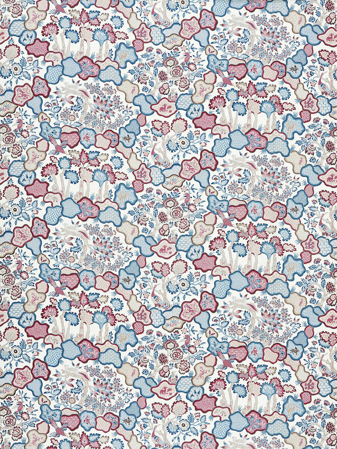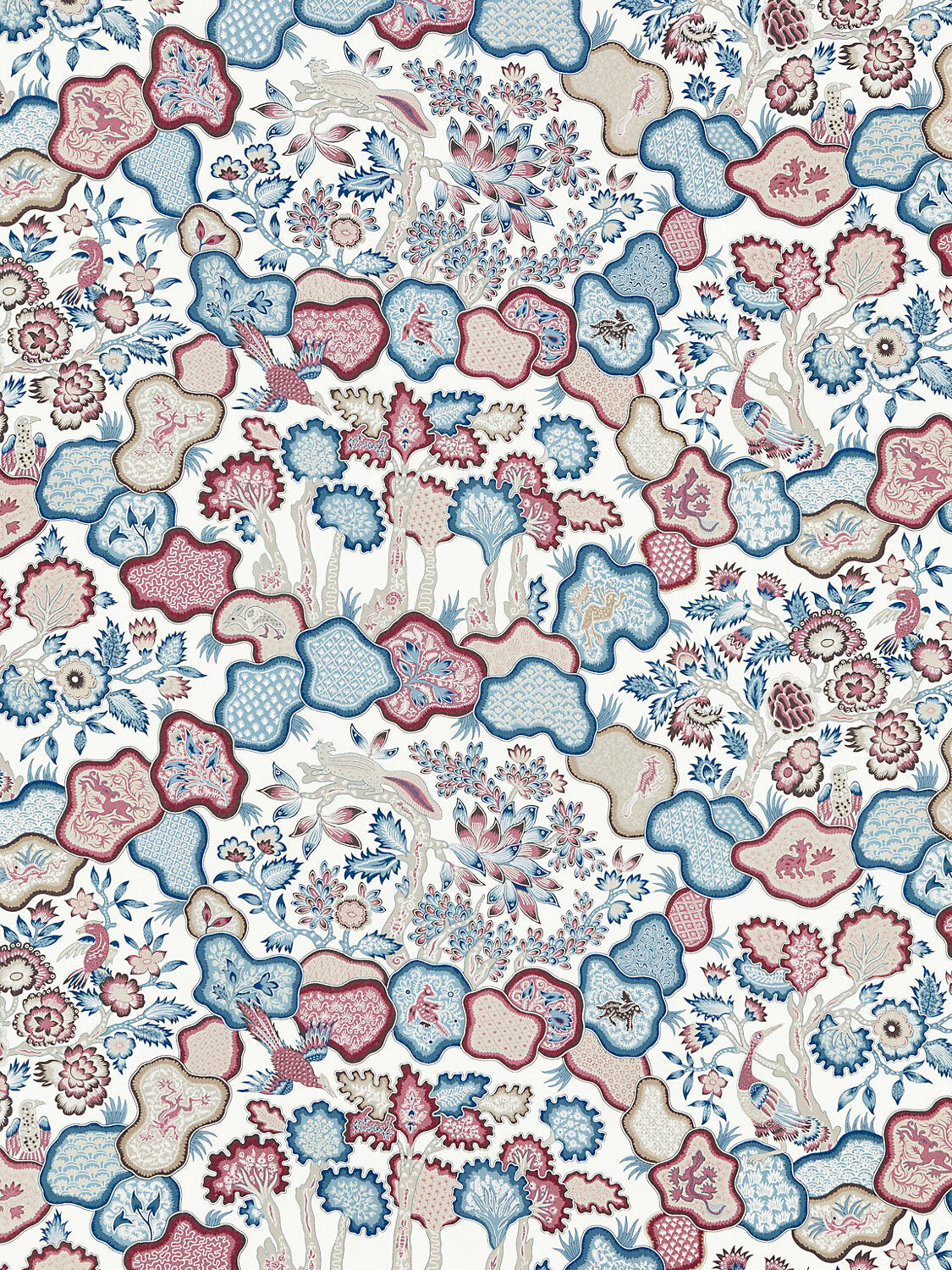 Scalamandre Old World Weavers Ziba Peacock Rose Red Blue White Mythical Animal Bird Peacock Rose Linen 2Y Minimum MSRP USD 416/y