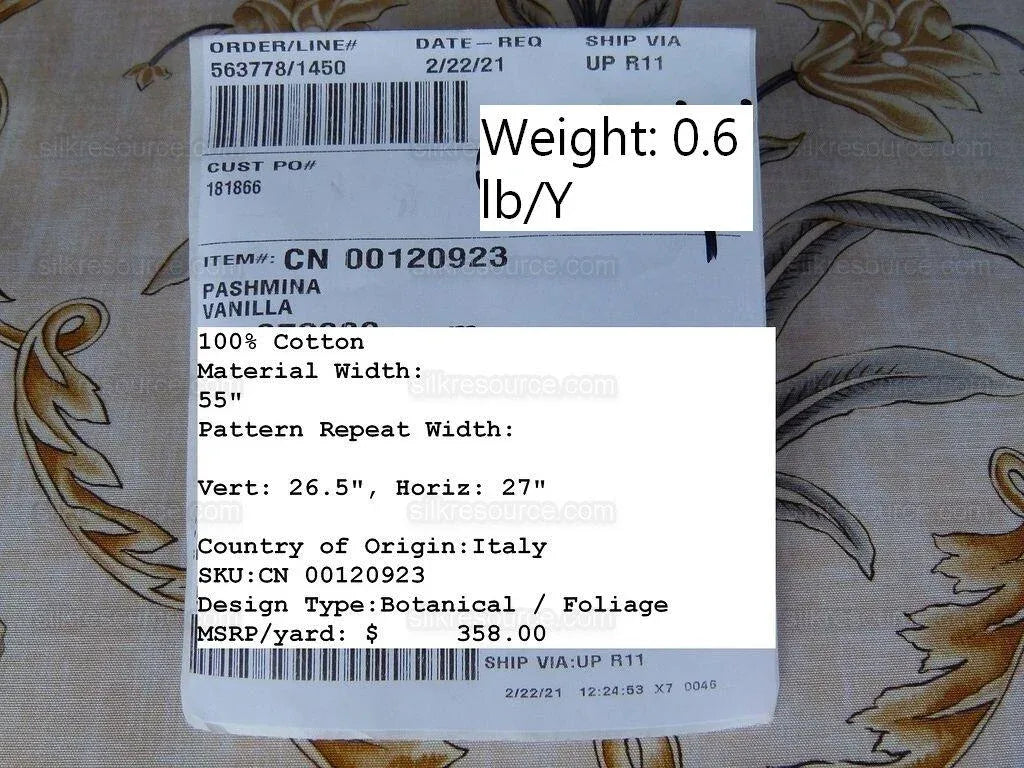 Fiber, repeat, width, weight, country of origin, retail price/yard: