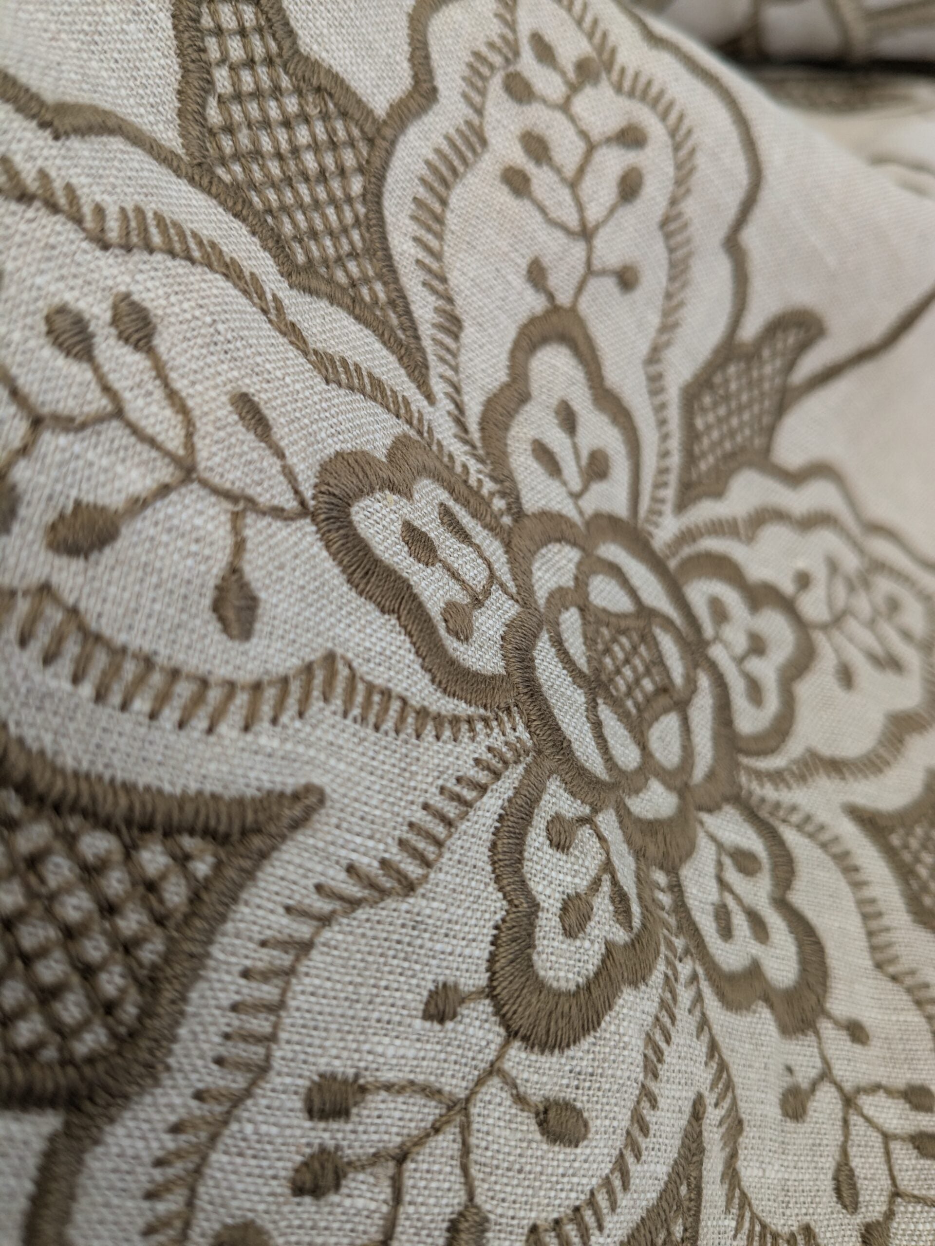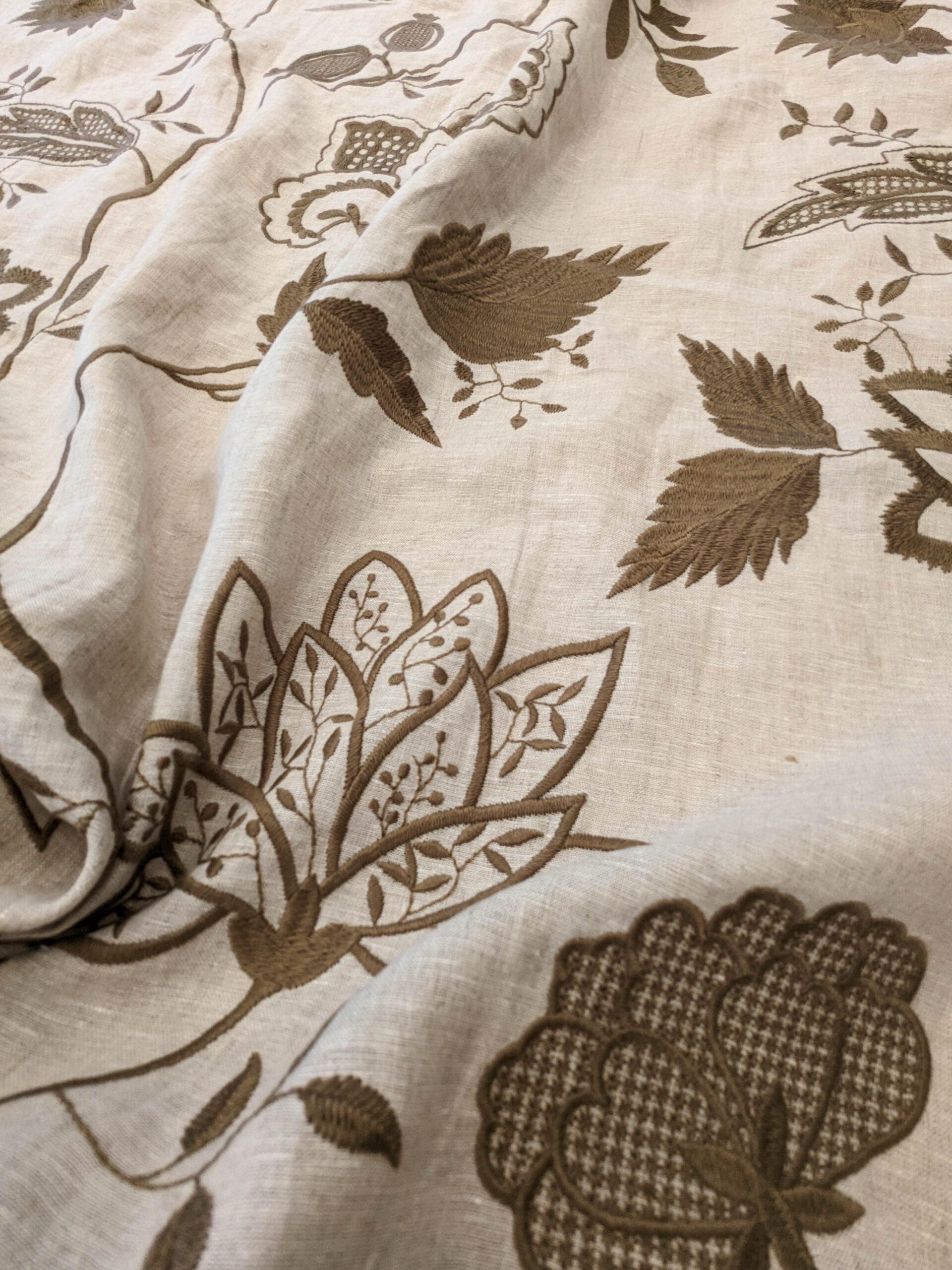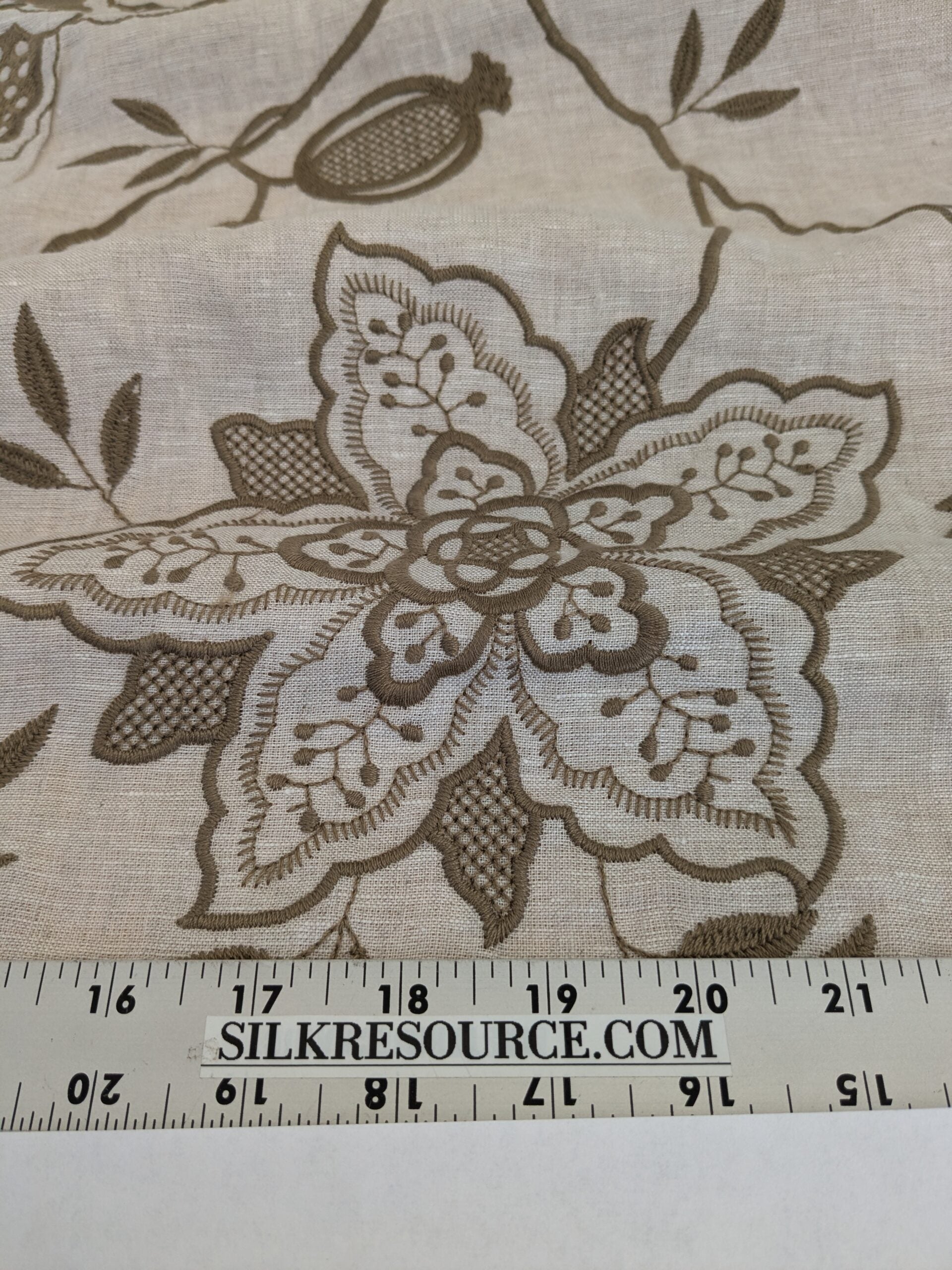 Embroideries by Old World Weavers APPROX. MATERIAL WIDTH: 50" / 127.00 cm APPROX. REPEAT: HORIZONTAL 25.2" / 64.01 cm; VERTICAL 30.3" / 76.96 cm CONTENT: 100% LINEN SUGGESTED USE: LIGHT DUTY MULTIPURPOSE MADE IN: INDIA DESIGN: FLORAL SCALE: LARGEApplication: drapery, light duty upholstery. |