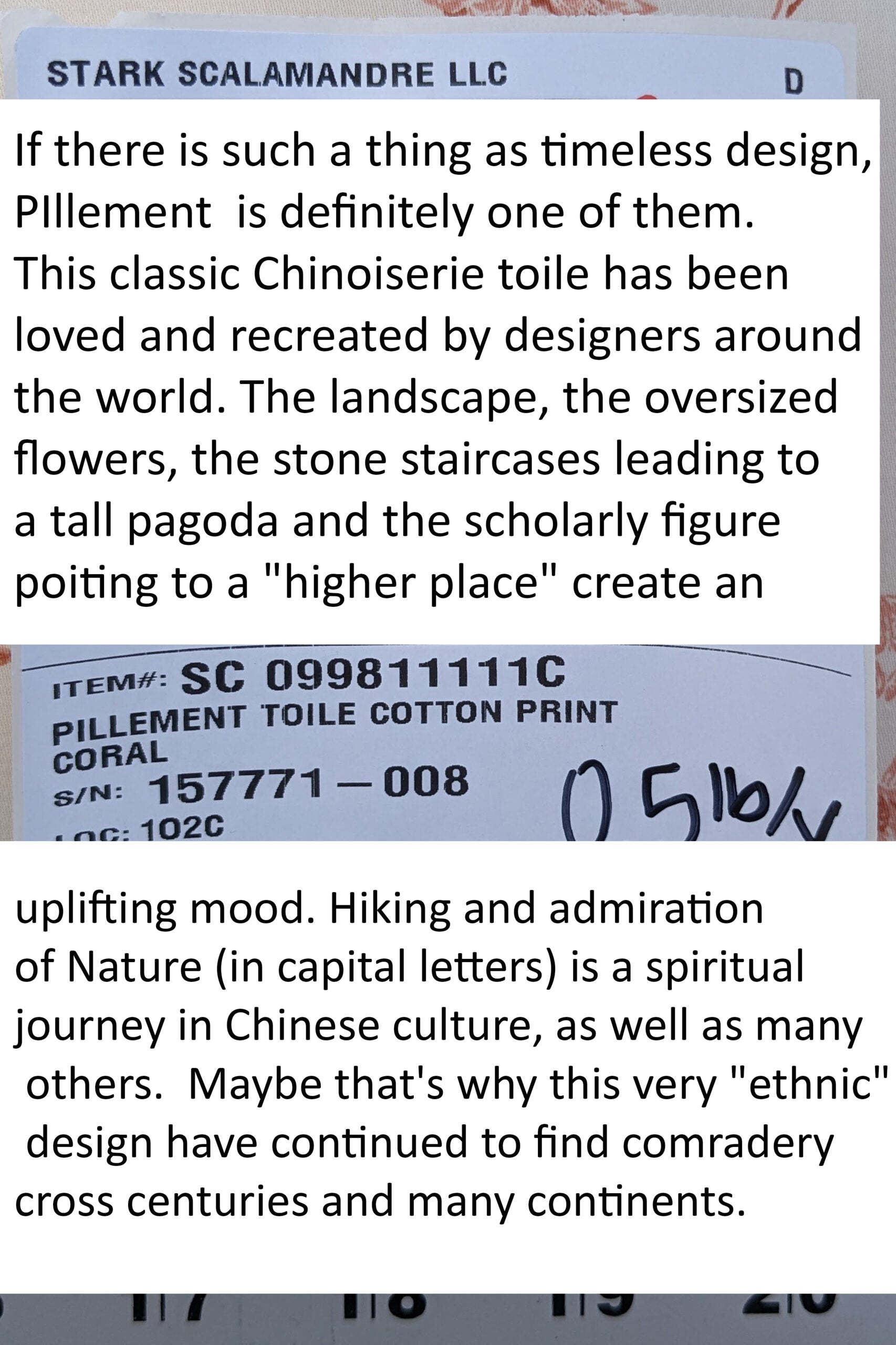 If there is such a thing as timeless design, PIllement is definitely one of them. This classic Chinoiserie toile has been loved and recreated by designers around the world. The landscape, the oversized flowers, the stone staircases leading to a tall pagoda and the scholarly figure pointing to a "higher place" create an uplifting mood. Hiking and admiration of Nature (in capital letters) is a spiritual journey in Chinese culture, as well as many others. Maybe that's why this very "ethnic" design have continued to find comradery cross centuries and many continents.