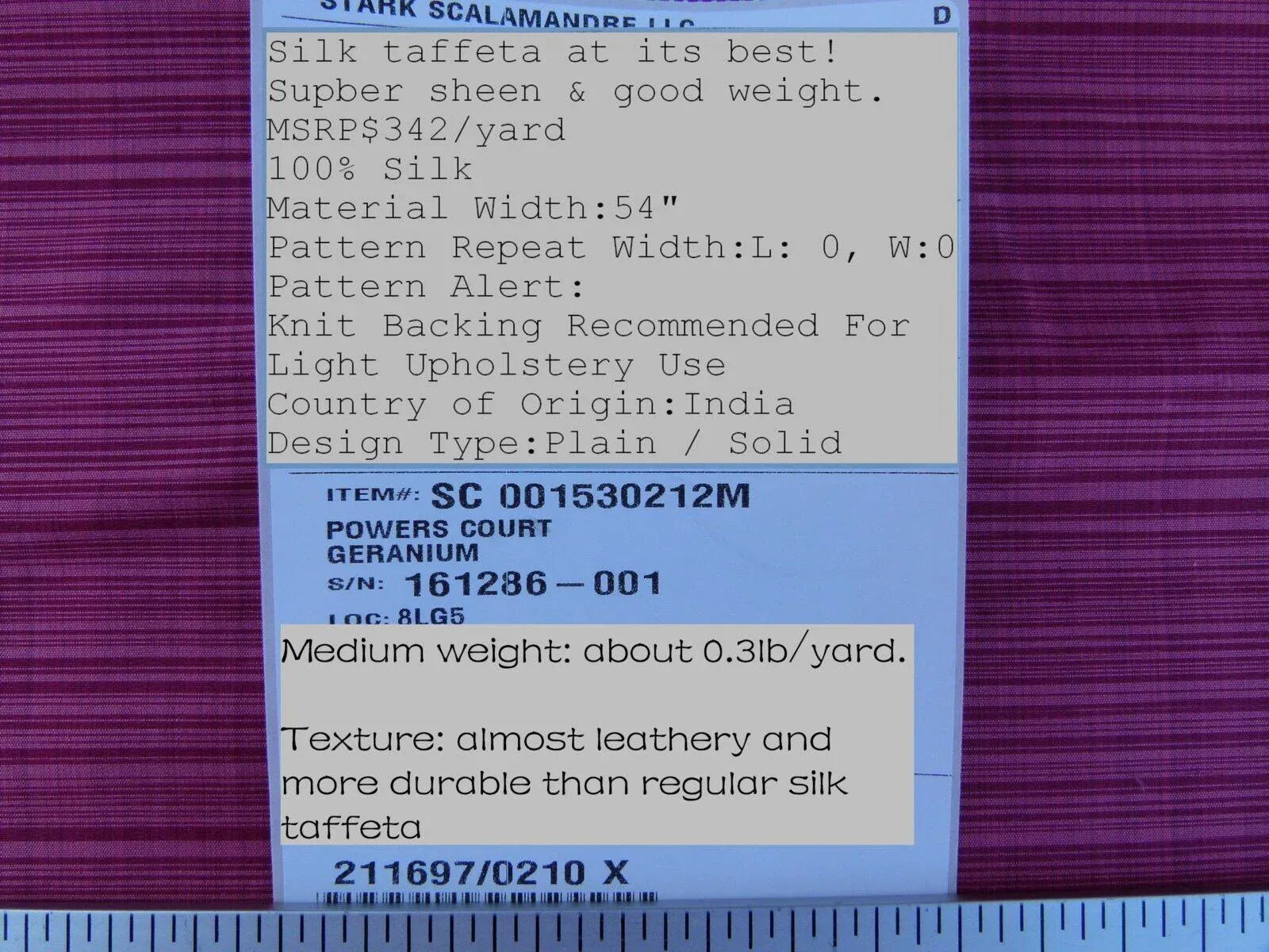 Fiber, repeat, width, weight, country of origin, retail price/yard: