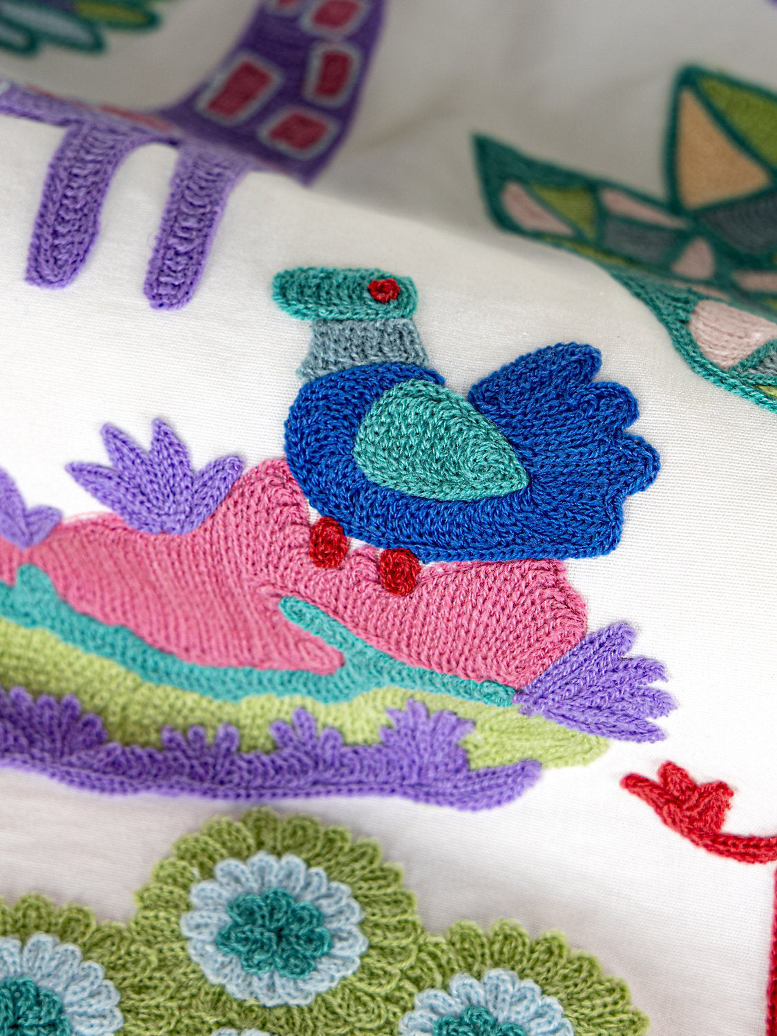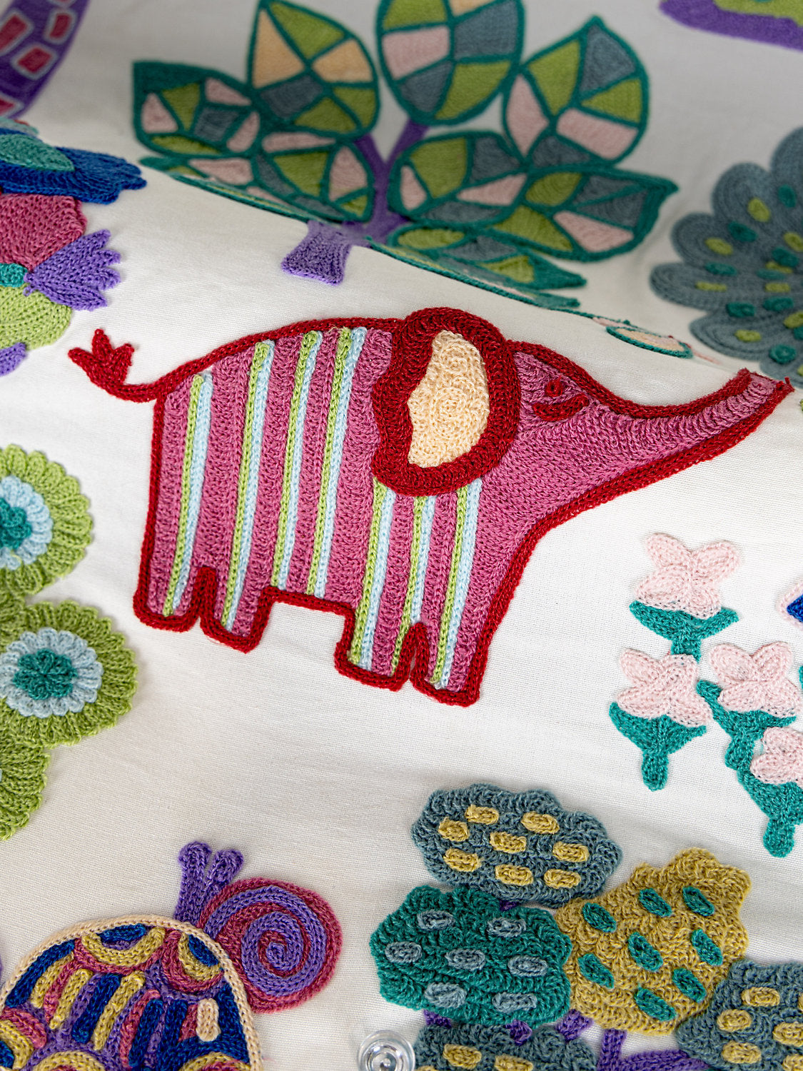 This menagerie of zoo animals is playfully rendered in crewel stitches, charming children and parents alike. Not just for nurseries, this crewel is produced in India in two delightful colorways for maximal appeal.