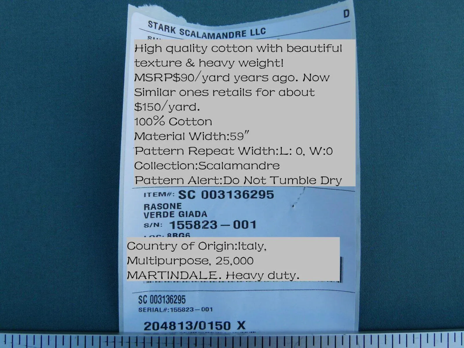 Fiber, repeat, width, weight, country of origin, retail price/yard: