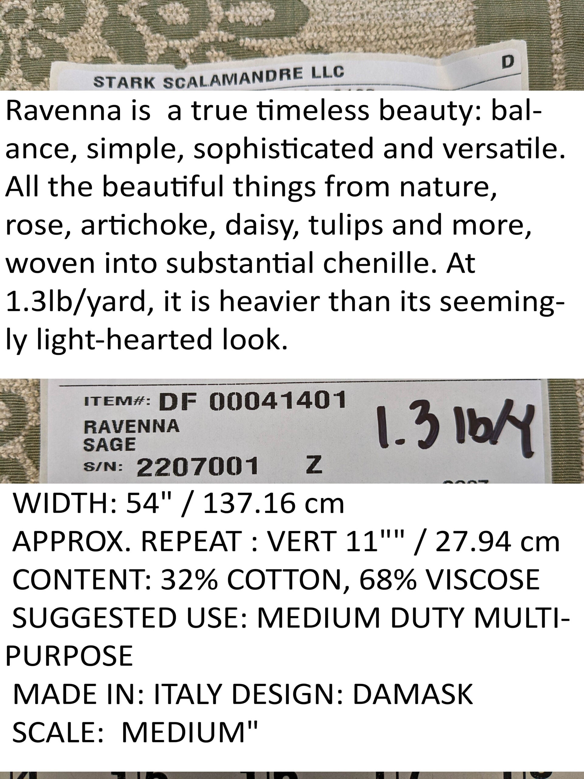 | Ravenna is a true timeless beauty: balance, simple, sophisticated and versatile. All the beautiful things from nature, rose, artichoke, daisy, tulips and more, woven into substantial chenille. At 1.3lb/yard, it is heavier than its seemingly light-hearted look. Similar woven damask from Italy now retails for $200+/yard. |