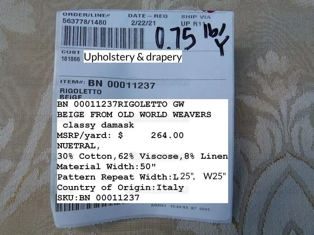 Fiber, repeat, width, weight, country of origin, retail price/yard: