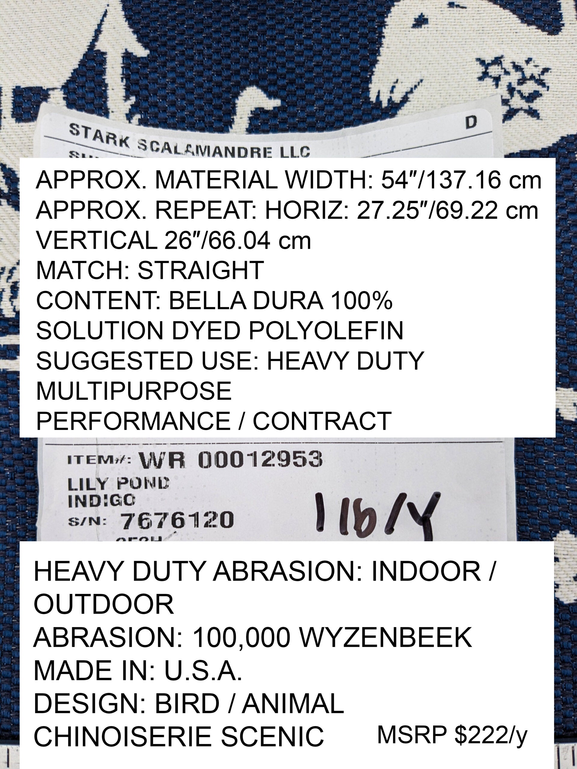 Approx. Material Width: 54" / 137.16 Cm Approx. Repeat: Horizontal 27.25" / 69.22 Cm; Vertical 26" / 66.04 Cm Match: Straight Content: Bella Dura 100% Solution Dyed Polyolefin Suggested Use: Heavy Duty Multipurpose Performance / Contract: Heavy Duty Abrasion Indoor / Outdoor Abrasion: 100,000 Wyzenbeek Made In USA Design: Bird / Animal; Chinoiserie; Scenic |