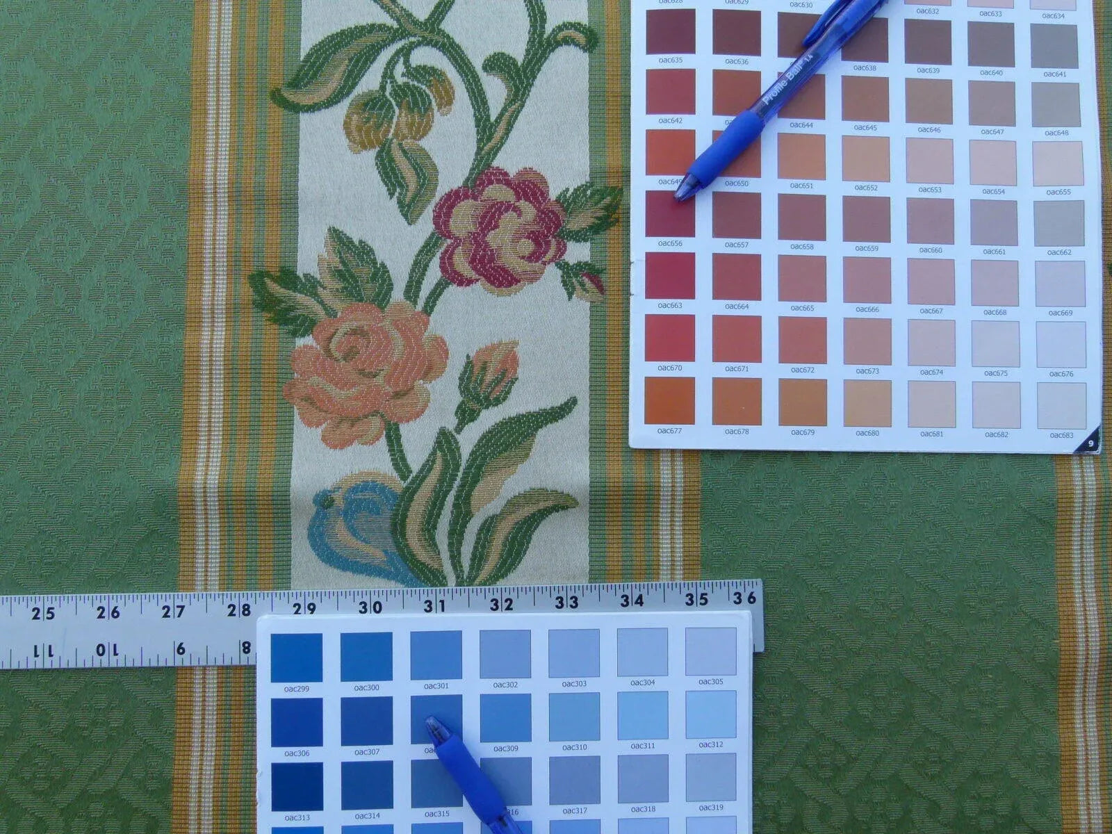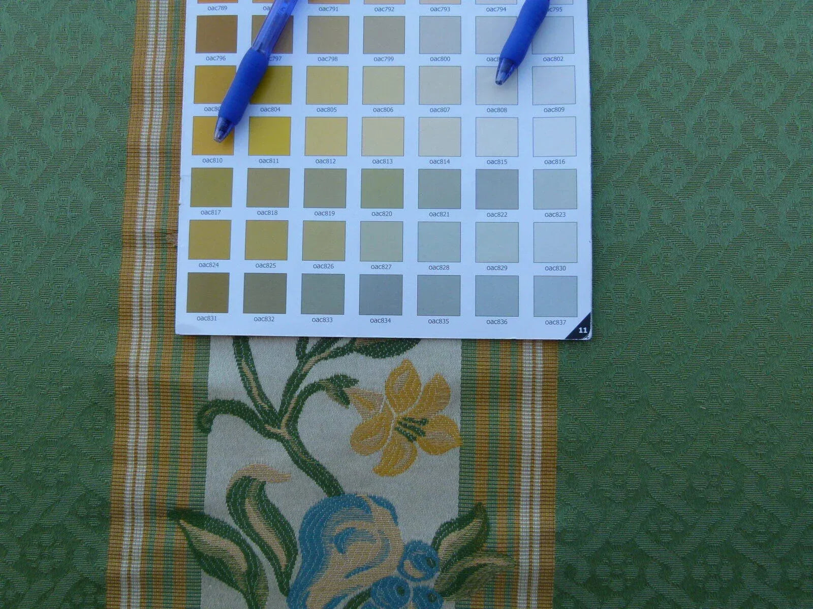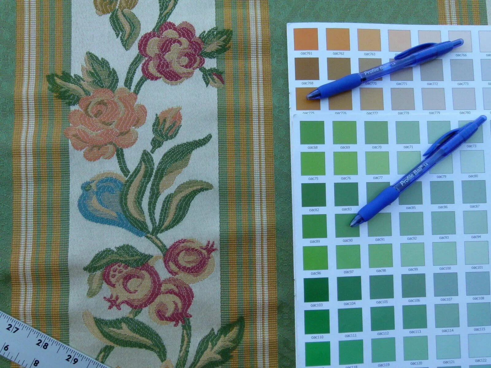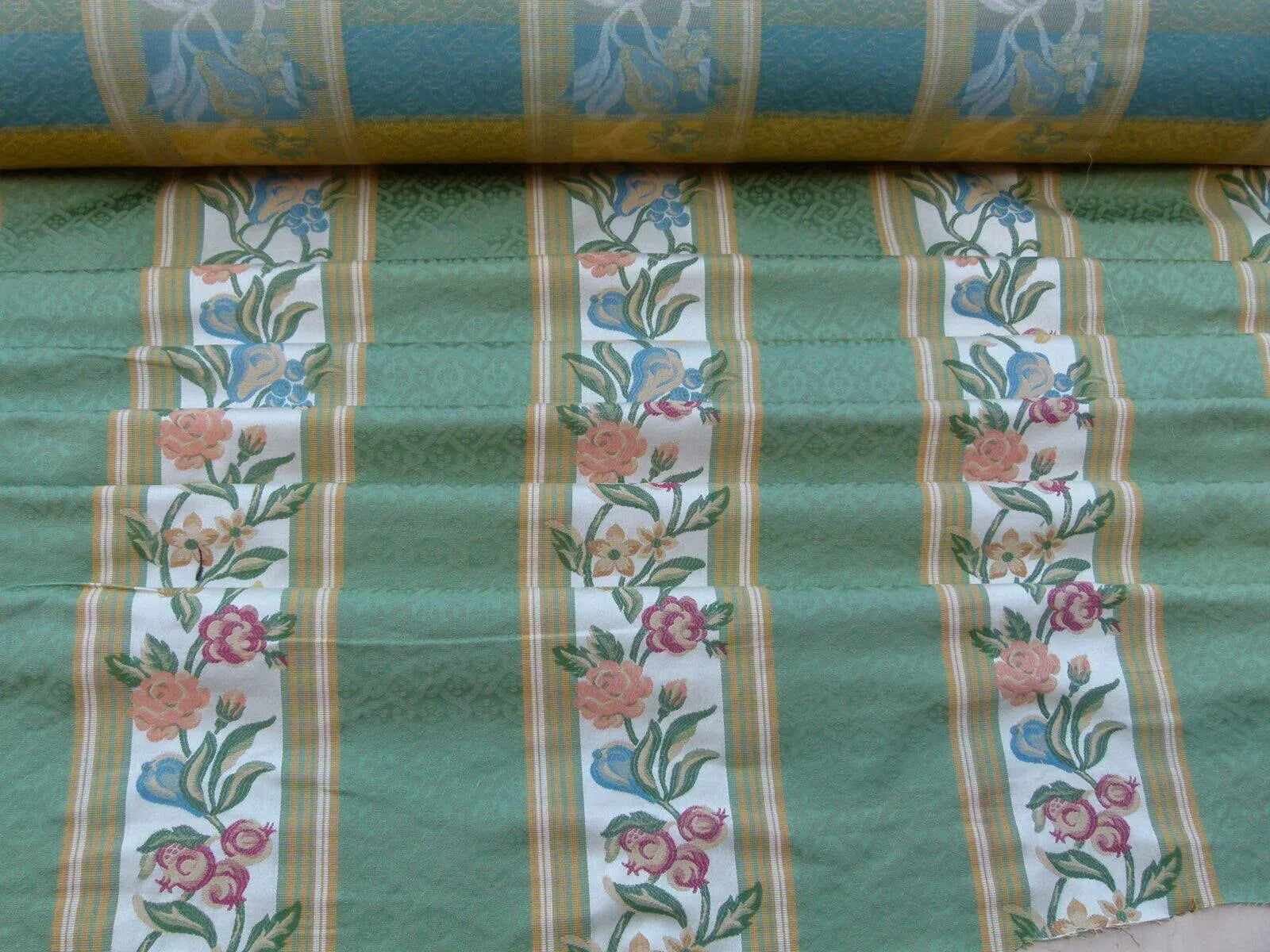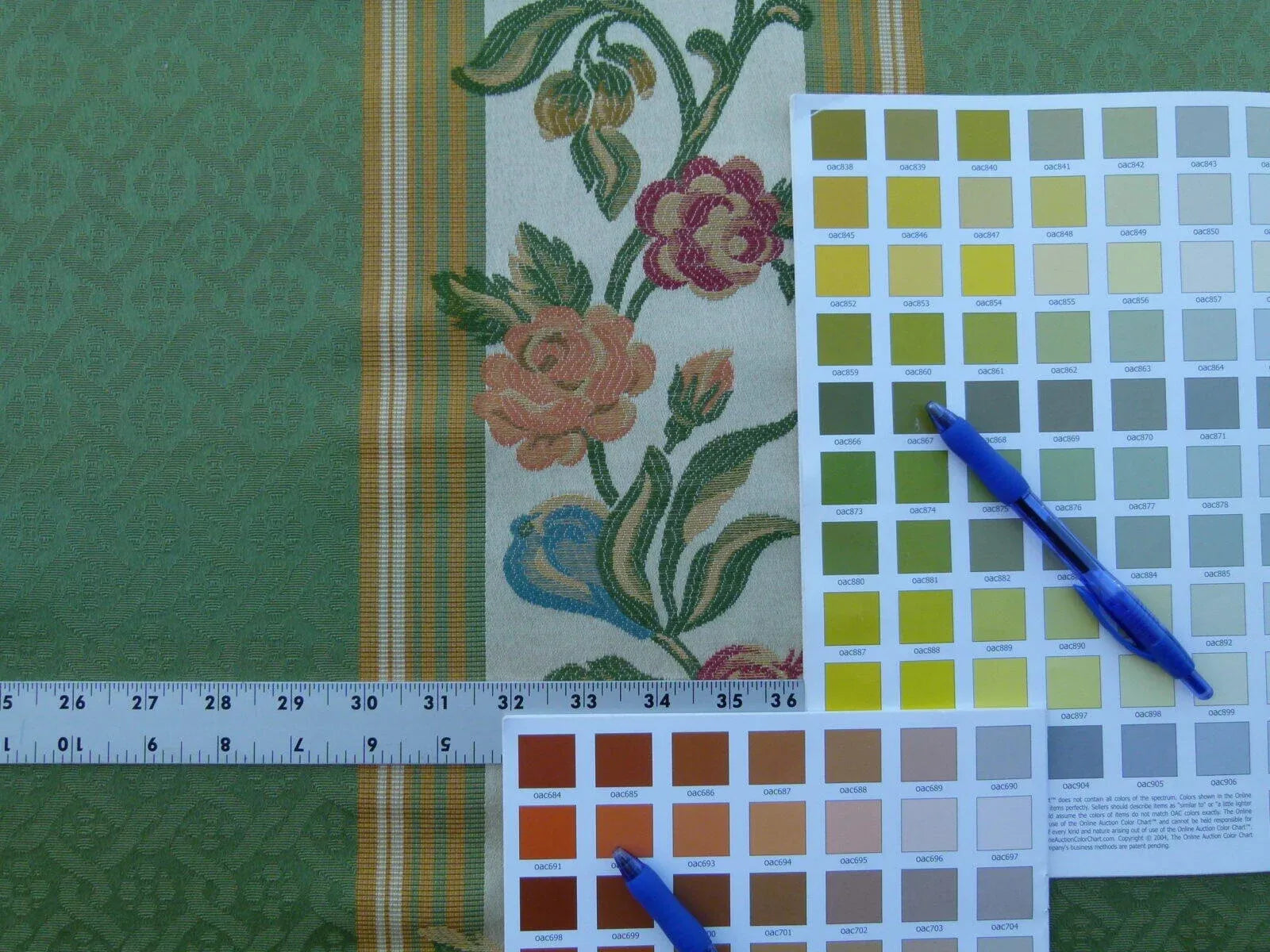 Mediterranean Garlands of rose, daisy, pomegranate and pears climb up a vine. Please note the colored wide stripe has a jacquard pattern woven into it too. Slightly iridescent.