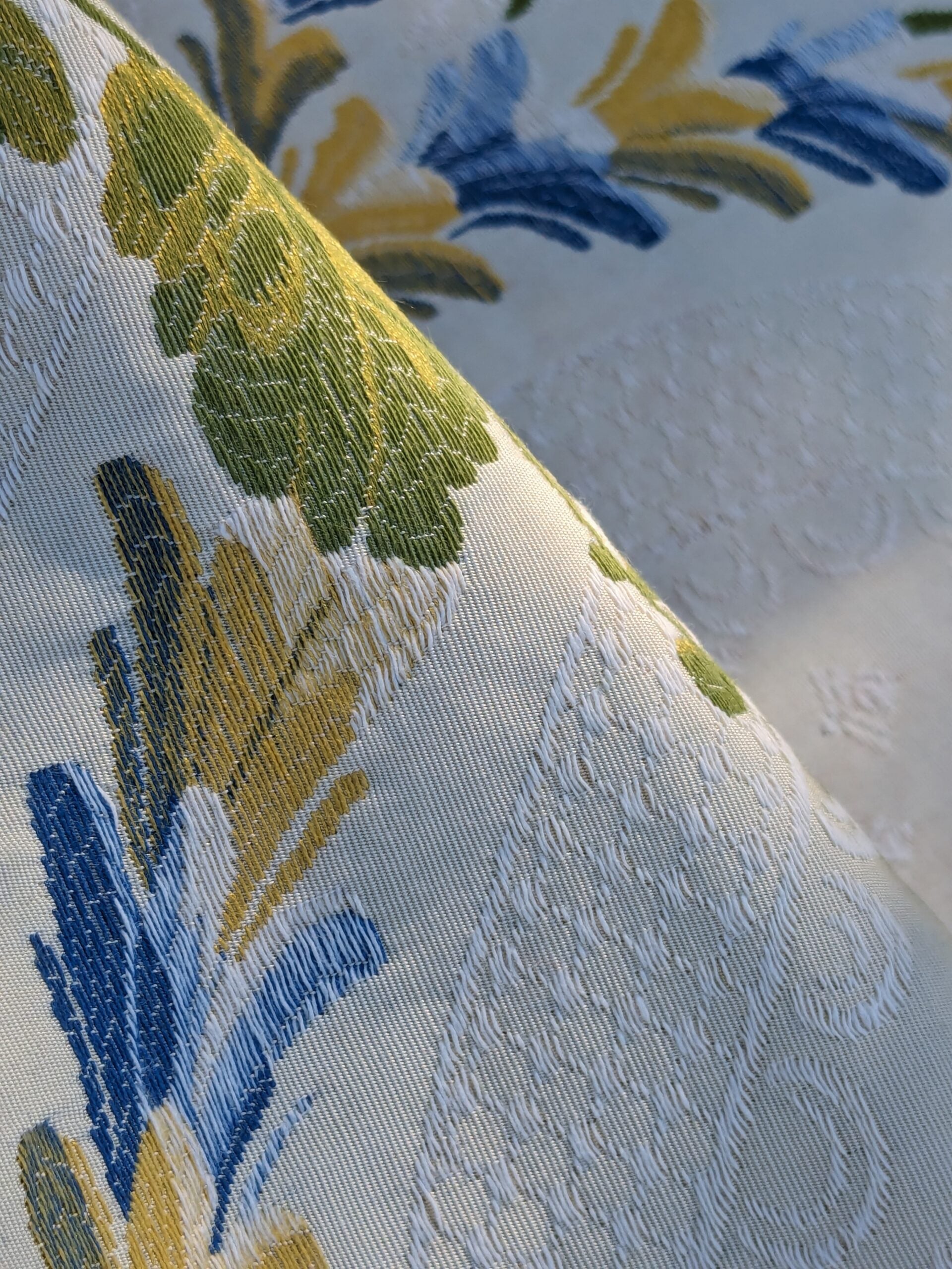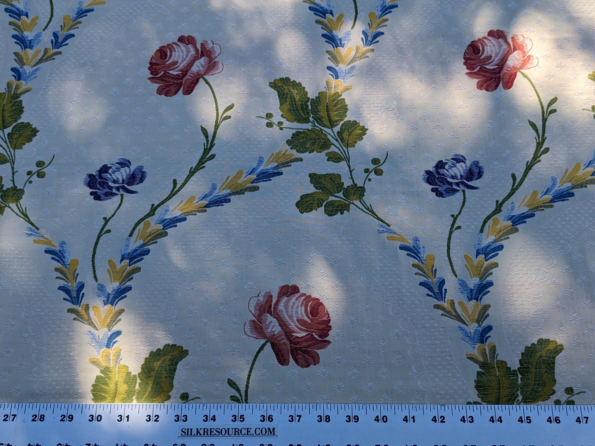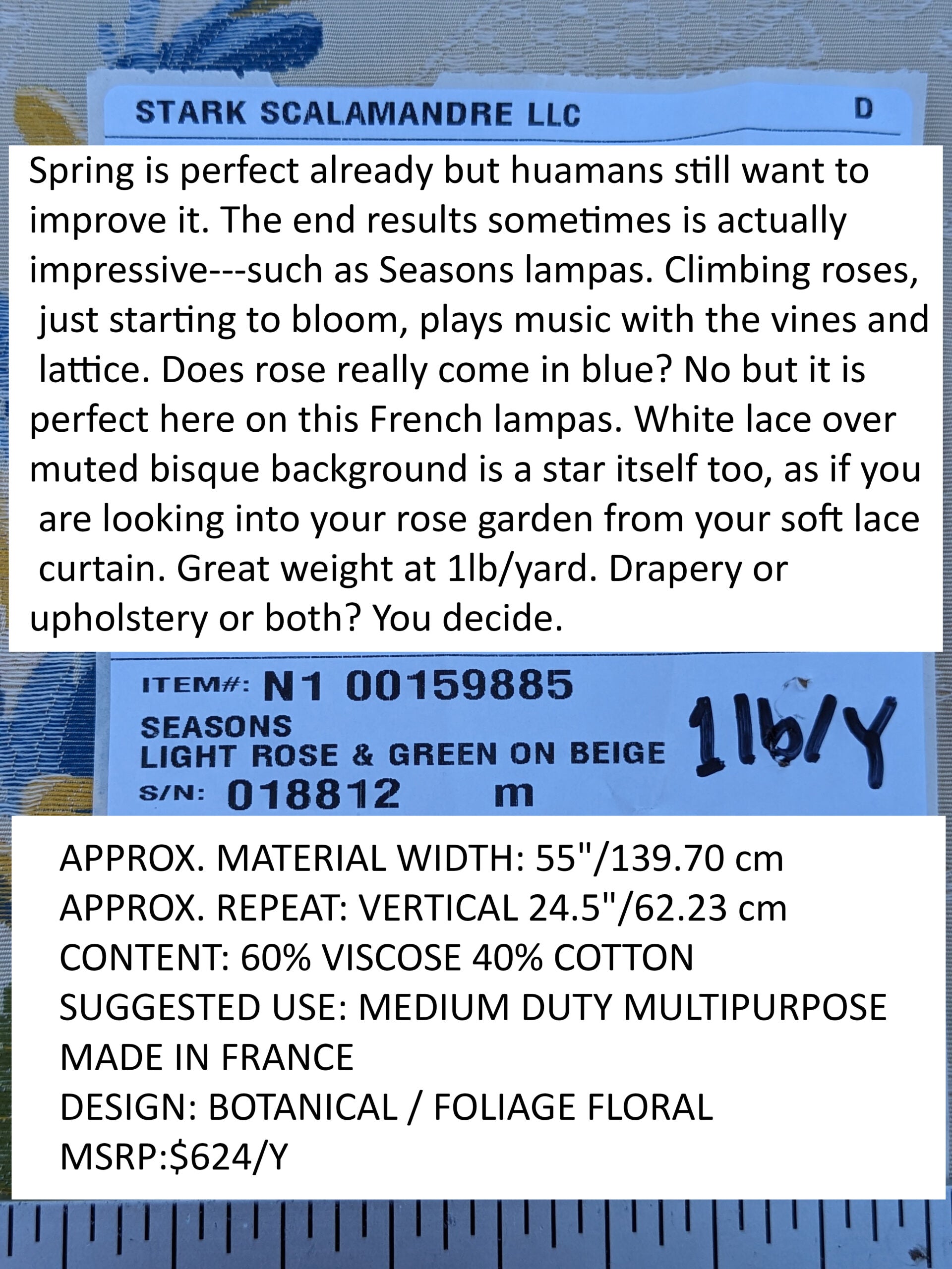 Spring is perfect already but huamans still want to improve it. The end results sometimes is actually impressive---such as Seasons lampas. Climbing roses, just starting to bloom, plays music with the vines and lattice. Does rose really come in blue? No but it is perfect here on this French lampas. White lace over muted bisque background is a star itself too, as if you are looking into your rose garden from your soft lace curtain. Great weight at 1lb/yard. Drapery or upholstery or both? You decide.