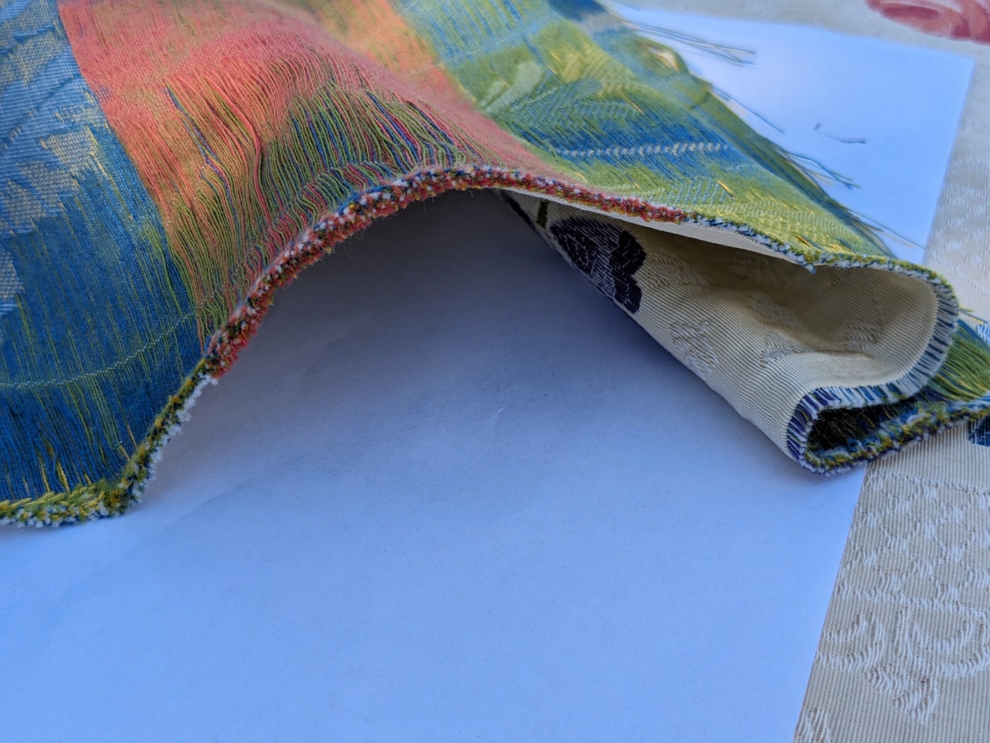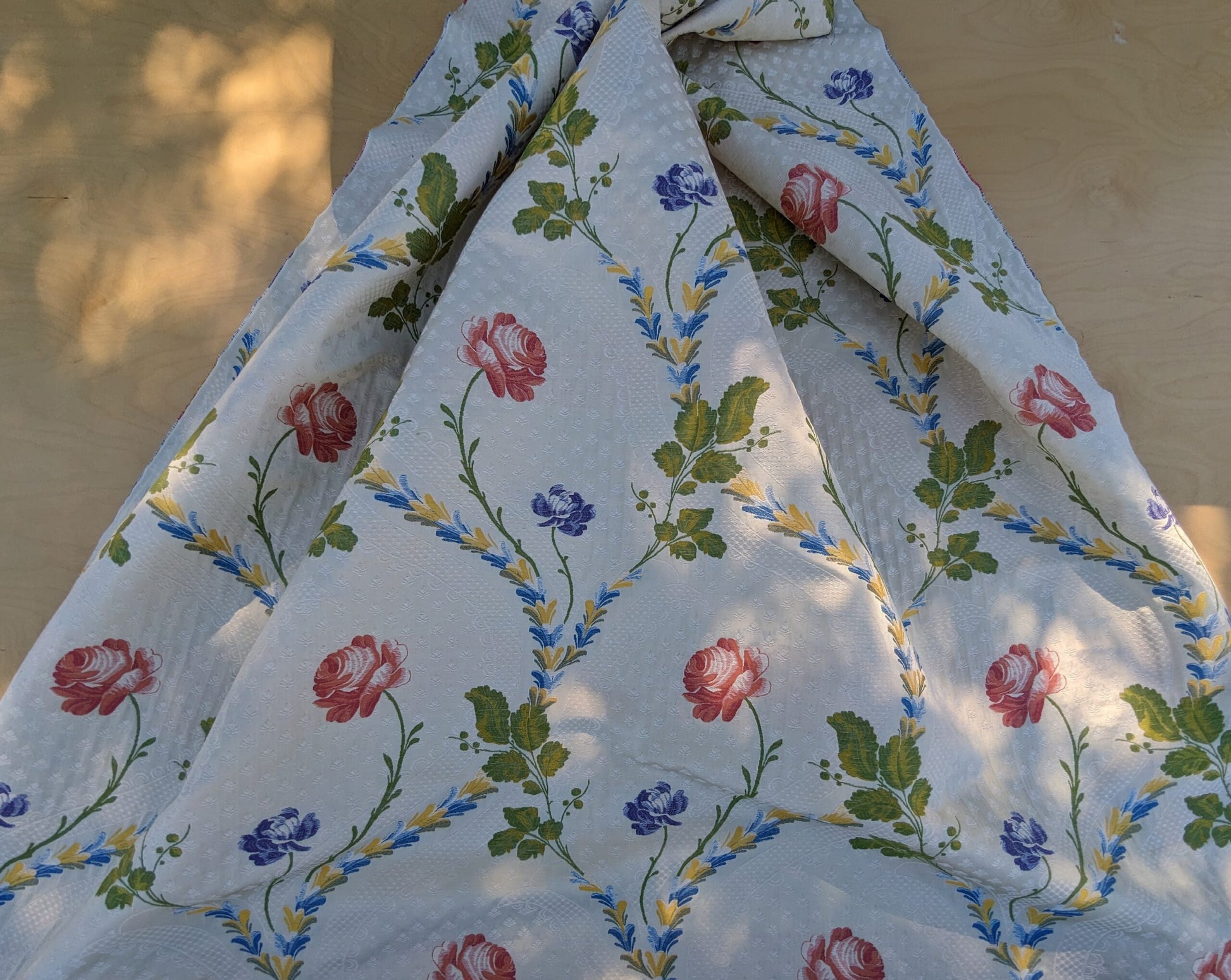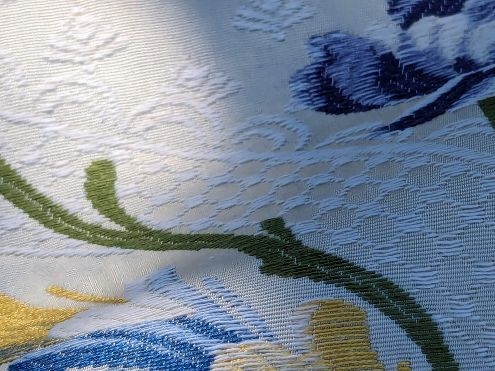 Spring is perfect already but huamans still want to improve it. The end results sometimes is actually impressive---such as Seasons lampas. Climbing roses, just starting to bloom, plays music with the vines and lattice. Does rose really come in blue? No but it is perfect here on this French lampas. White lace over muted bisque background is a star itself too, as if you are looking into your rose garden from your soft lace curtain. Great weight at 1lb/yard. Drapery or upholstery or both? You decide.