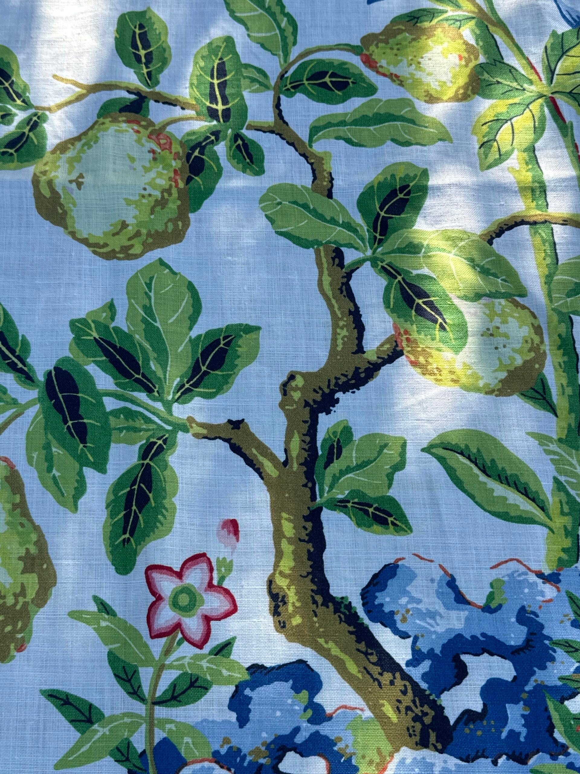 Reproduced from an early twentieth century French block printed cotton, this charming chinoiserie design features a fanciful tree of fruit and flowers, accented by a ribboned basket and butterflies. The three vibrant colorations add to the playful quality of the linen print, in garden-inspired shades of greens paired with crisp grey and white, and dazzling clear hues against white or azure backgrounds.