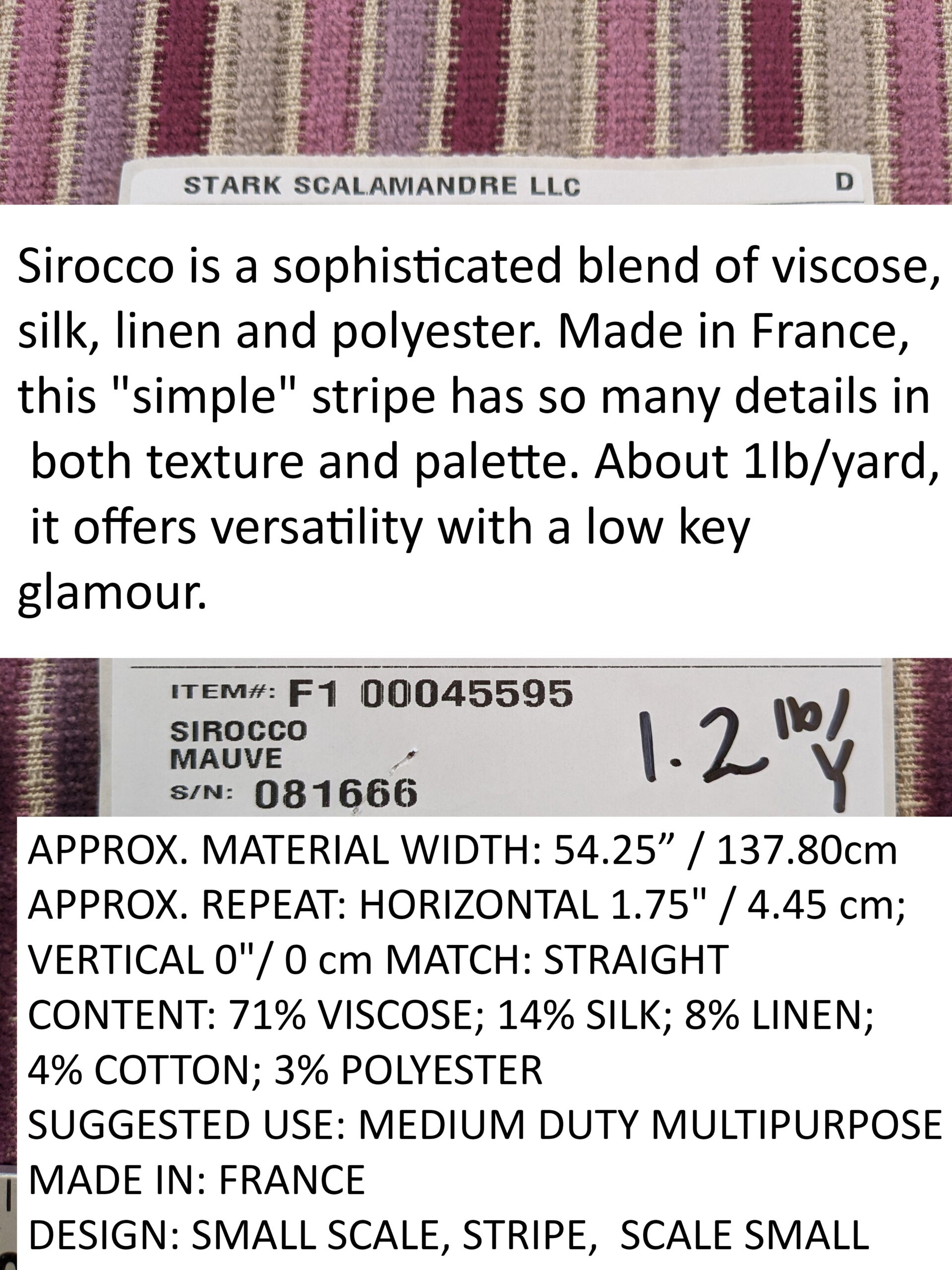 | APPROX. MATERIAL WIDTH: 54.25" / 137.80 cm APPROX. REPEAT: HORIZONTAL 1.75"" / 4.45 cm; VERTICAL 0"" / 0 cm MATCH: STRAIGHT CONTENT: 71% VISCOSE; 14% SILK; 8% LINEN; 4% COTTON; 3% POLYESTER SUGGESTED USE: MEDIUM DUTY MULTIPURPOSE MADE IN: FRANCE DESIGN: SMALL SCALE, STRIPE, SCALE SMALL |