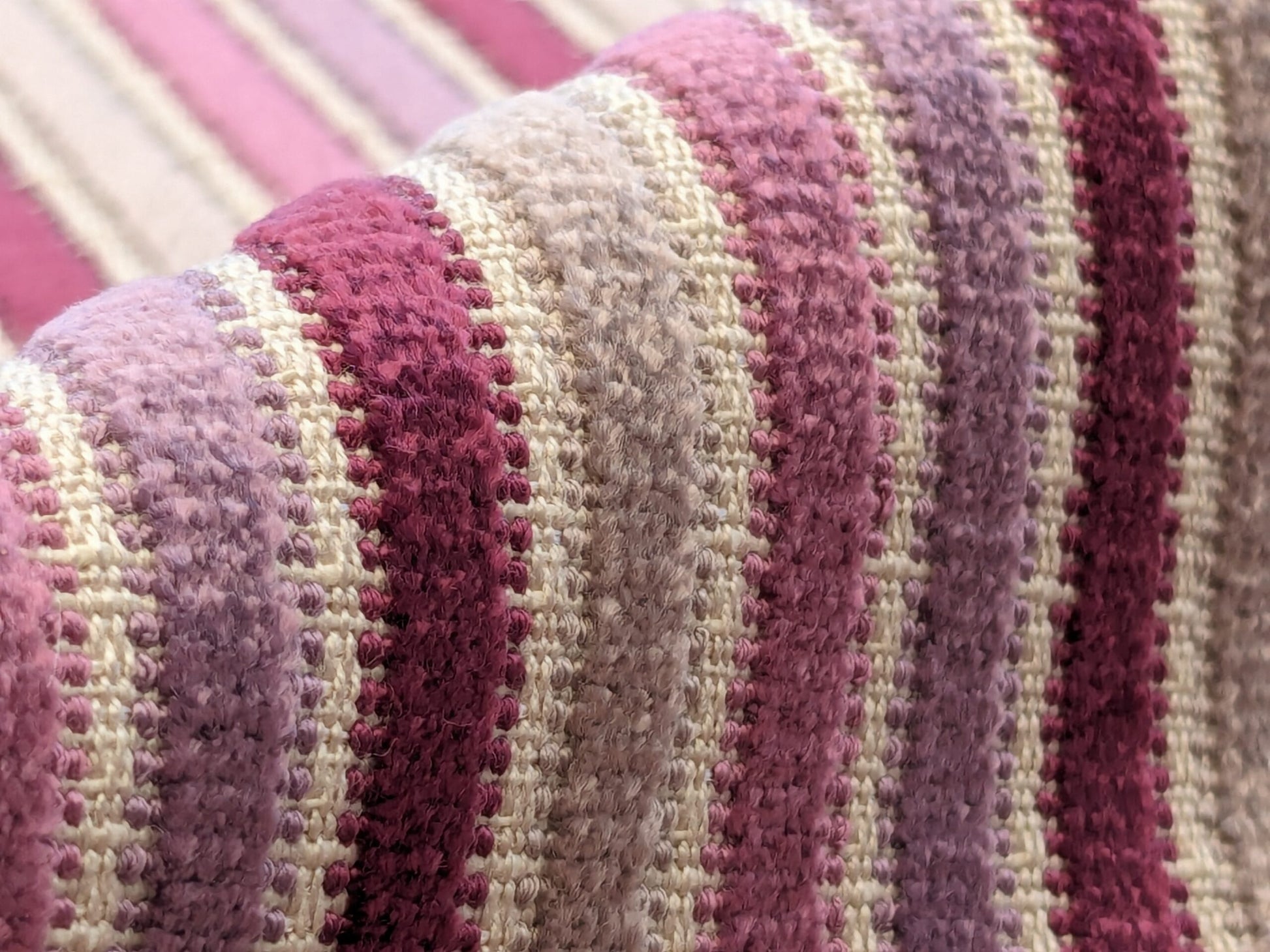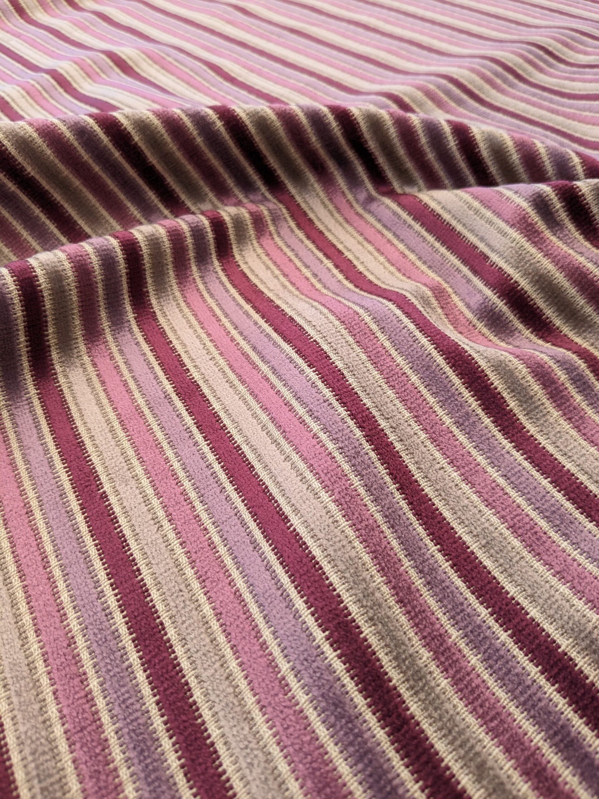 | Sirocco is a sophisticated blend of viscose, silk, linen and polyester. Made in France, this "simple" stripe has so many details in both texture and palette. About 1lb/yard, it offers versatility with a low key glamour. |