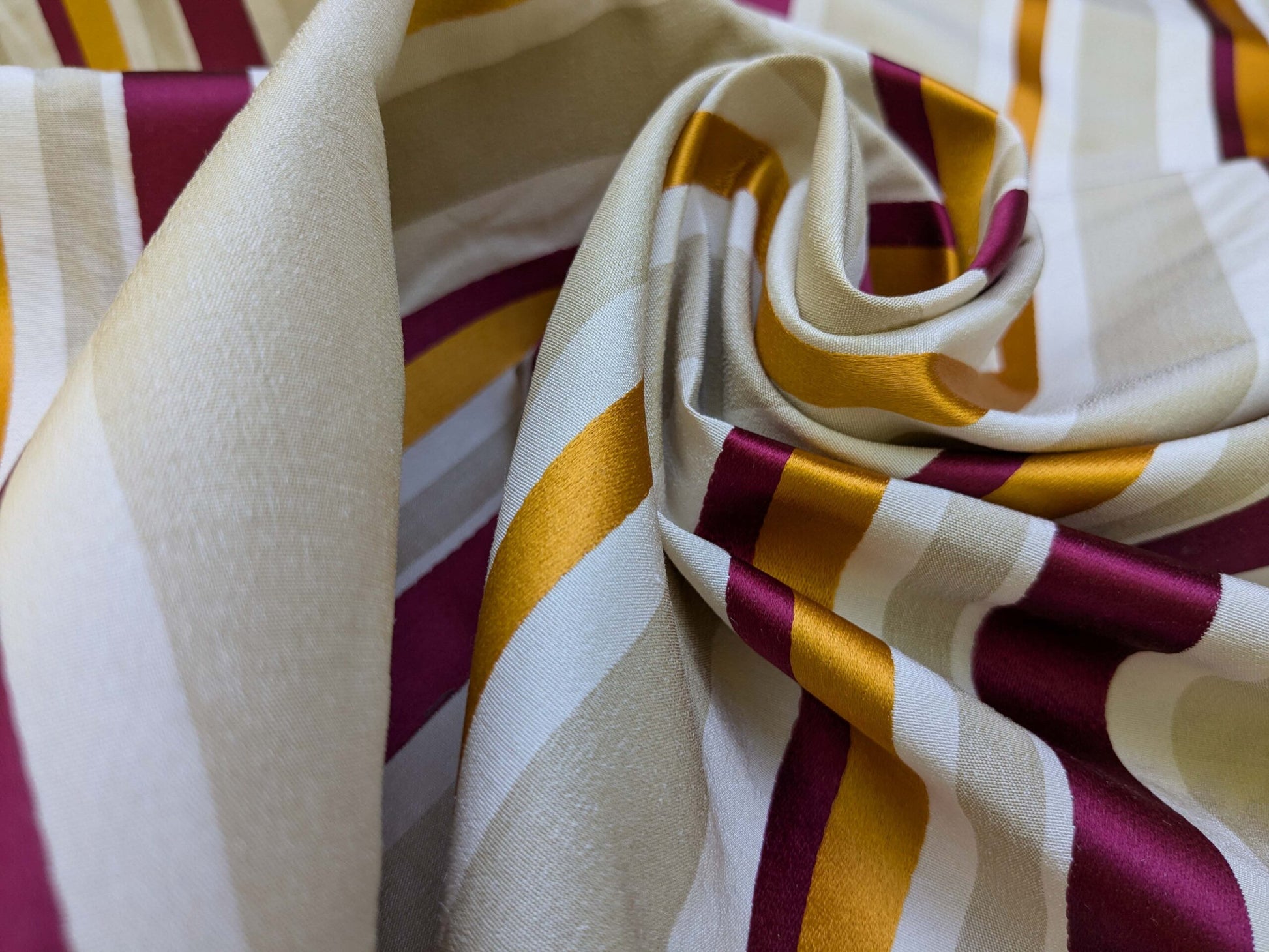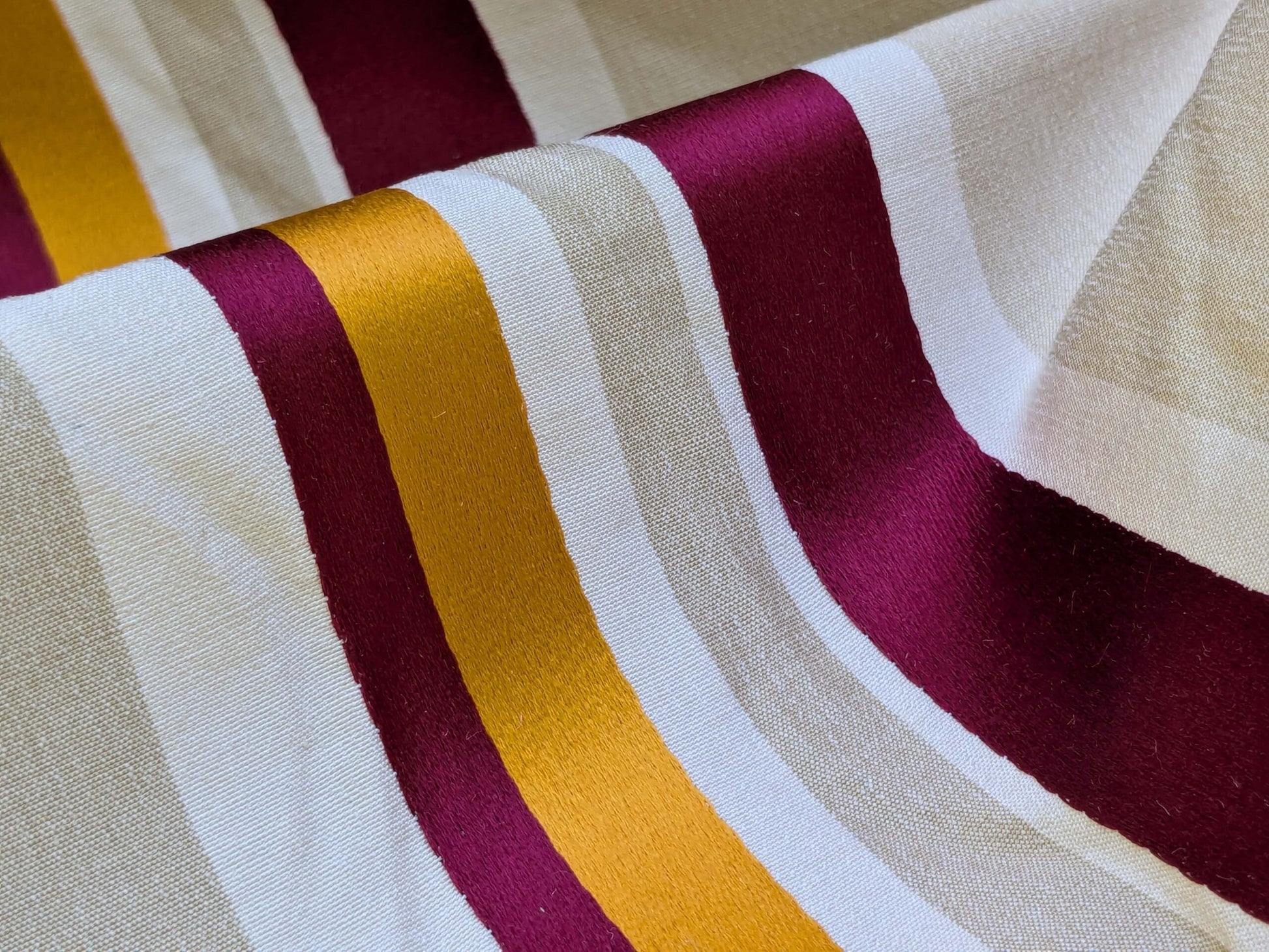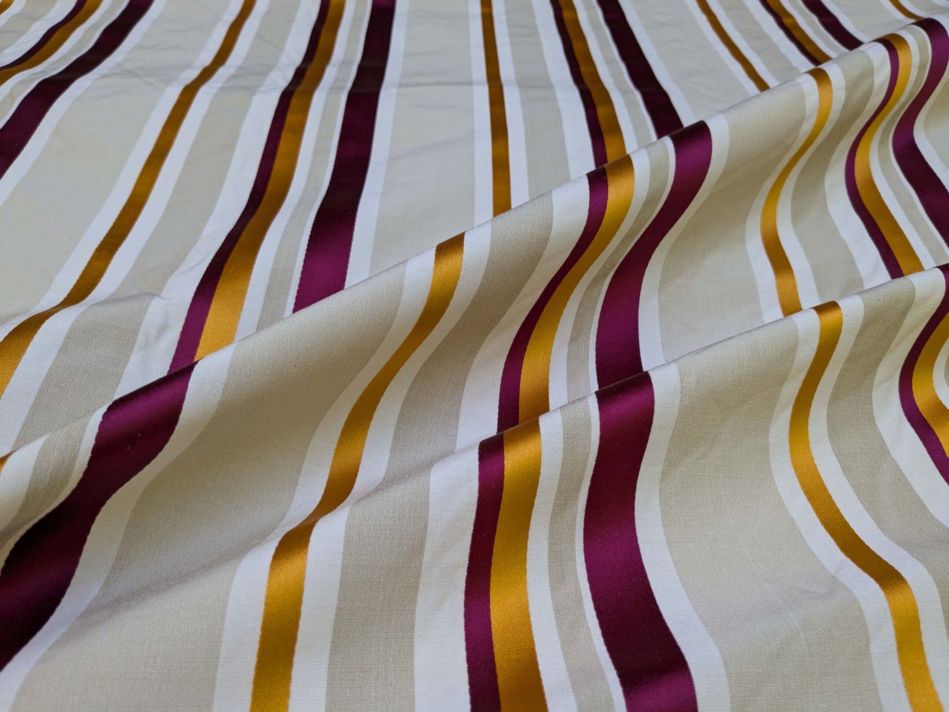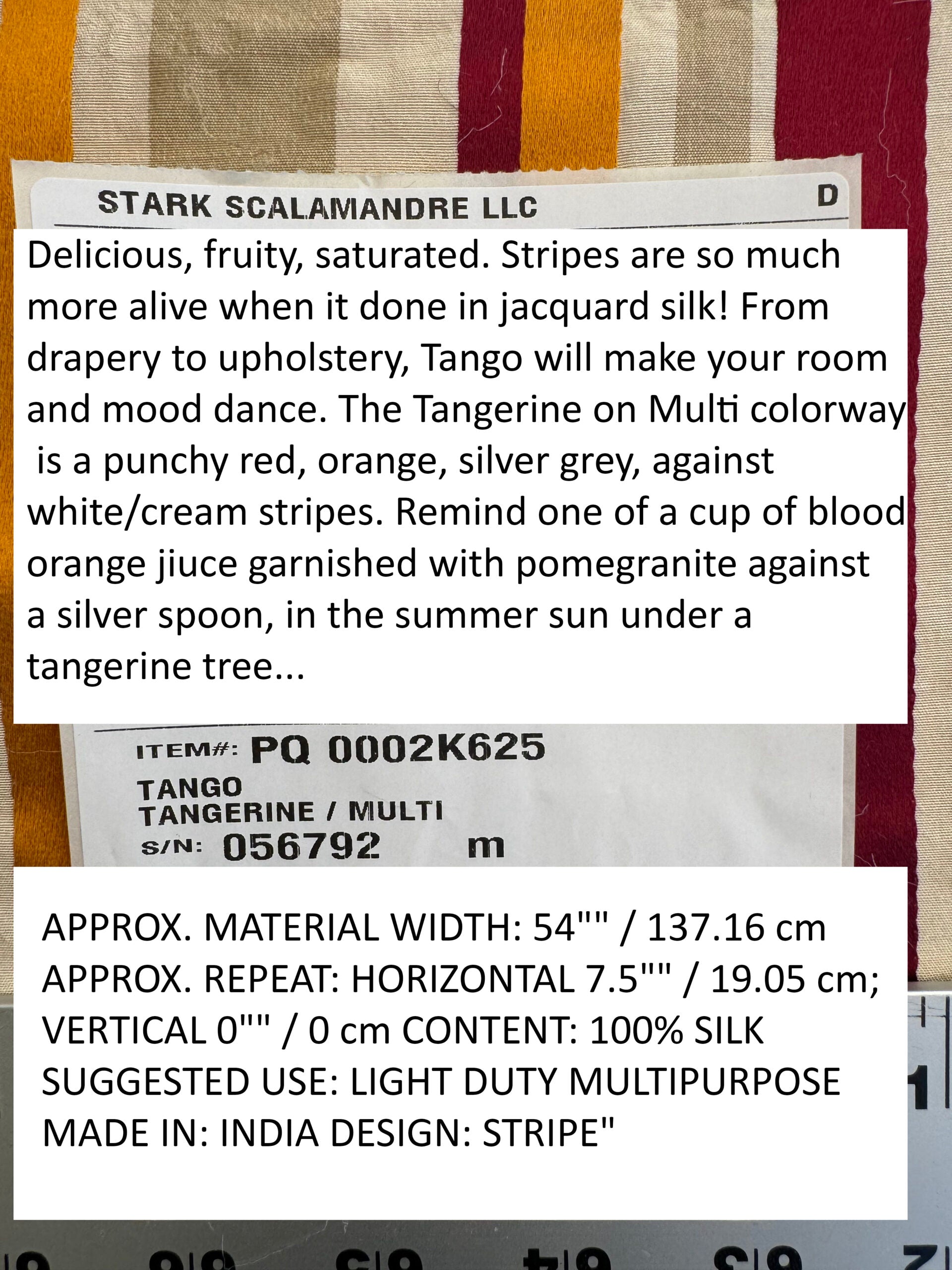 | Delicious, fruity, and saturated. Stripes are so much more alive when done in jacquard silk! From drapery to upholstery, Tango will make your room and mood dance. The Tangerine on Multi colorway is a punchy red, orange, silver grey, against white/cream stripes. Remind me of one cup of blood orange juice garnished with pomegranate against a silver spoon, in the summer sun under a tangerine tree...