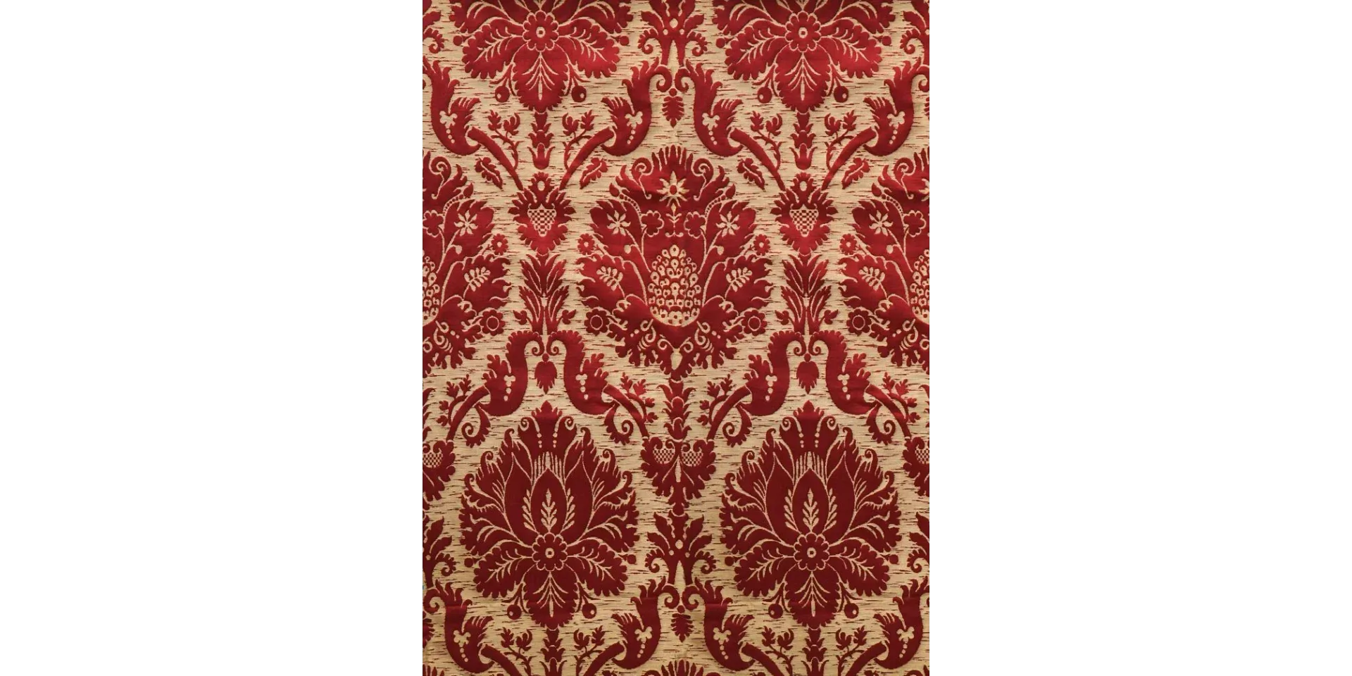 Typical of the Renaissance style, this brocatelle represents a horizontally repeated corolla, with a flowering thistle at the centre. The worn, 'anticato' effect on the linen background with a textured, coloured design shappe silk warp. Cammino means 'path' in Italian, in reference to the way the motif repeats 4 times across the width.