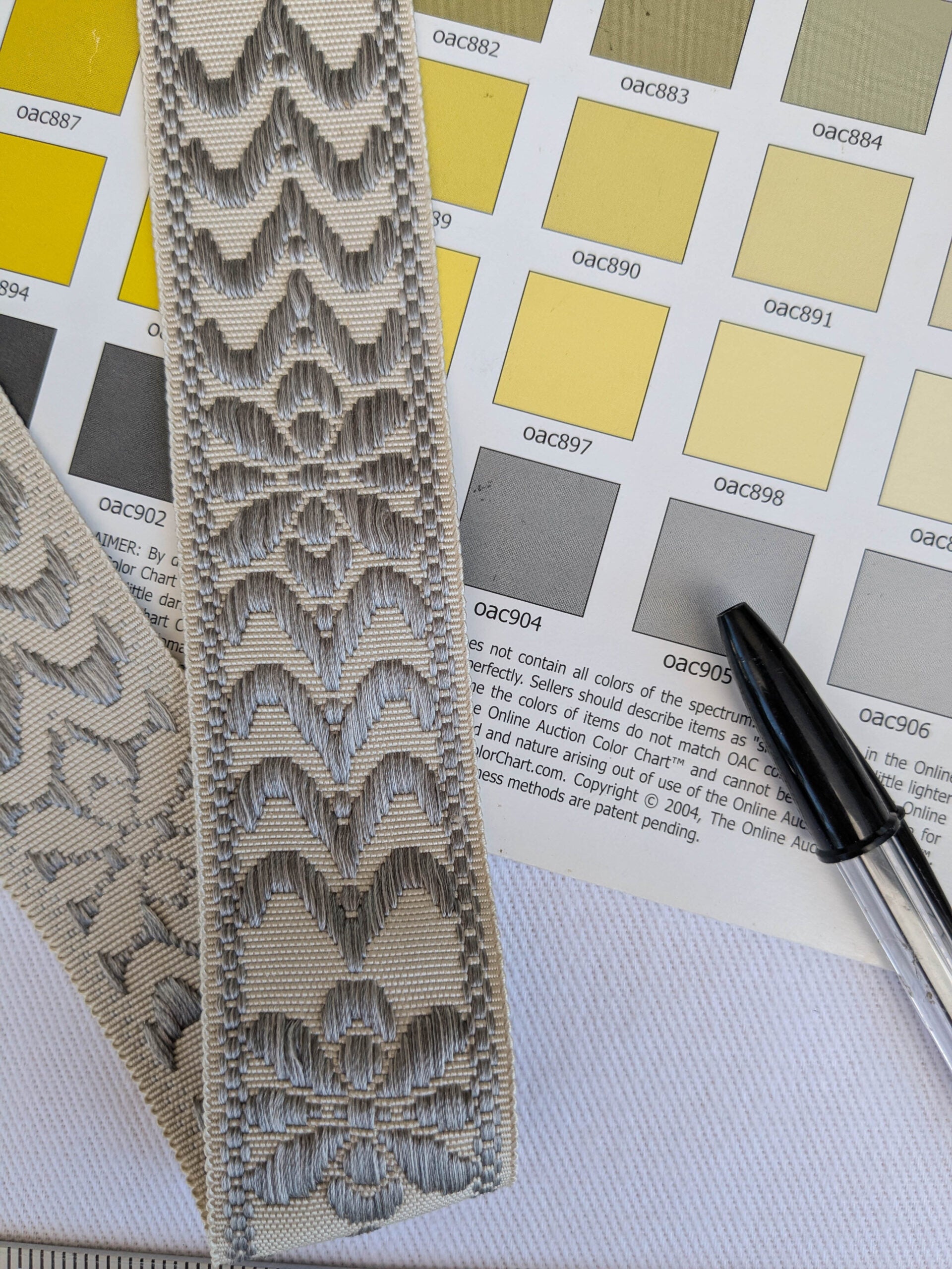 This trim is based on historical trim found in that region. The simple and fluid pattern of daisy or rose blossom surrounded by wave pattern