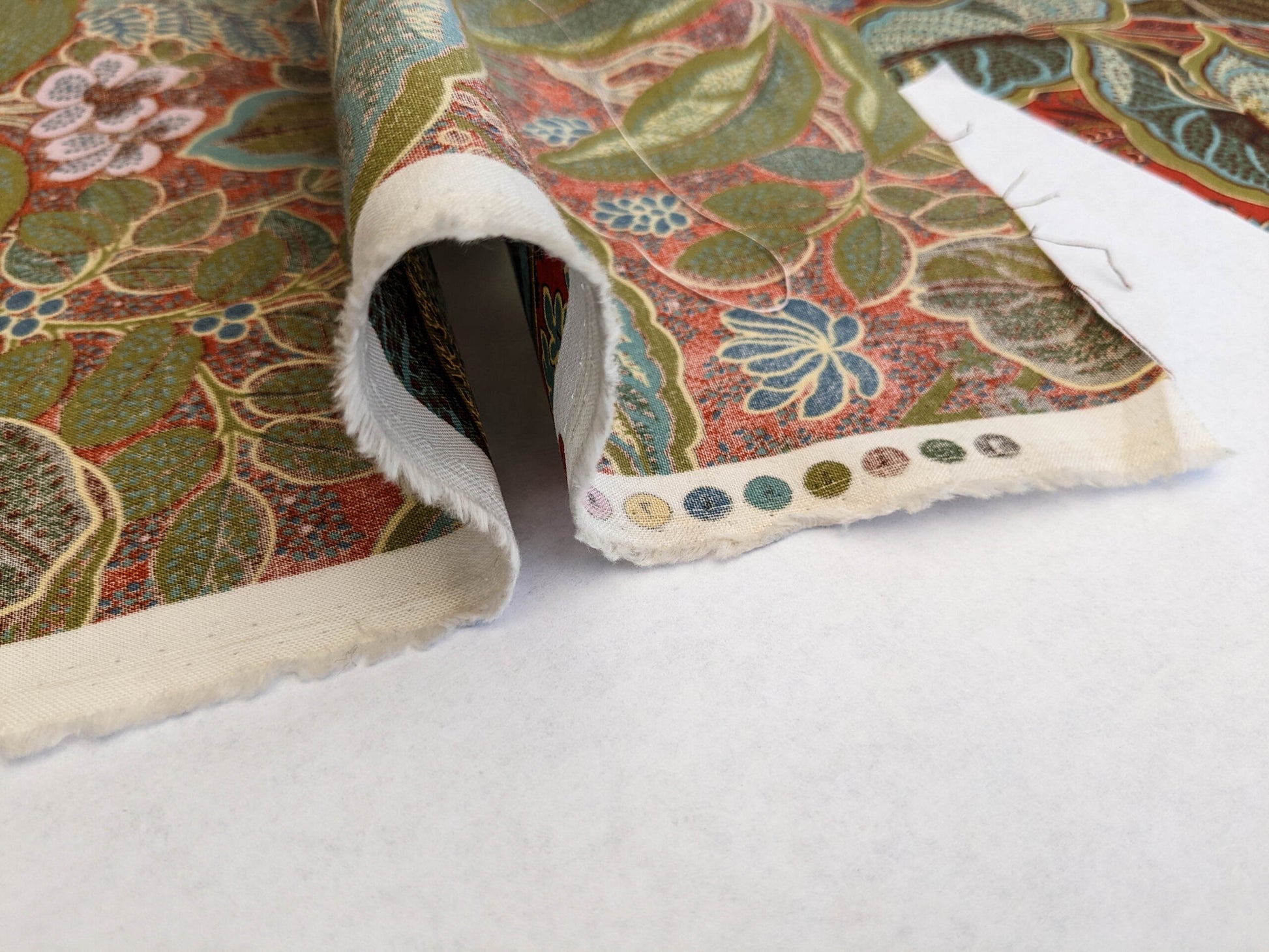 | APPROX. MATERIAL WIDTH: 54" / 137.16 cm APPROX. REPEAT: HORIZONTAL 26.75" / 67.95 cm; VERTICAL 11.5" / 29.21 cm CONTENT: 100% COTTON SUGGESTED USE: MEDIUM DUTY MULTIPURPOSE MADE IN: SWITZERLAND DESIGN: BOTANICAL / FOLIAGE FLORAL SCALE: LARGE MSRP USD364/y |